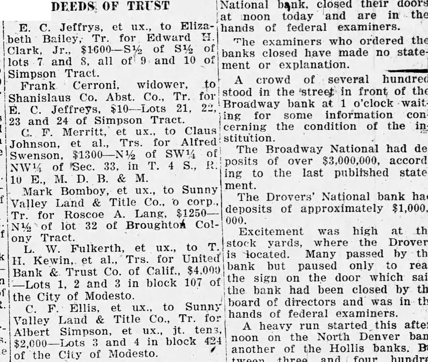 E. C. Jeffrys, et ux., to Eliza- hands of federal examiners. beth Bailey for Edward H. The examiners who ordered the Clark, Jr., $1600-S½ of S1/2 of banks closed have made no statelots and 8. all of 9 and 10 of ment or explanation. Simpson Tract. A crowd of several hundred Frank Cerroni, widower to stood in the street in front of the Shanislaus Co. Abst Co., Tr. for Broadway bank at 1 o'clock waitE. Jeffreys, $10-Lots 21, 22, ing for some information con23 and 24 of Simpson Tract cerning the condition of the inC. Merritt, et ux., to Claus stitution. Johnson, et al., Trs. for Alfred The Broadway National had deposits of over $3,000,000, accordNW1/ of Sec. 33. in T. 4 S., R. ing to the last published state10 E., M. D. B. & M. ment. Mark Bomboy, et ux., to Sunny The Drovers' National bank had Valley Land & Title Co., o corp., deposits of approximately $1,000,Tr. for Roscoe A. Lang. $1250000. N½ of lot 32 of Broughton ColExcitement was high at the Tract stock yards, where the Drovers L. W. Fulkerth, et ux., to T is located Many passed by the H. Kewin, et al., Trs. for United bank but paused only to read Bank & Trust Co. of Calif., $4,000 the sign on the door which said -Lots 1, 2 and 3 in block 107 of the bank had been closed by the the City of Modesto. board of directors and was in the F. Ellis. et ux., to Sunny hands of federal examiners. Valley Land & Title Co., Tr. for A heavy run started this afterAlbert Simpson, et ux., jt. tens, noon on the North Denver bank 3 and 4 in block 424 another of the Hollis banks. Beof the City of Modesto. tween three and four hundred
