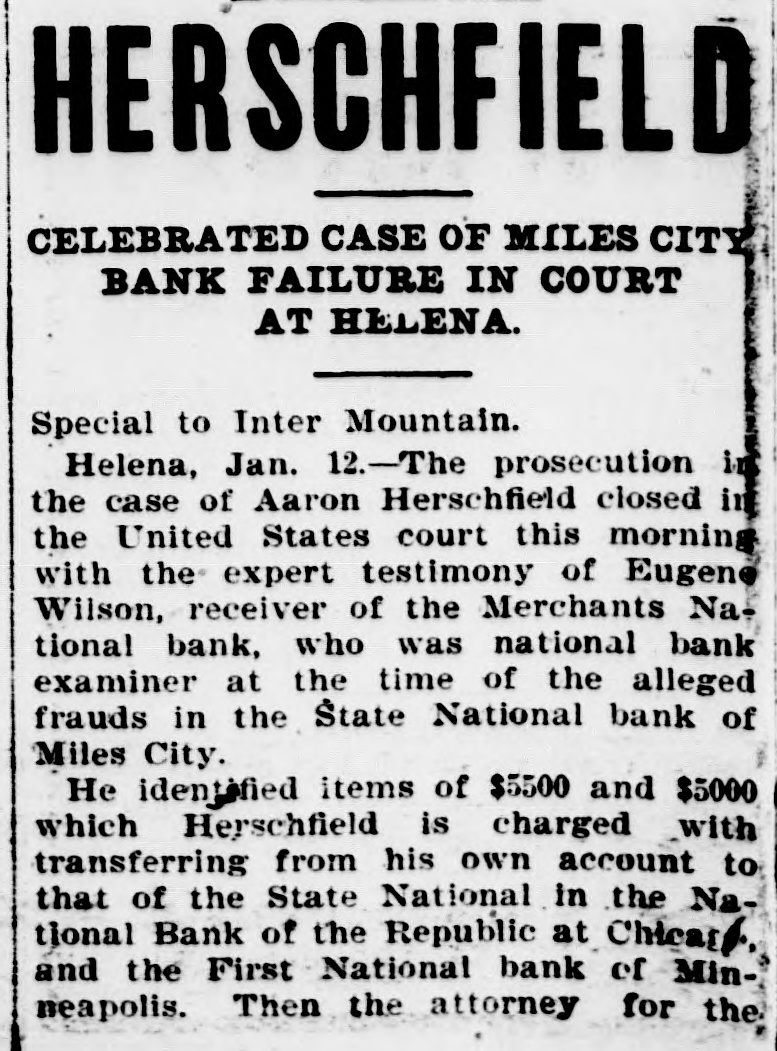 # HERSCHFIELD CELEBRATED CASE OF MILES CITY BANK FAILURE IN COURT AT HELENA. Special to Inter Mountain. Helena, Jan. 12.-The prosecution in the case of Aaron Herschfield closed in the United States court this morning with the expert testimony of Eugene Wilson, receiver of the Merchants National bank, who was national bank examiner at the time of the alleged frauds in the State National bank of Miles City. He identified items of $5500 and $5000 which Herschfield is charged with transferring from his own account to that of the State National in the National Bank of the Republic at Chicago, and the First National bank of Minneapolis. Then the attorney for the