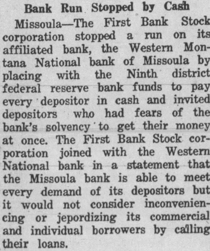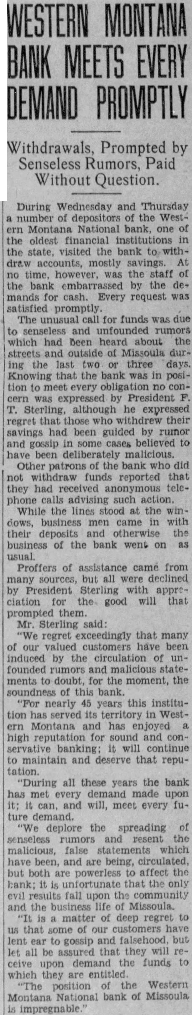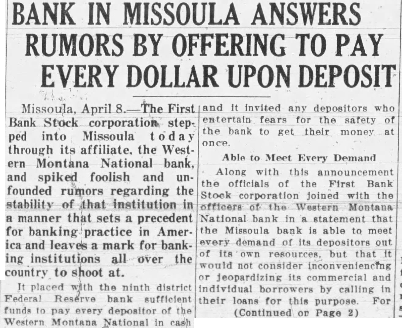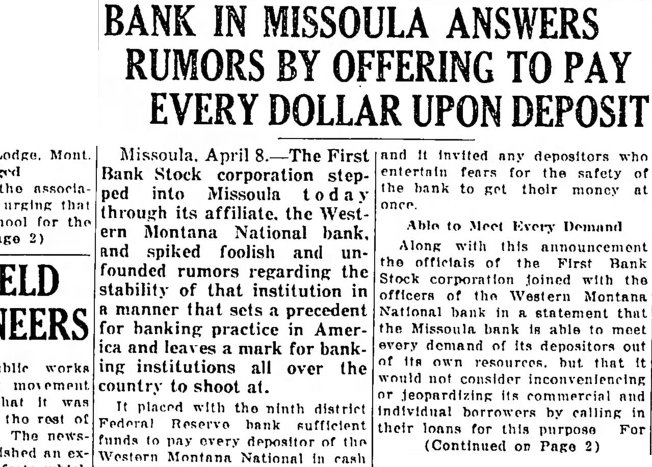David Smith, resident for more than 40 years, wife Smith, druggist, cumbs heart attack. Golfers flock to Community Country courses as weather warms. new members of school board for district will elected today. President Clapp abolishes paddling by Bear Paws State University. Duncan MacDonold celebrates 83 years of life. Quinn and chosen for board of school district Layfield being reelected. Milo Flannery awarded judgment for against M. Felton, alleging injuries received and Johnston reelectmayor, police commissioner, respectively, in election. Alltime record 4,385 votes cast. $33,000 pared from budget school district No. board trustees, to balance decreased income school board will receive for equipment to be placed structure are guests of Fort Missoula garrison Army day ercises. Salaries city employes, including slashed per cent, saving to taxpayannually starts run on Western Montana bank, but every demand met promptly and many depositors return Three million dollars placed disposal bank by Federal of of new school first floor poured. Plans State University alumni reunion in June under Gisborne, Gisborne, dug from beneath cave-in of tunnel leading house, uninjured. Thomas high school senior, takes place in national newspaper contest. Charles Weber Elks here. settlers concerned $182,000 for irrigation project, appeal items reinstated. Merhar Ford Smith fight draw battle for state title Eddie Krause easy winnerat Butte, defending welter Jimmy Dupuis knocked out by Dixie Lahood. Arnold chosen chairman board of trustees for school Rock charged with operating dance Sunday Chest for begun all parts Many candidates filing county arrested following fort epidemic of false salary effective May despite protests taxpayers save much. are burned. three seriously, blaze Ernest Lacasse Injured are Mr. Harry, George Sutton, Ennis, Claude Roney Arthur Quinn, latter two firemen. Blaze clothes bathtub. South Side, entering while occupants are Reeves Lincoln school contest and eligible to enter finals. Junior players are Hell Legion banquet and service promise support during footboll team in regulation game between squads shows strength, profor of Mr. and Mrs. Albert Rochkilled near Polson when hits pole. Jack Robinson, with him, injured. chest drive passes half-way Lewandowski coach basketball, Harry Adams, track, University, to replace Stewart 27-High school board prepares economy program save $14,000. Maude Adams and Otis Skinner "Merchant of Venice." 28-Many Missoulians appointed volunteer fire wordens in effort curb forest blazes during coming Burglars get $120 from trunk home Jimmy Stinger. 29-Community chest "mop-up" campaign opens. Emerson Stone chosen head of Missoula alumni of State Pyle, once manager of Billy Kelly Red Grange, stops here. 30-Corvallis captures county trackmeet.