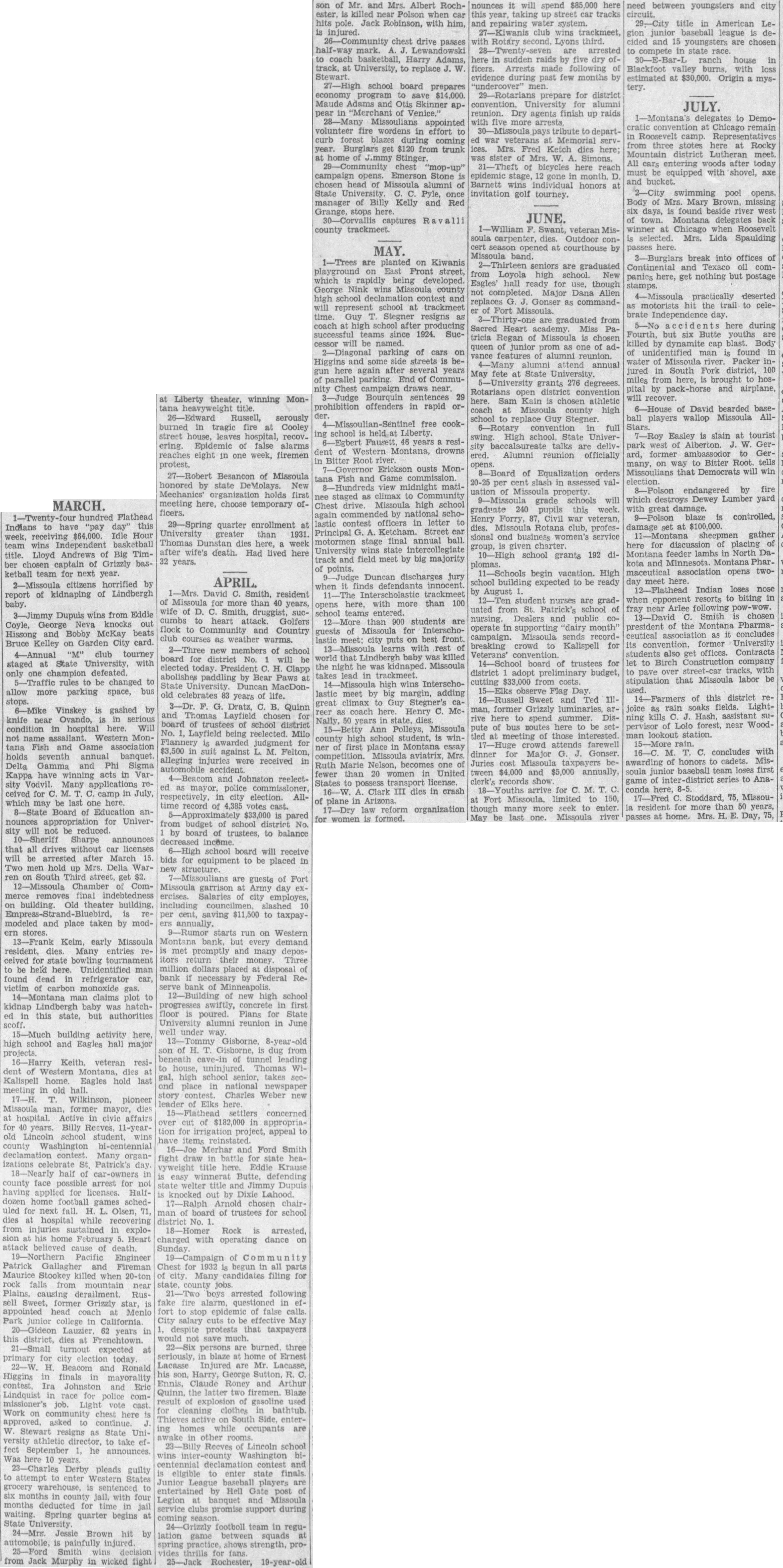 MARCH. hundred Flathead Indians to have "pay this $64,000. Idle Hour week, team wins title. Lloyd Andrews of Big Timber chosen captain of Grizzly basketball team for next year. 2-Missoula citizens horrified by report of kidnaping of Lindbergh baby. 3-Jimmy Dupuis wins from Eddie Coyle, George Neva knocks out Hissong and Bobby McKay beats Bruce Kelley on Garden City card. 4-Annual "M" club tourney staged at State with one defeated. rules to be changed allow more parking space, bus 6-Mike Vinskey is gashed knife Ovando, condition in hospital here. Will not name Western Montana Fish and Game association holds seventh annual banquet. Delta Gamma and Phi Sigma Kappa winning acts in Varsity Vodvil. applications ceived for camp in July, which may be last one here. Board nounces appropriation University be reduced. 10-Sheriff Sharpe announces that all drives without car licenses will arrested after March 15. Two men hold up Mrs. Delia Waron South Third street, get 12-Missoula Chamber Commerce removes final indebtedness building. Old theater building, modeled and place taken by modstores. early Missoula resident, dies. Many entries ceived for state bowling tournament be held here. Unidentified man found dead in refrigerator car, carbon claims kidnap Lindbergh this state, but authorities scoff. 15-Much building activity here, high school Eagles hall projects. 16-Harry veteran resiof Kalispell home. Eagles hold last meeting old hall. 17-H. Wilkinson, pioneer Missoula man, former dies hospital. Active civic for years. Billy Reeves, old Lincoln school wins county Washington contest. Many izations Patrick's half county face arrest for for licenses. Halfdozen home games uled for next fall. Olsen, dies recovering from sustained explosion his home February Heart believed death. 19-Northern Pacific Engineer Patrick Gallagher Fireman Maurice Stookey killed when mountain near causing derailment. RusSweet, Grizzly star, appointed coach Park junior college in California years in district, dies at Frenchtown. 21-Small turnout expected primary election today. H. Beacom and Ronald Higgins finals Ira Johnston Eric Lindquist race for police commissioner's Light cast. Work on chest here approved, asked continue. Stewart resigns State versity athletic director, to take fect September he announces. here 10 years. Derby pleads guilty attempt Western grocery warehouse, sentenced six months county jail. with four months deducted time in waiting. Spring quarter begins State University. 24-Mrs. Jessie Brown hit by automobile, painfully injured. Smith Jack Murphy in wicked
