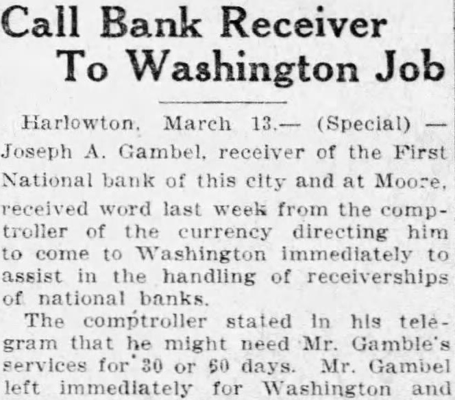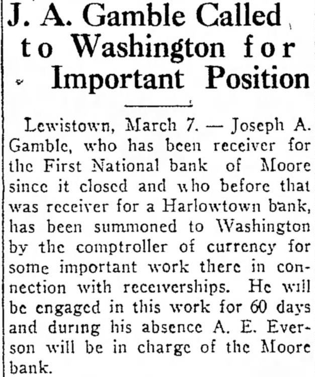 Gamble Called Washington Important Position Lewistown, March Gamble, who has been receiver the First National bank of Moore since closed and before that receiver for Harlowtown bank, has been summoned to Washington by the comptroller of currency for some important work there in connection with receiverships. He will be engaged in this work for days and during his absence Everson will be in charge of the Moore bank.
