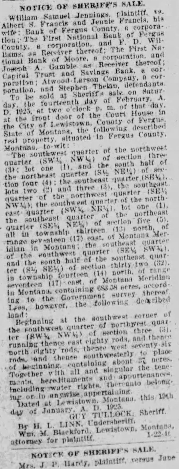 NOTICE OF SHERIFFS SALE. William Samuel Jennings. plaintiff. V8. Albert S. Francis and Jennie Francis, bis wife: Bank of Fergus County. a corporation; The First National Bank of Fergus llams. as Receiver thereof: The First Na. tional Bank of Moore. a corporation. and Joseph Gamble Receiver thereof; Capital Trust and Savings Bank. a cor. poration Atwood Larson Company. a cor poration. and Stephen Thelan, defendants. To be sold at Sheriff's on Saturday the fourteenth day of February, D. 1923, at two o'clock p. m. of that day. in at the front door of the Court House the City Lewistown, County of Fergus, State of Montana, the following described real property. situated in Fergus County. Montuna. The southwest quarter of the northwest quarter (SW% NWN) of section three (3); lot one (1). and the south half of see of the northeast quarter (S% NEW) tion four (4): the southeast quarter (SE%). lots two (2) and three (3), the southeast quarter of the northwest quarter (SEV) NWM) the southwest quarter of the north (1), east quarter (SWV NEW). lot one the southeast quarter of the northeast (5). quarier (SE% NEW of section five all in township thirteen north, Mer- of range seventeen (17) the east. southeast of Montana quarter of idian the In southwest Montana: quarter (SEM SW4). and the south half of the southeast quarter (S1g SEM) of section thirty two (32). in township fourteen (14) north. of range seventeen (17) cast of Montana Meridian ing to the Government survey thereof Lees, however, the following described land Beginning at the southwest corner of southwest quarter of northwest quar the (8WV NW%) of section three (3). ter running thence east eighty rods, and thence six north eighty rods, thenee west seventy rods. and thenee southwesterly to place of beginning. containing about 37 neres. Together with all and singular the tene Dated at Lewistown. Montana, 1925 this 19th By H. L. LINN. Undersberiff. attorney for plaintiff. NOTICE OF SHERIFF'S SALE. Mrs. Hardy, plaintiff. versus June