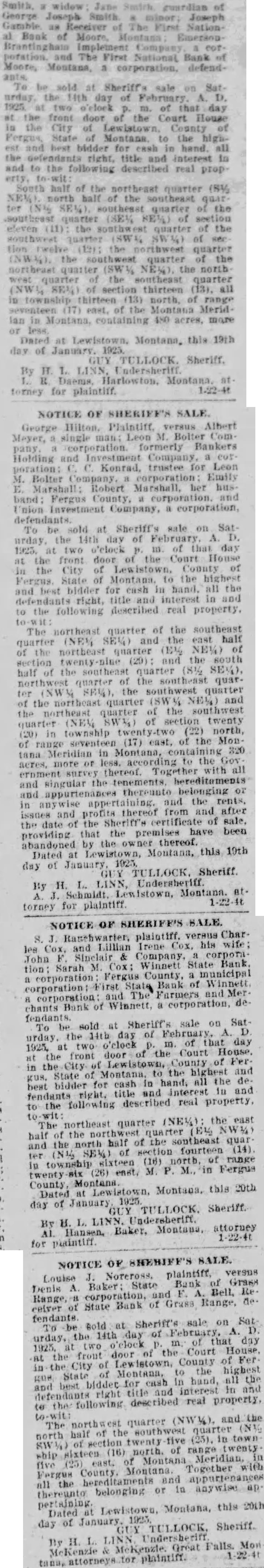 George Joseph Smith * minor; Joseph Gamble as Receiver of The First NationBrantingham Implement Company corporation. and The First National Bank of Moore, Montana, a corporation. defendTo be sold at Sheriff's sale on Saturday, the 14th day of February. A. D. 1925. at two o'elock p. m. of that day at the front door of the Court House the City of Lewistown, County of Fergus, State of Montana to the highest and best bidder for cash in hand. all the right, title and interest in and to the following described real propSouth half of the northeast quarter (8% NEW) north half of the southeast quar ter (N½ SE%), southeast quarter of the southeast quarter (SEV NEW) of section eleven (11): the southwest quarter of the southwest quarter (SW NW %) of sec tion twelve (19); the northwest quarter (NW), the southwest quarter of the northeast quarter (SW% NEW), the north weat quarter of the southeast quarter (NWW) SEM) of section thirteen (13), all in township thirteen (13) north, of range seventeen (17) east. of the Montana Meridlan in Montana, containing 480 acres, more or Dated at Lewistown. Montana, this 19th day of January. 1925. GUY TULLOCK. Sheriff. torney for plaintiff. NOTICE OF SHERIFF'S SALE. George Hilton. Plaintiff. versus Albert Meyer, a single man; Leon M. Bolter Company a corporation. formerly Bankers Holding and Investment Company, a corporation: C. C. Konrad, trustee for Leon M. Bolter Company. corporation Emily Marshall: Robert Marshall, her husband: Fergus County, a corporation. and Union Investment Company, a corporation, defendants. To be sold at Sheriff's sale on Saturday, the 14th day of February A. D. 1923. at two o'clock P. m. of that day at the front door of the Court House the City of Lewistown, County of Fergus. State of Montana. to the highest and best bidder for cash in hand. all the defendants right, title and interest in and to the following described real property. The northeast quarter of the southeast quarter (NEW SEV) and the east half of the northeast quarter (E% NEW) of section twenty-nine (29): and the south half of the southeast quarter (81/2 SEV), northwest quarter of the southeast quarter (NWM) SEV). the southwest quarter of the northeast quarter (SWV) NE%) and the northeast quarter of the southwest quarter (NEV SW%) of section twenty (20) in township twenty-two (22) north, of range seventeen (17) east, of the Montana Meridian in Montana, containing 320 acres, more OF less, according to the Gov ernment survey thereof. Together with all and singular the tenements. hereditaments and appurtenances thereunto belonging or in appertaining. and the rents, issues and profits thereof from and after the date of the Sheriff's certificate of sale, providing that the premises have been abandoned by the owner thereof. Dated at Montana, this 19th day of GUY TULLOCK. Sheriff. By H. L. LINN, Undersheriff. A. J. Schmidt. Lewistown, Montana. at. torney for plaintiff. NOTICE OF SHERIFF'S SALE. S. J. Ranehwarter, plaintiff. versus Charles Cox, and Lillian Irene Cox, his wife; John Sinclair & Company, a corporation: Sarah M. Cox: Winnett State Bank. a corporation: Fergus County, a municipal corporation: First State Bank of Winnett corporation and The Farmers and Mer. chants Bank of Winnett, a corporation, defendants. To be sold at Sheriff's sale on Saturday the 14th day of February, A. D 1925, at two o'clock D. m. of that day at the front door of the Court House. in the City of Lewistown, County of Fer. gus, State of Montana, to the highest and best bidder for cash In hand, all the defendants right, title and interest in and to the following described real property, The northeast quarter (NE%): the east half of the northwest quarter (E½ NWM) and the north half of the southeast quar ter SEM) of section fourteen (14). in township sixteen (16) north, of range twenty (26) east, M. P. M., in Fergus Dated at Lewistown. Montana, this 20th day of January GUY TULLOCK. Sheriff. By H. L. LINN. Undersberift. AL Hansen, Baker, Montana, attorney 1-22-40 NOTICE OF SHEHIFF'S SALE. Louise J. Noreross. plaintiff, versus Denis A. Baker: State Bank of Grass ceiver of State Bank of Grass Range, defendants. To Bold at Sheriff's sale on Saturday, the 14th day of February, A. D. 1925. at two o'clock D. m. of that day the front door of the Court House. in the City of Lewistown, County of Fer gue, State of Montana, to the highest and best biddet for cash In hand, all the defendants right title and interest in and to the following described real property, to-wit: The northwest quarter (NWM), and the north half of the southwest quarter (N½ SW% of section twenty five (25), in town ship sixteen (16) north. of range twenty five (25) east. Montana Meridian. Forgus County. Montana. Together with all the hereditaments and appurtenances thereunto belonging or in anywise ap pertaining. Dated Lewistown, Montana, this 20th day of January GUY 1923. TULLOCK. Sheriff. By H. L. LINN Undersheriff McKenzie & McKenzle. Great Falls. Mon
