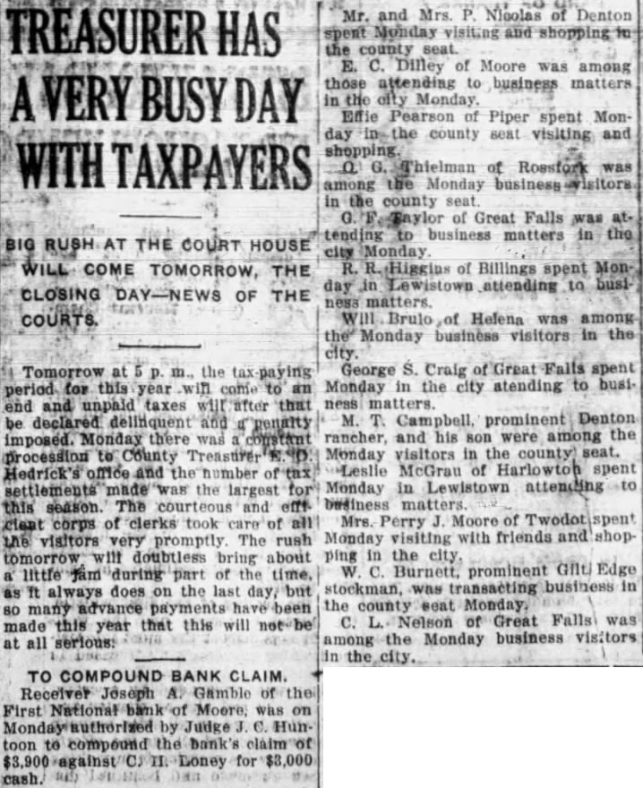 TREASURER HAS A VERY BUSY DAY WITH TAXPAYERS BIG RUSH AT THE COURT HOUSE WILL COME TOMORROW, THE CLOSING DAY-NEWS OF THE COURTS. Tomorrow at m. the tax paying period. for this year will come to an end and unpaid taxes will after that be declared delinquent and 4 penalty imposed. Monday there was constant procession to County Treasurer Hedrick's office and the of tax settlements made was the largest for this season. The courteous and efffcorps of clerks took care of all the visitors very promptly The rush tomorrow will doubtless bring about a' little Jam during part of the time, as ft always does on the last day, but so many advance payments have been made this year that this will not be all serious: TO COMPOUND BANK CLAIM. Receiver Joseph A. Gamble of the First National bank of Moore. was on Monday authorized by Judge J. C. Huntoon to compound the bank claim of $3,900 against CJ II. Loney for $3,000 cash. Mr. and Mrs. of Denton spent Monday visiting and shopping to the county seat. E. C. Dilley of among those attending to business matters in the city Monday. Effie Pearson of Piper spent Mon day the county seat visiting and a G. Thielman of Rossfork was among the Monday business visitors in the county seat of Great Falls was attending to business matters in the city Monday R. R.Higgins of Billings spent Mon day in Lewistown attending to busi ness Will Brulo of Helena was among the Monday business visitors in the city. George S. Craig of Great Falls spent Monday in the city atending to business matters. M. T. Campbell, prominent Denton rancher, and his son were among the Monday visitors in the county) seat. Leslie McGrau of Harlowton spent Monday in Lewistown attending to business Mrs. Perry J. Moore of Twodotispent Monday visiting with friends and shopping in the W C. Burnett, prominent Gilti Edge stockman, was transacting business in the county seat Monday. C. L. Nelson of Great Falls was among the Monday business visitors in the city