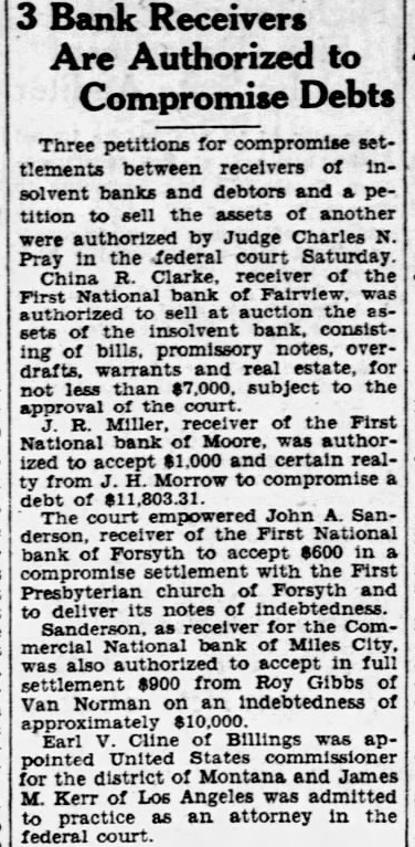 3 Bank Receivers Are Authorized to Compromise Debts Three petitions for compromise settlements between receivers of insolvent banks and debtors and a petition to sell the assets of another were authorized by Judge Charles N. Pray in the federal court Saturday. China R. Clarke, receiver of the First National bank of Fairview. was authorized to sell at auction the assets of the insolvent bank. consisting of bills. promissory notes, overdrafts. warrants and real estate, for not less than $7,000. subject to the approval of court. R. Miller, receiver of the First National bank of Moore, was authorized to accept $1,000 and certain realty from J. H. Morrow to compromise a debt of $11,803.31 The court empowered John A. Sanderson, receiver of the First National bank of Forsyth to accept 8600 in compromise settlement the First Presbyterian church of Forsyth and to deliver its notes of indebtedness. Sanderson. as receiver for the Commercial National bank of Miles City, was also authorized to accept in full settlement $900 from Roy Gibbs of Van Norman on an indebtedness of approximately $10,000. Earl V. Cline of Billings was appointed United States for the district of Montana and James M. Kerr of Los Angeles was admitted to practice as an attorney in the federal court.