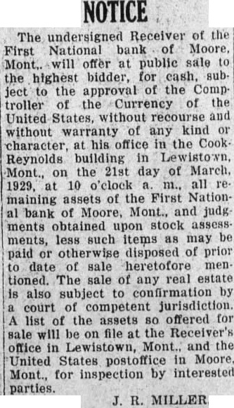 The undersigned Receiver of the First National bank Moore, Mont., offer at public sale to the highest bidder ... on the 21st day of March, 1929 ... all remaining assets of the First National bank of Moore, Mont.