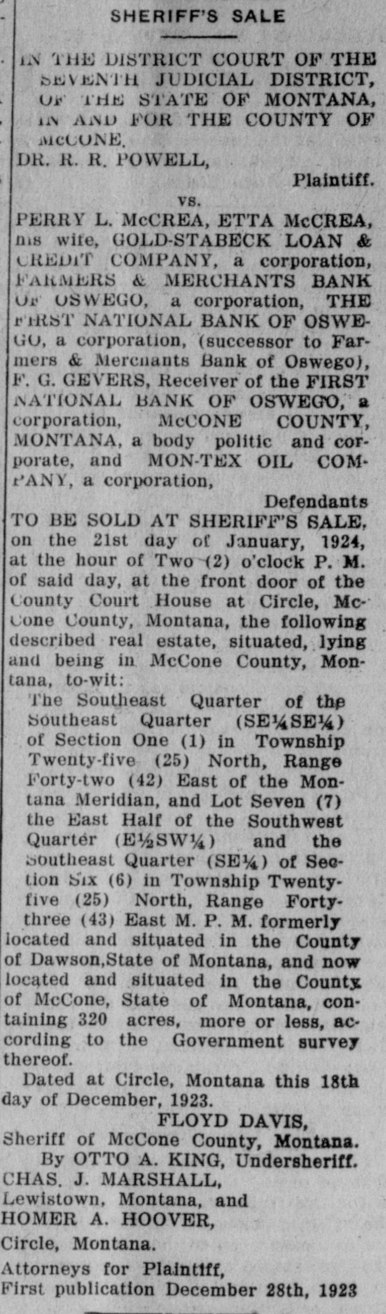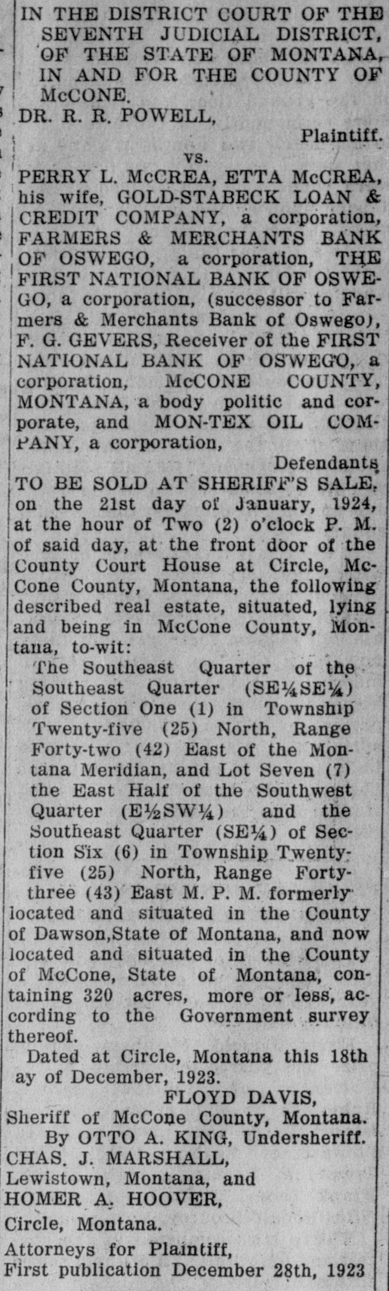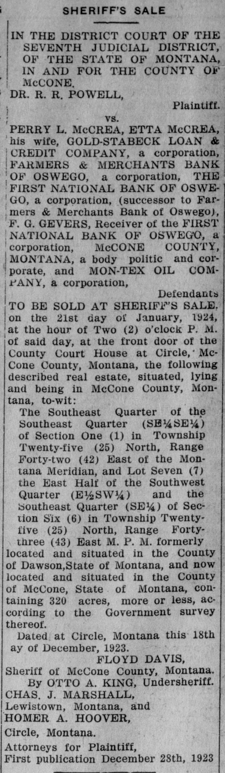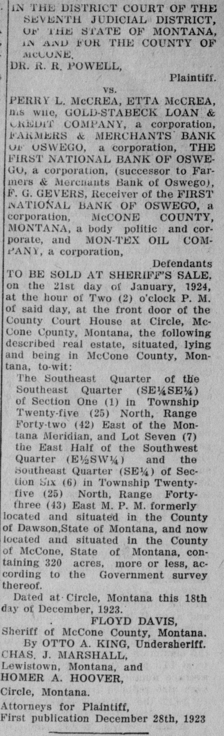 IN THE DISTRICT COURT OF THE SEVENTH JUDICIAL DISTRICT, OF THE STATE OF MONTANA, in AND FOR THE COUNTY OF MCCONE. DR. R. R. POWELL, Plaintiff. vs. PERRY L. McCREA, ETTA McCREA, ms wile, GOLD-STABECK LOAN & CREDIT COMPANY, a corporation, FARMERS & MERCHANTS BANK OF OSWEGO, a corporation, THE FIRST NATIONAL BANK OF OSWEGO, a corporation, (successor to Farmers & Merchants Bank of Oswego), F. G. GEVERS, Receiver of the FIRST NATIONAL BANK OF OSWEGO, a corporation, McCONE COUNTY, MONTANA, a body politic and corporate, and MON-TEX OIL COMPANY, a corporation, Defendants TO BE SOLD AT SHERIFF'S SALE, on the 21st day of January, 1924, at the hour of Two (2) o'clock P. M. of said day, at the front door of the County Court House at Circle, McCone County, Montana, the following described real estate, situated, lying and being in McCone County, Montana, to-wit: The Southeast Quarter of the Southeast Quarter (SE 1/SS 1/4) of Section One (1) in Township Twenty-five (25) North, Range Forty-two (42) East of the Montana Meridian, and Lot Seven (7) the East Half of the Southwest Quarter (E) and the Southeast Quarter (SE 1/4) of Seclion Six (6) in Township Twentyfive (25) North, Range Fortythree (43) East M. P. M. formerly located and situated in the County of Dawson,State of Montana, and now located and situated in the County of McCone, State of Montana, containing 320 acres, more or less, according to the Government survey thereof. Dated at Circle, Montana this 18th day of December, 1923. FLOYD DAVIS, Sheriff of McCone County, Montana. By OTTO A. KING, Undersheriff. CHAS. J. MARSHALL, Lewistown, Montana, and HOMER A. HOOVER, Circle, Montana. Attorneys for Plaintiff, First publication December 28th, 1923
