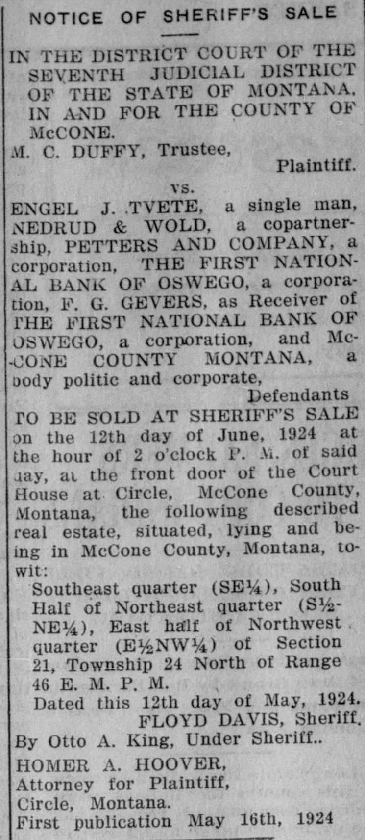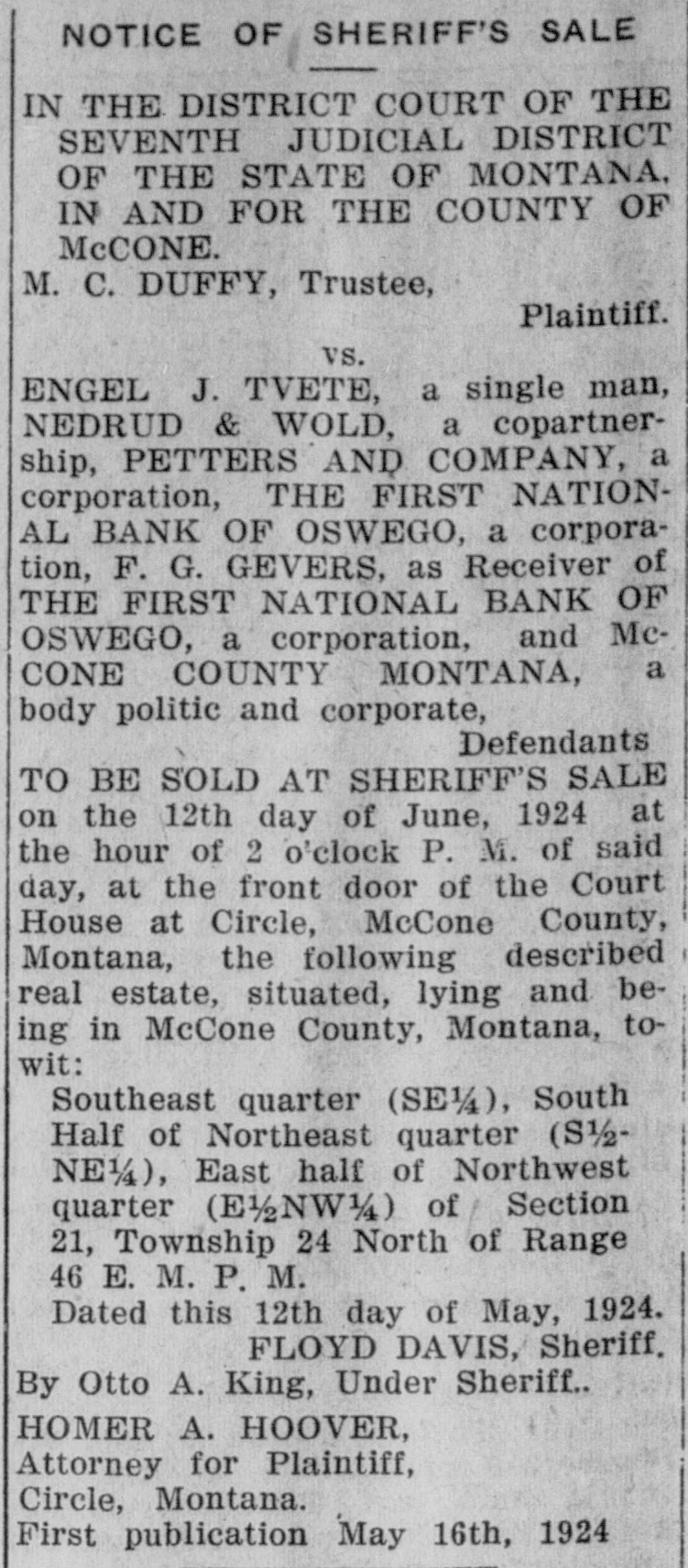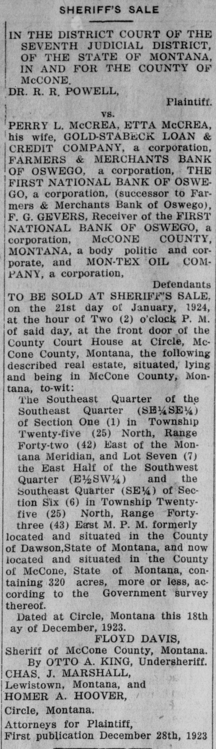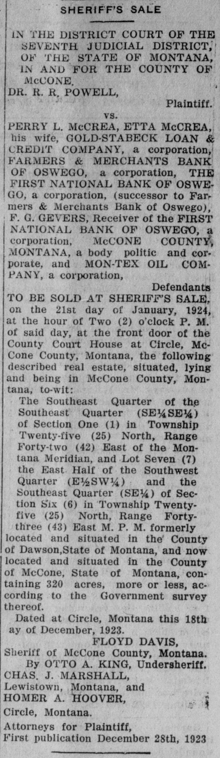 IN THE DISTRICT COURT OF THE SEVENTH JUDICIAL DISTRICT, OF THE STATE OF MONTANA, in AND FOR THE COUNTY OF MCCONE. DR. R. R. POWELL, Plaintiff. vs. PERRY L. McCREA, ETTA McCREA, ms wile, GOLD-STABECK LOAN & CREDIT COMPANY, a corporation, FARMERS & MERCHANTS BANK OF OSWEGO, a corporation, THE FIRST NATIONAL BANK OF OSWEGO, a corporation, (successor to Farmers & Merchants Bank of Oswego), F. G. GEVERS, Receiver of the FIRST NATIONAL BANK OF OSWEGO, a corporation, McCONE COUNTY, MONTANA, a body politic and corporate, and MON-TEX OIL COMPANY, a corporation, Defendants TO BE SOLD AT SHERIFF'S SALE, on the 21st day of January, 1924, at the hour of Two (2) o'clock P. M. of said day, at the front door of the County Court House at Circle, McCone County, Montana, the following described real estate, situated, lying and being in McCone County, Montana, to-wit: The Southeast Quarter of the Southeast Quarter (SE 1/SS 1/4) of Section One (1) in Township Twenty-five (25) North, Range Forty-two (42) East of the Montana Meridian, and Lot Seven (7) the East Half of the Southwest Quarter (E) and the Southeast Quarter (SE 1/4) of Seclion Six (6) in Township Twentyfive (25) North, Range Fortythree (43) East M. P. M. formerly located and situated in the County of Dawson,State of Montana, and now located and situated in the County of McCone, State of Montana, containing 320 acres, more or less, according to the Government survey thereof. Dated at Circle, Montana this 18th day of December, 1923. FLOYD DAVIS, Sheriff of McCone County, Montana. By OTTO A. KING, Undersheriff. CHAS. J. MARSHALL, Lewistown, Montana, and HOMER A. HOOVER, Circle, Montana. Attorneys for Plaintiff, First publication December 28th, 1923