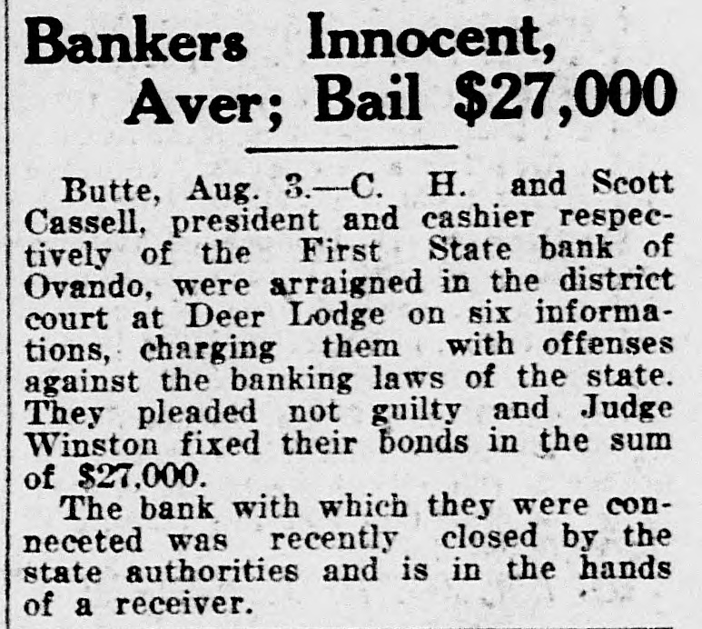 Bankers Innocent, Aver; Bail $27,000 Butte, Aug. 3.-C. H. and Scott Cassell. president and cashier respectively of the First State bank of Ovando, were arraigned in the district court at Deer Lodge on six informations, charging them with offenses against the banking laws of the state. They pleaded not guilty and Judge Winston fixed their bonds in the sum of $27,000. The bank with which they were conneceted was recently closed by the state authorities and is in the hands of a receiver.