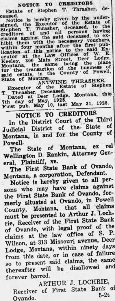 NOTICE TO CREDITORS Estate of Stephen T. Thrasher, deceased. Notice is hereby given the undersigned, the Executor Estate Stephen Thrasher, deceased, to ving the creditors claims of and the said all deceased. persons to exhibit them with the necessary vouchers, within four months after the first publication of this notice Offices the of said ExLaw ecutor Keeley, 300 the Main Street, Deer Lodge, Montana, the being the place of the transaction of the said for estate. in the County of Powell, State of Montana ANTWINE THRASHER, Executor of the Estate of Stephen Dated Thrasher, at Deer Deceased. Lodge, Montana, this First 7th day pub. May 10, 1928. last May 31, 1928.