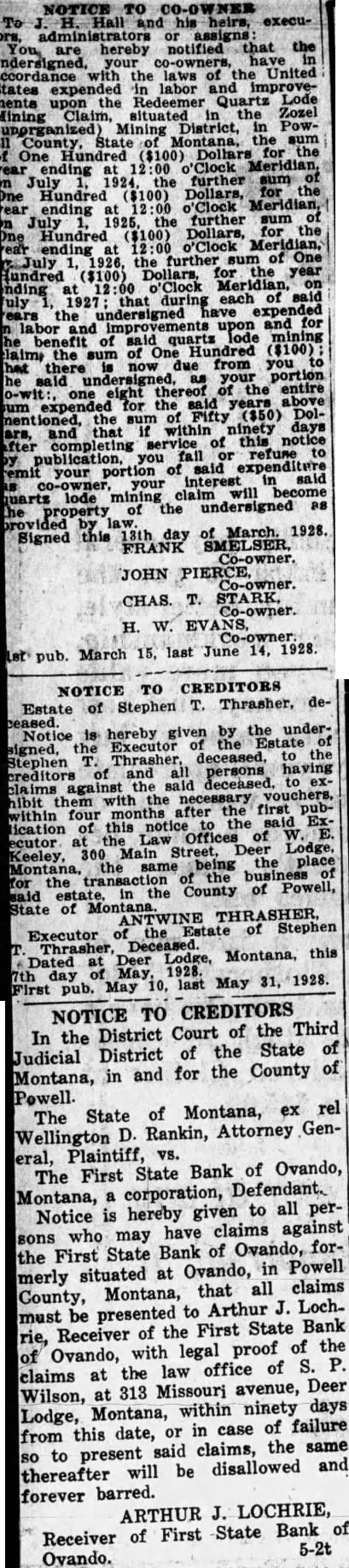 NOTICE TO CO-OWNER To Hall and his heirs, execuadministrators assigns: You are hereby notified that the ndersigned, your co-owners, ccordance the laws of the United tates expended in labor and improvenents upon the Redeemer Quartz Lode fining Claim, situated the Zozel unorganized) Mining District, in PowCounty, State of Montana, the sum One Hundred ($100) Dollars for the ear ending at 12:00 o'Clock Meridian, July 1924, the further sum One Hundred ($100) Dollars, for the ear ending at o'Clock Meridian, of July 1925, the further sum Hundred ($100) Dollars, for the ending at o'Clock Meridian, July 1926, the further sum of One Hundred ($100) Dollars, for the year nding o'Clock Meridian, on uly 1927: that during have each expended of said labor the and undersigned improvements upon and for benefit of said quarts mining laim, the sum of One Hundred ($100) hat there now due from you to said undersigned, as your portion o-wit: one eight thereof of the entire um expended for the years above mentioned, the sum Fifty ($50) Dolare, and that if within ninety days after completing service of this notice to publication, you fall refuse remit your portion of interest said expenditure in said your will become puartz he property lode mining of the claim undersigned as provided Signed by this law 13th day of March. 1928. FRANK SMELSER,