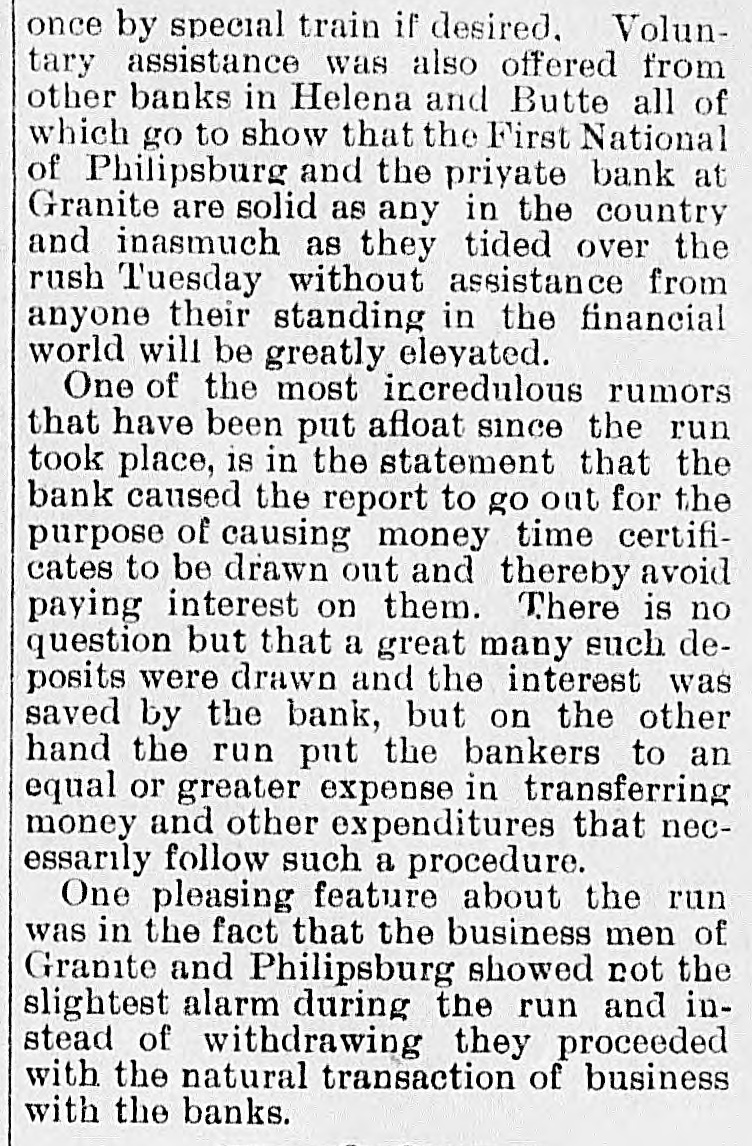 once by special train if desired, Voluntary assistance was also offered from other banks in Helena and Butte all of which go to show that the First National of Philipsburg and the priyate bank at Granite are solid as any in the country and inasmuch as they tided over the rush Tuesday without assistance from anyone their standing in the financial world will be greatly elevated. One of the most incredulous rumors that have been put afloat since the run took place, is in the statement that the bank caused the report to go out for the purpose of causing money time certificates to be drawn out and thereby avoid paying interest on them. There is no question but that a great many such deposits were drawn and the interest was saved by the bank, but on the other hand the run put the bankers to an equal or greater expense in transferring money and other expenditures that necessarily follow such a procedure. One pleasing feature about the run was in the fact that the business men of Granite and Philipsburg showed not the slightest alarm during the run and instead of withdrawing they proceeded with the natural transaction of business with the banks.