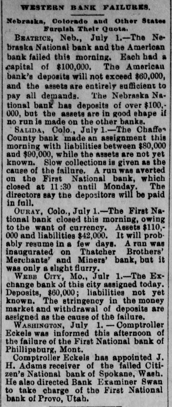 WESTERN BANK FAILURES. Nebraska, Colorado and Other States Farnish Their Quota. BEATRICE, Neb., July .-The Nebraska National bank and the American bank failed this morning. Each had a capital of $100,000. The American bank's deposits will not exceed $60,000, and the assets are entirely sufficient to pay all demands. The Nebraska National bank has deposits of over $100,000, but the assets are in good ehape if no run is made on the other banks. SALIDA, Colo., July 1.-The Chaffe County bank made an assignment this morning with liabilities between $80,000 and $90,000, while the assets are not yet known. Slow collections is given as the cause of the failure. A run was averted on the First National bank, which closed at 11:30 until Monday. The directors say the depositors will be paid in full. OURAY, Colo., July 1.-The First National bank closed this morning, owing to the want of currency. Assets $110,000 and liabilities $42,000. It will prob ably resume in a few days. A run was inaugurated on Thatcher Brothers' Merchants' and Miners' bank, but it was only a slight flurry. WEBB CITY, Mo., Julr 1.-The Exchange bank of this city assigned today. Deposits, $60,000; liabilities not yet known. The stringency in the money market and withdrawal of deposits are assigned as the cause of the failure. WASHINGTON, July 1. - Comptroller Eckels was informed this afternoon of the failure of the First National bank of Phillipeburg, Mont. Comptroller Eckels has appointed J. H. Adams receiver of the failed Citizen's National bank of Spokane, Wash. He also directed Bank Examiner Swan to take charge of the First National bank of Provo, Utah.