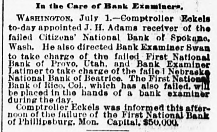 In the Care of Bank Examiners. WASHINGTON. July 1.-Comptroller Eckels to-day appointed J. H. Adams receiver of the failed Citizens' National Bank of Spokane. Wash. He also directed Bank Examiner Swan to take charge of the failed First National Bank of Provo. Utah. and Bank Examiner Latimer to take charge of the failed Nebraska National Bank of Beatrice. The First National Bank of Rico. Col., which has also failed. will be placed in the hands of a bank examiner during the day. Comptroller Eckels was informed this afternoon of the failure of the First National Bank of Phillipsburg. Mon. Capital. $50,000.