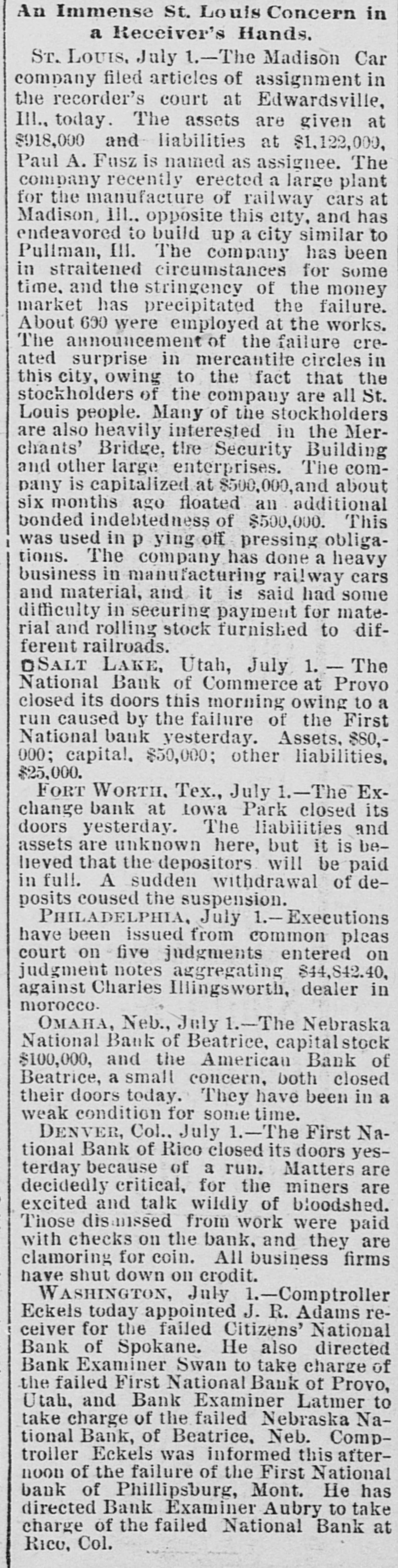 An Immense St. Louis Concern in a Receiver's Hands, ST. LOUIS, July 1.-The Madison Car company filed articles of assignment in the recorder's court at Edwardsville, Ill., today. The assets are given at $918,000 and liabilities at $1,122,000, Paul A. Fusz is named as assignee. The company recently erected a large plant for the manufacture of railway cars at Madison, III., opposite this city, and has endeavored to build up a city similar to Pullman, III. The company has been in straitened circumstances for some time, and the stringency of the money market has precipitated the failure. About 690 were employed at the works. The announcement of the failure created surprise in mercautile circles in this city, owing to the fact that the stockholders of the company are all St. Louis people. Many of the stockholders are also heavily interested in the Merchants' Bridge, the Security Building and other large enterprises. The company is capitalized at $500,000,and about six months ago floated an additional bonded indebtedness of $500,000. This was used in p ying off pressing obligations. The company has done a heavy business in manufacturing railway cars and material, and it is said had some difficulty in securing payment for material and rolling stock furnished to different railroads. OSALT LAKE, Utah, July 1. - The National Bank of Commerce at Provo closed its doors this morning owing to a run caused by the failure of the First National bank yesterday. Assets, $80,000; capital. $50,000; other liabilities, $25,000. FORT WORTH, Tex., July 1.-The Exchange bank at Iowa Park closed its doors yesterday. The liabilities and assets are unknown here, but it is believed that the depositors will be paid in full. A sudden withdrawal of deposits coused the suspension. PHILADELPHIA, July 1.-Executions have been issued from common pleas court on five judgments entered on judgment notes aggregating $44,842.40, against Charies Illingsworth, dealer in morocco. OMAHA, Neb., July 1.-The Nebraska National Bank of Beatrice, capital: $100,000, and the American Bank of Beatrice, a small concern, both closed their doors today. They have been in a weak condition for some time. DENVER, Col., July 1.-The First National Bank of Rico closed its doors yesterday because of a run. Matters are decidedly critical, for the miners are excited and talk wildly of bloodshed. Those dis missed from work were paid with checks on the bank. and they are clamoring for coin. All business firms have shut down on crodit. WASHINGTON, July 1.-Comptroller Eckels today appointed J. R. . Adams receiver for the failed Citizens' National Bank of Spokane. He also directed Bank Examiner Swan to take charge of the failed First National Bank of Provo, Utah, and Bank Examiner Latmer to take charge of the failed Nebraska National Bank, of Beatrice, Neb. Comptroller Eckels was informed this afternoon of the failure of the First National bank of Phillipsburg, Mont. He has directed Bank Examiner Aubry to take charge of the failed National Bank at Ricu, Col.