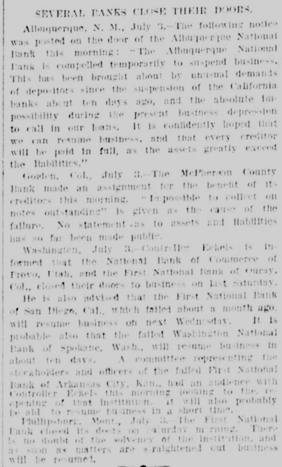 SEVERAL BANKS CLOSE THEIR DOORS. Albuquerque, N. M., July 3.-The following nottee was posted on the door of the Albuquerque National Bank this morning: "The Albuquerque National Bank is compelled temporarily to suspend business. This has been brought about by unusual demands of depositors since the suspension of the California banks about ten days ago, and the absolute impossibility during the present business depression to call in our loans. It is confidently hoped that we can resume business. and that every creditor will be paid in full, as the assets greatly exceed the liabilities." Golden. Col. July 3.-The McPherson County Bank made an assignment for the benefit of its creditors this morning. "Impossible to collect on notes outstanding" is given as the cause of the failure. No statement.as to assets and liabilities has so far been made public. Washington, July 3.-Controller Eckels is informed that the National Bank of Commerce of Provo, Utah. and the First National Bank of ouray. Col.. closed their doors to business on last Saturday. He is also advised that the First National Bank of San Diego. Cal. which fatled about a month ago. will resume business on next Wednesday. It is probable also that the falled Washington National Bank of Spokane, Wash. will resume business in A committee representing the about ten days. stockholders and officers of the failed First National Bank of Arkansas City, Kan., had an audience with Controller Eckets this morning looking to the reopening of that institution it will also probably be abi to resume business in a short time. Phillipsburg, Mont, July 3. The First National Bank closed its does on Starday m riving. There is no doubt of the solveney of the institution. and as soon as matters are 8 raightened out business will be resume