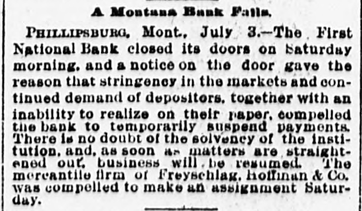 The closing down of the Bi-Metallic and Granite mines was followed to-day by the suspension of the First National bank of Philipsburg ... The bank depositors wanted their money in a hurry, and as the bank was unable to get enough of its line of credits in to accommodate them payment was suspended.