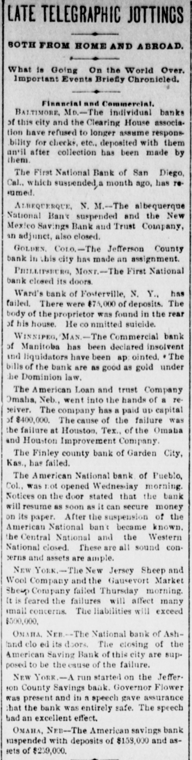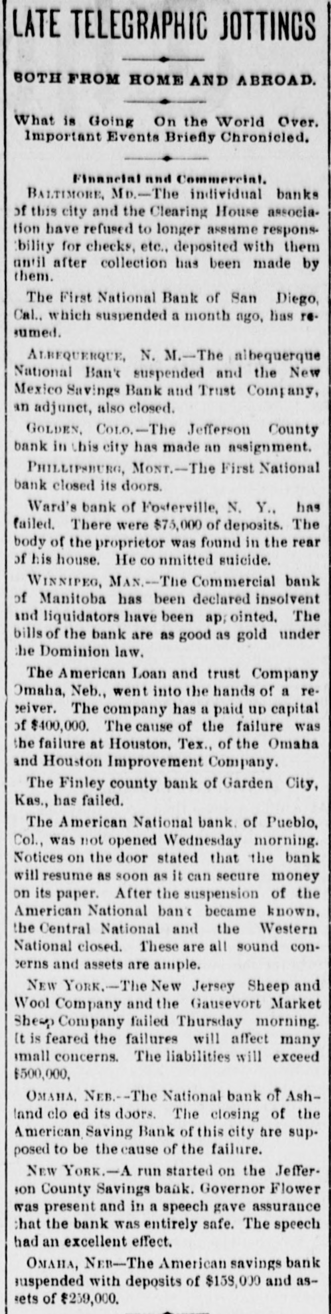 LATE TELEGRAPHIC JOTTINGS BOTH FROM HOME AND ABROAD. What is Going On the World Over. Important Events Briefly Chronicled. Financial and Commercial. BALTIMORE, Mo.-The individual banks of this city and the Clearing House association have refused to longer assume responsbility for checks, etc., deposited with them until after collection has been made by them. The First National Bank of San Diego, Cal.. which suspended a month ago, has re. sumed. ALBEQUERQUE, N. M.-The albequerque National Ban't suspended and the New Mexico Savings Bank and Trust Company, an adjunet, also closed. GOLDEN. Coto.-The Jefferson County bank in this city has made an assignment. PHILLIPSBURG, MONT.-The First National bank closed its doors. Ward's bank of Fosterville, N. Y., has failed. There were $75,000 of deposits. The body of the proprietor was found in the rear of his house. He CO nmitted suicide. WINNIPEG, MAN.--The Commercial bank of Manitoba has been declared insolvent and liquidators have been ap; ointed. The bills of the bank are as good as gold under the Dominion law. The American Loan and trust Company Omaha, Neb., went into the hands of a receiver. The company has a paid up capital of $400,000. The cause of the failure was the failure at Houston, Tex., of the Omaha and Houston Improvement Company. The Finley county bank of Garden City, Kas., has failed. The American National bank. of Pueblo, Col., was not opened Wednesday morning. Notices on the door stated that the bank will resume as soon as it can secure money on its paper. After the suspension of the American National bank became known. the Central National and the Western National closed. These are all sound concerns and assets are ample. NEW YORK.-The New Jersey Sheep and Wool Company and the Gausevort Market Sheep Company failed Thursday morning. It is feared the failures will affect many small concerns. The liabilities will exceed $500,000, OMAHA. NEB.--The National bank of Ashland clo ed its doors. The closing of the American Saving Bank of this city are sup. posed to be the cause of the failure. NEW YORK.-A run started on the Jefferon County Savings bank. Governor Flower was present and in a speech gave assurance that the bank was entirely safe. The speech had an excellent effect. OMAHA, NEB-The American savings bank suspended with deposits of $159,000 and assets of $259,000.