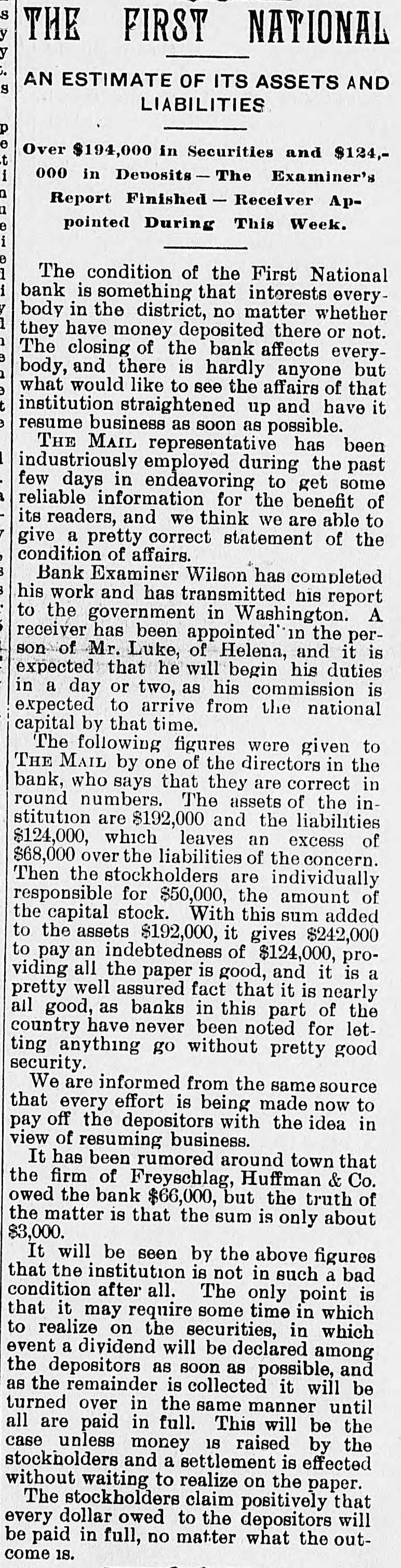 S THE FIRST NATIONAL AN ESTIMATE OF ITS ASSETS AND S LIABILITIES p e Over $194,000 in Securities and $124,t i 000 in Deposits - The Examiner's n Report Finished - Receiver Apa pointed During This Week. e i e The condition of the First National bank is something that interests everybody in the district, no matter whether they have money deposited there or not. The closing of the bank affects everybody, and there is hardly anyone but what would like to see the affairs of that institution straightened up and have it resume as soon as been industriously THE MAIL business employed representative during possible. has the past few days in endeavoring to get some reliable information for the benefit of its readers, and we think we are able to give a pretty correct statement of the condition of affairs. Bank Examiner Wilson has completed his work and has transmitted his report to the government in Washington. in the receiver has been appointed per- A son of Mr. Luke, of Helena, and it is expected that he will begin his duties in a day or two, as his commission is expected to arrive from the national capital by that time. The following figures were given to THE MAIL by one of the directors in the bank, who says that they are correct in round numbers. The assets of the institution are $192,000 and the liabilities $124,000, which leaves an excess of $68,000 over the liabilities of the concern. Then the stockholders are individually responsible for $50,000, the amount of the capital stock. With this sum added to the assets $192,000, it gives $242,000 to pay an indebtedness of $124,000, providing all the paper is good, and it is a pretty well assured fact that it is as in this all good, banks part of nearly the country have never been noted for letting anything go without pretty good security. We are informed from the same source that every effort is being made now to pay off the depositors with the idea in view of resuming business. It has been rumored around town that the firm of Freyschlag, Huffman & Co. owed the bank $66,000, but the truth of the matter is that the sum is only about $3,000. It will be seen by the above figures that the institution is not in such a bad condition after all. The only point is that it may require some time in which to realize on the securities, in which event a dividend will be declared among the depositors as soon as possible, and as the remainder is collected it will be turned over in the same manner until all are paid in full. This will be the case unless money 18 raised by the stockholders and a settlement is effected without waiting to realize on the paper. The stockholders claim positively that every dollar owed to the depositors will be paid in full, no matter what the outcome 18.