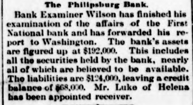 The Philipsburg Bank. Bank Examiner Wilson has finished his examination of the affairs of the First National bank and has forwarded his report to Washington. The bank's assets are figured up at $192,000. This includes all the securities held by the bank. nearly all of which are believed to be available. The liabilities are $124,000, leaving a credit balance of $68,000. Mr. Luke of Helena has been appointed receiver.