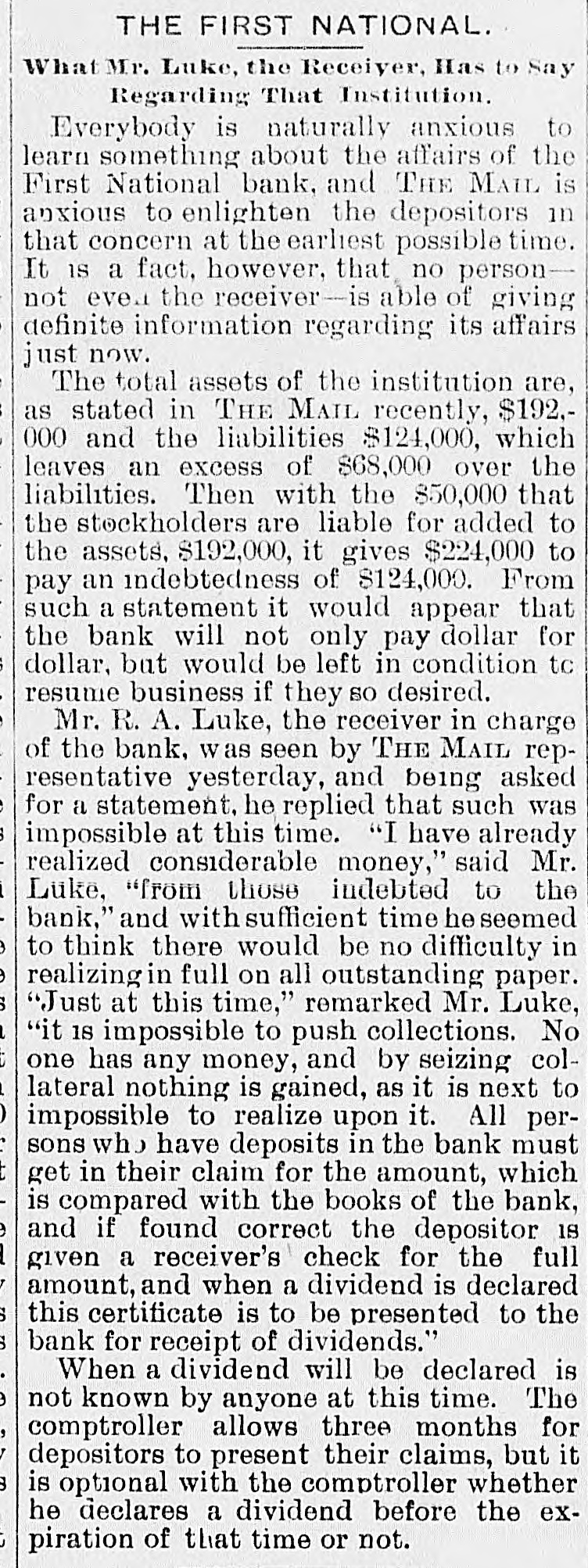 THE FIRST NATIONAL. What Mr. Luke, the Receiver, Has to Say Regarding That Institution. Everybody is naturally anxious to learn something about the affairs of the First National bank. and THE MAIL is anxious to enlighten the depositors in that concern at the earliest possible time. It IS a fact. however, that no personnot eve.t the receiver-is able of giving definite information regarding its affairs just now. The total assets of the institution are, as stated in THE MAIL recently, $192,000 and the liabilities $124,000, which leaves an excess of $68,000 over the liabilities. Then with the $50,000 that the stockholders are liable for added to the assets, $192,000, it gives $224,000 to pay an indebtedness of $124,000. From such a statement it would appear that the bank will not only pay dollar for dollar, but would be left in condition tc resume business if they SO desired. Mr. R. A. Luke, the receiver in charge of the bank, was seen by THE MAIL representative yesterday, and being asked for a statement, he replied that such was impossible at this time. "I have already realized considerable money," said Mr. Lüke, "from those indebted to the bank," and with sufficient time he seemed to think there would be no difficulty in realizing in full on all outstanding paper. "Just at this time," remarked Mr. Luke, "it 18 impossible to push collections. No one has any money, and by seizing collateral nothing is gained, as it is next to impossible to realize upon it. All persons who have deposits in the bank must get in their claim for the amount, which is compared with the books of the bank, and if found correct the depositor IS given a receiver's check for the full amount, and when a dividend is declared this certificate is to be presented to the bank for receipt of dividends." When a dividend will be declared is not known by anyone at this time. The comptroller allows three months for depositors to present their claims, but it is optional with the comptroller whether he declares a dividend before the expiration of that time or not.