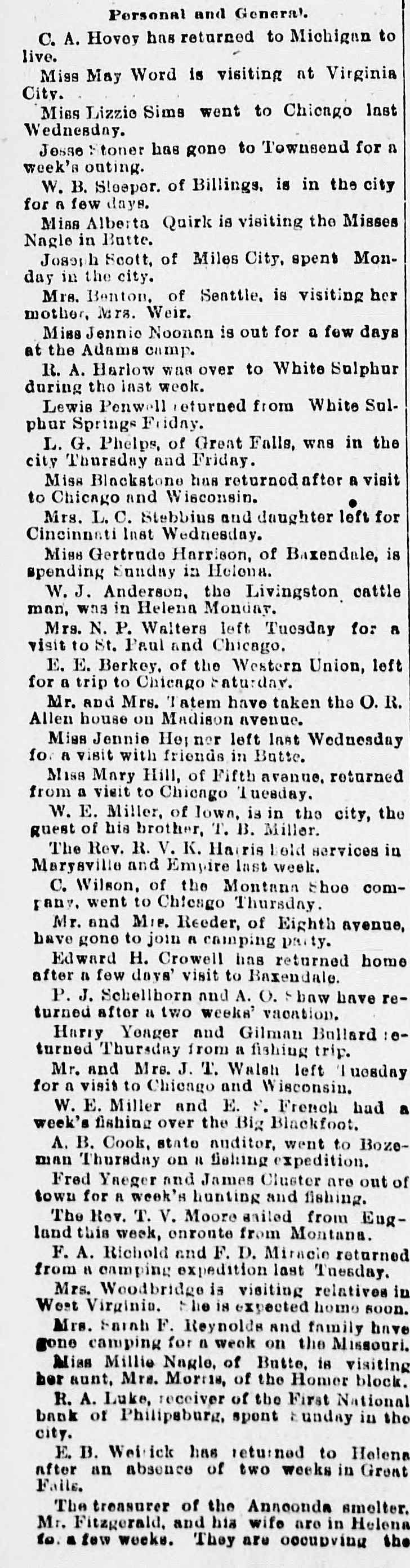 Personal and Genera'. C.A. Hovey has returned to Michigan to live. Miss May Word is visiting at Virginia City. Miss Lizzie Sims went to Chicago last Wednesday. Jesse :toner has gone to Townsend for a week's outing. W. B. Sleeper. of Billings, is in the city for A few days. Miss Alberta Quirk is visiting the Misses Nagle in Butte. Joseph Scott, of Miles City, spent Monday in the city. Mrs. Benton. of Seattle, is visiting her mother, Mrs. Weir. Miss Jennie Noonnn is out for a few days at the Adams camp. R. A. Harlow was over to White Sulphur during the last week. Lewis Penwell returned from White Sulphur Springs Friday. L. G. Phelps, of Great Falls, was in the city Thursday and Friday. Miss Blackstone has returned after a visit to Chicago and Wisconsin. Mrs. L.C. Stebbius and daughter left for Cincinnati Inst Wednesday. Miss Gertrude Harrison, of Baxendale, is spending Sunday in Helona. W. J. Anderson, the Livingston cattle man, was in Helena Monday. Mrs. N. P. Walters left Tuesday for a visit to St. Paul and Chicago. E. E. Berkey, of the Western Union, left for a trip to Chicago Saturday. Mr. and Mrs. Tatem have taken the O.R. Allen house on Madison avenue. Miss Jennie Herner left last Wednesday fo. A visit with friends in Butte. Miss Mary Hill, of Fifth avanue, returned from a vieit to Chicago Tuesday. W. E. Miller, of lown. is in the city, the guest of his brother, T. B. Miller. The Rev. R. V. K. Hairis bold services in Maryaville and Empire last week. C. Wilson, of the Montana Shoe comrany, went to Chicago Thursday. Mr. and M.e. Reeder, of Eighth avenue, have gone to join A camping party. Edward H. Crowell has returned home after a few days' visit to Baxendale. P. J. Schellhorn and A. O. : baw have returned after a two weeks' vacation. Harry Yenger and Gilman Bollard 10turned Thursday from a fishing trip. Mr. and Mrs. J. T. Walsh left Tuesday for a visit to Chicago and Wisconsin. W. E. Miller and E. : French had a week's fishing over the Big Blackfoot. A. B. Cook, state auditor, went to Bozeman Thursday on 11 fishing expedition. Fred Yaeger and James Cluster are out of town for A week's hunting and fishing. The Rev. T. V. Moore exiled from Eugland this week, enronte from Montana. F. A. Richold and F. D. Miracle returned from H camping expedition last Tuesday. Mrs. Woodbridge is visiting relatives in West Virginia. the is expected home soon. Mrs. Sninh F. Reynolds and family have gone camping for n week on the Missouri. Miss Millie Nagle, of Butte, is visiting her aunt, Mrs. Morris, of the Homer block. R. A. Luke, receiver of the First National bank of Philipaburg, spont Funday in the city. E. B. Weisick has returned to Helena after an absence of two weeks in Great Fails. The treasurer of the Annoonda smelter. Mr. Fitzgerald, and his wife are in Helena to. a few weeks. They are occurving the
