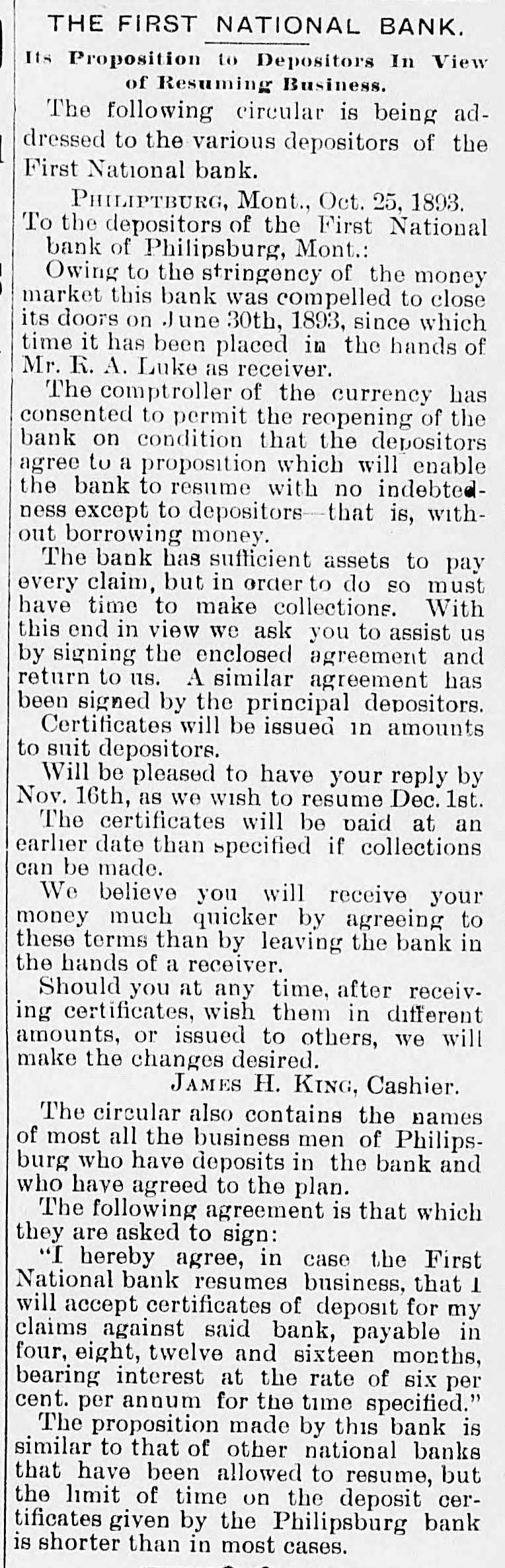 THE FIRST NATIONAL BANK. Its Proposition to Depositors In View of Resuming Business. The following circular is being addressed to the various depositors of the First National bank. PHILIPTBURG, Mont., Oct. 25, 1893. To the depositors of the First National bank of Philipsburg, Mont.: Owing to the stringency of the money market this bank was compelled to close its doors on June 30th, 1893, since which time it has been placed in the hands of Mr. R. A. Luke as receiver. The comptroller of the currency has consented to permit the reopening of the bank on condition that the depositors agree to a proposition which will enable the bank to resume with no indebtedness except to depositors-that is, without borrowing money. The bank has sufficient assets to pay every claim, but in order to do SO must have time to make collections. With this end in view we ask you to assist us by signing the enclosed agreement and return to us. A similar agreement has been signed by the principal depositors. Certificates will be issued in amounts to suit depositors. Will be pleased to have your reply by Nov. 16th, as we wish to resume Dec. 1st. The certificates will be paid at an earlier date than specified if collections can be made. We believe you will receive your money much quicker by agreeing to these terms than by leaving the bank in the hands of a receiver. Should you at any time, after receiving certificates, wish them in different amounts, or issued to others, we will make the changes desired. JAMES H. KING, Cashier. The circular also contains the names of most all the business men of Philipsburg who have deposits in the bank and who have agreed to the plan. The following agreement is that which they are asked to sign: "I hereby agree, in case the First National bank resumes business, that 1 will accept certificates of deposit for my claims against said bank, payable in four, eight, twelve and sixteen months, bearing interest at the rate of six per cent. per annum for the time specified." The proposition made by this bank is similar to that of other national banks that have been allowed to resume, but the limit of time on the deposit certificates given by the Philipsburg bank is shorter than in most cases.
