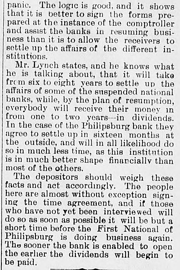 panic. The logic is good, and it shows that it is better to sign the forms prepared at the instance of the comptroller and assist the banks in resuming business than it is to allow the receivers to settle up the affairs of the different institutions. Mr. Lynch states, and he knows what he is talking about, that it will take from six to eight years to settle up the affairs of some of the suspended national banks, while, by the plan of resumption, everybody will receive their money in from one to two years in dividends. In the case of the Philipsburg bank they agree to settle up in sixteen months at the outside, and will in all likelihood do SO in much less time, as this institution is in much better shape financially than most of the others. The depositors should weigh these facts and act accordingly. The people here are almost without exception signing the time agreement, and if those who have not yet been interviewed will do SO as soon as possible it will be but a short time before the First National of Philipsburg is doing business again. The sooner the bank is enabled to open the earlier the dividends will begin to be paid.