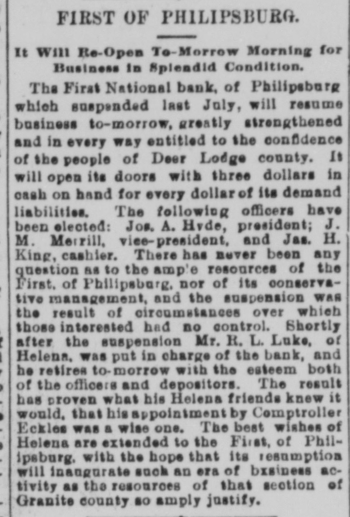 FIRST OF PHILIPSBURG. It Will Re-Open To-Morrow Morning for Business in Splendid Condition. The First National bank, of Philipsburg which suspended last July, will resume business to-morrow, greatly strengthened and in every way entitled to the confidence of the people of Deer Lodge county. It will open its doors with three dollars in cash on hand for every dollar of its demand liabilities. The following officers have been elected: Jos. A. Hyde, president; J. M. Merrill, viee-president, and Jas. H. King, cashier. There has never been any question as to the ample resources of the First. of Philipsbarg, nor of its conservative management, and the suspension WAR the result of circumstances over which those interested had no control. Shortly after the suspension Mr. R. L. Luke, of Helena. was put in charge of the bank, and he retires to- morrow with the esteem both of the officers and depositors. The result has proven what his Helena friends knew it would, that his appointment by Comptroller Eckles was a wise one. The best wishes of Helena are extended to the First, of Philipsburg. with the hope that its resumption will inaugurate such an era of bxsiness activity as the resources of that section of Granite county so amply justify.