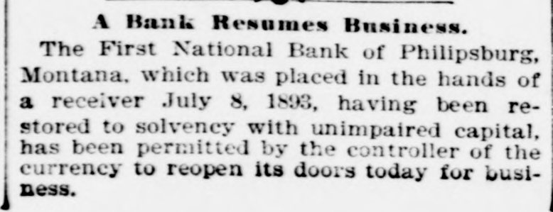 A Bank Resumes Business. The First National Bank of Philipsburg, Montana, which was placed in the hands of a receiver July 8, 1893, having been restored to solvency with unimpaired capital, has been permitted by the controller of the currency to reopen its doors today for business.