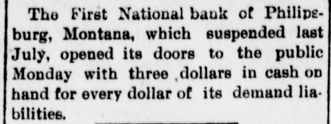 The First National bank, of Philipsburg which suspended last July, will resume business to-morrow, greatly strengthened ... It will open its doors with three dollars in cash on hand for every dollar of its demand liabilities.