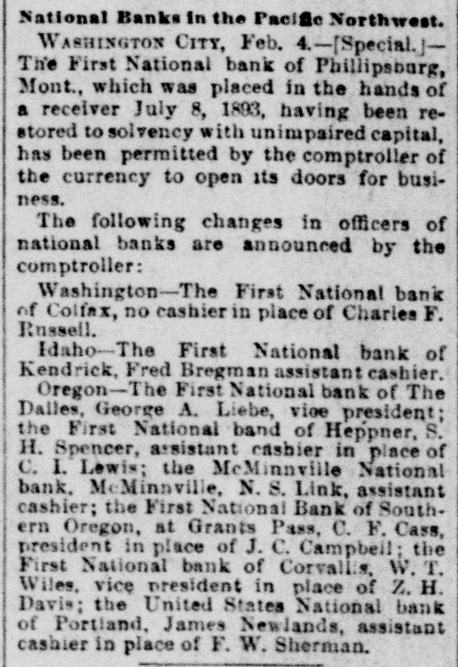 National Banks in the Pacific Northwest. WASHINGTON CITY, Feb. 4.-[Special.]The First National bank of Phillipsburg, Mont., which was placed in the hands of a receiver July 8, 1893, having been restored to solvency with unimpaired capital, has been permitted by the comptroller of the currency to open its doors for business. The following changes in officers of national banks are announced by the comptroller: Washington-The / First National bank of Colfax, no cashier in place of Charles F. Russell. Idaho-The First National bank of Kendrick, Fred Bregman assistant cashier. Oregon-The First National bank of The Dalles, George A. Liebe, vice president; the First National band of Heppner, S. H. Spencer, assistant cashier in place of C. I. Lewis; the McMinnville National bank. McMinnville, N. S. Link, assistant cashier; the First National Bank of South. ern Oregon, at Grants Pass, C. F. Cass, president in place of J. C. Campbeil; the First National bank of Corvalis, W. T. Wiles, vice president in place of Z. H. Davis: the United States National bank of Portland, James Newlands, assistant cashier in place of F. W. Sherman.