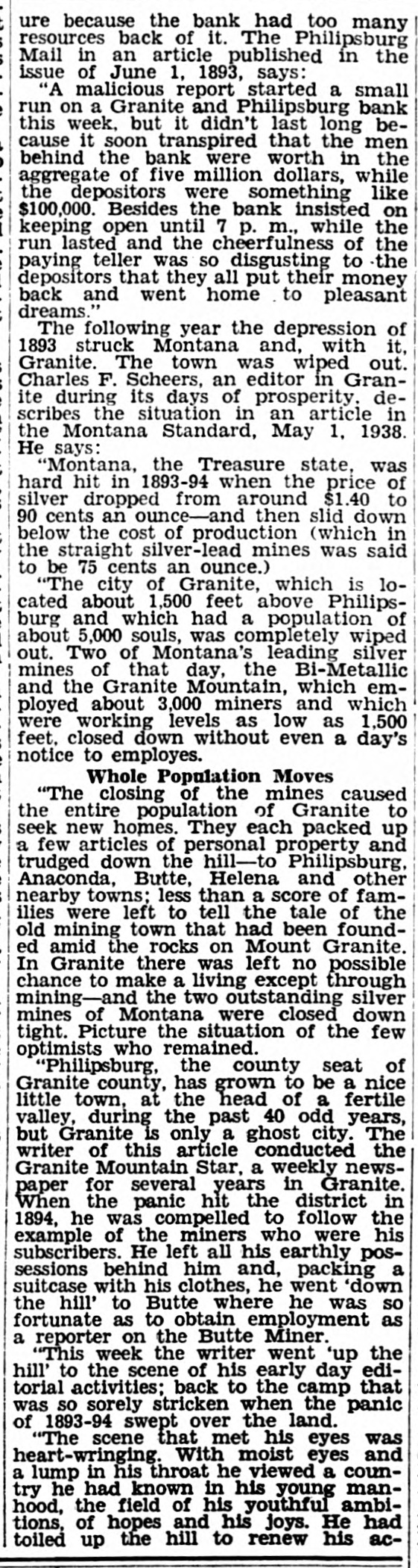 ure because the bank had too many resources back of it. The Philipsburg Mail in an article published in the issue of June 1, 1893, says: "A malicious report started a small run on a Granite and Philipsburg bank this week, but it didn't last long because it soon transpired that the men behind the bank were worth in the aggregate of five million dollars, while the depositors were something like $100,000. Besides the bank insisted on keeping open until 7 p. m., while the run lasted and the cheerfulness of the paying teller was so disgusting to the depositors that they all put their money back and went home to pleasant dreams." The following year the depression of 1893 struck Montana and, with it, Granite. The town was wiped out. Charles F. Scheers, an editor in Granite during its days of prosperity. describes the situation in an article in the Montana Standard, May 1, 1938. He says: "Montana, the Treasure state, was hard hit in 1893-94 when the price of silver dropped from around $1.40 to 90 cents an ounce-and then slid down below the cost of production (which in the straight silver-lead mines was said to be 75 cents an ounce.) "The city of Granite, which is located about 1,500 feet above Philipsburg and which had a population of about 5,000 souls, was completely wiped out. Two of Montana's leading silver mines of that day, the Bi-Metallic and the Granite Mountain, which employed about 3,000 miners and which were working levels as low as 1,500 feet, closed down without even a day's notice to employes. Whole Population Moves "The closing of the mines caused the entire population of Granite to seek new homes. They each packed up a few articles of personal property and trudged down the hill-to Philipsburg, Anaconda, Butte, Helena and other nearby towns; less than a score of families were left to tell the tale of the old mining town that had been founded amid the rocks on Mount Granite. In Granite there was left no possible chance to make a living except through mining-and the two outstanding silver mines of Montana were closed down tight. Picture the situation of the few optimists who remained. "Philipsburg, the county seat of Granite county, has grown to be a nice little town, at the head of a fertile valley, during the past 40 odd years, but Granite is only a ghost city. The writer of this article conducted the Granite Mountain Star, a weekly newspaper for several years in Granite. When the panic hit the district in 1894, he was compelled to follow the example of the miners who were his subscribers. He left all his earthly possessions behind him and, packing a suitcase with his clothes, he went 'down the hill' to Butte where he was so fortunate as to obtain employment as a reporter on the Butte Miner. "This week the writer went 'up the hill' to the scene of his early day editorial activities; back to the camp that was so sorely stricken when the panic of 1893-94 swept over the land. "The scene that met his eyes was heart-wringing. With moist eyes and a lump in his throat he viewed a country he had known in his young manhood, the field of his youthful ambitions, of hopes and his joys. He had toiled up the hill to renew his ac-
