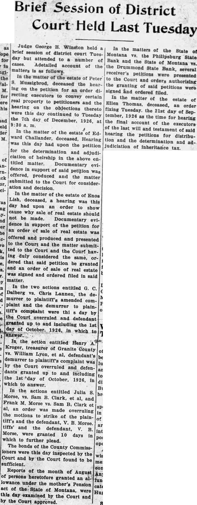 Brief Session of District Court Held Last Tuesday Judge George B. Winston held a brief session of district court Tuesday but attended to a number of cases. Adetailed account of the matters is as follows. In the matter of the estate of Peter S. Mussigbrod, deceased the hearing on the petition for an order directing executors to convey certain real property to petitioners and the hearing on the objections thereto were this day continued to Tuesday the 7th day of December, 1926, at 9:30 a. m. In the matter of the estate of Edward Challander, deceased, Hearing was this day had upon the petition for the determination and adjudiciation of heirship in the above entitled matter. Documentary evidence in support of said petition was offered, produced and the matter submitted to the Court for consideration and decision. In the matter of the estate of Enos Lish, deceased, a hearing was this day had upon an order to show cause why sale of real estate should not be made. Documentary evidence in support of the petition for an order of sale of real estate was offered and produced and presented to the Court and the matter submitted to the Court and the Court having duly considered the same, ordered that said petition be granted and an order of sale of real estate was signed and ordered filed in said matter. In the two actions entitled G. C. Dalberg VS. Chris Lannen, the demurrer to plaintiff's amended complaint and the demurrer to plaintiff's complaint were thi S day by the Court overruled and defendant granted up to and including the 1st day of October. 1926, in which to In the action entitled Henry A. Kroger, treasurer of Granite County vs. William Lyon, et al, defendant's demurrer to plaintiff's complaint was by the Court overruled and defendants granted up to and including the 1st *day of October, 1926, in which to answer. In the actions entitled Julia S. Morse, vs. Sam B. Clark, et al, and Frank M. Morse vs. Sam B. Clark et al, an order was made overruling the motions to strike of the plaintiff's and the defendant, V. B. Morse. tiffs' and the defendant, V. B. Morse, were granted 10 days in which to further plead. The bonds of the County Commissioners were this day inspected by the Court and by the Court found to be sufficient. Reports of the month of August of persons heretofore granted an allowance under the mother's Pension act of the State of Montana, were this day examined by the Court and by the Court approved. In the matters of the State of Montana vs. the Philipsburg State Bank and the State of Montana VS. the Drummond State Bank, several receiver's petitions were presented to the Court and orders authorizing the granting of said petitions were signed and ordered filed. In the matter of the estate of Ellen Thomas, deceased, an order fixing Tuesday. the 21st day of September, 1926 as the time for hearing the final account of the executors of the last will and testament of said hearing the petitions for distribution and the determination and adjudiciation of inheritance tax.