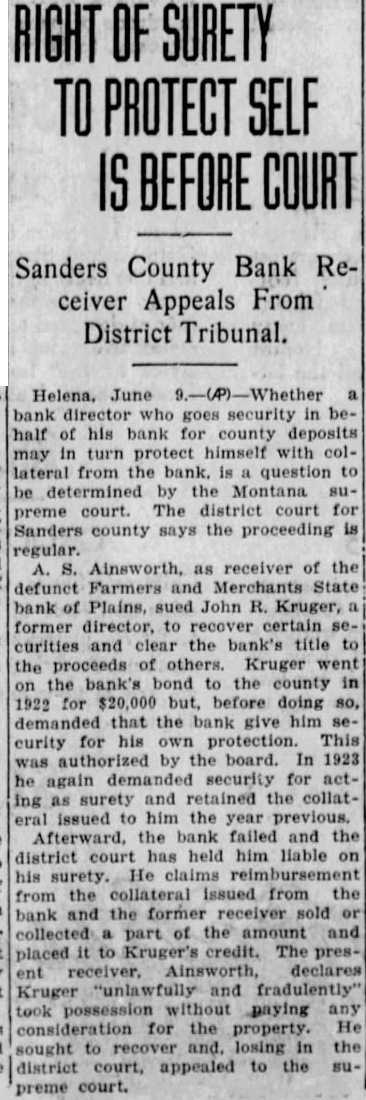 RIGHT OF SURETY TO PROTECT SELF BEFORE COURT Sanders County Bank Receiver Appeals From District Tribunal. Helena. June bank director who goes security in behalf of his bank for county deposits may in turn protect himself with collateral from the bank. is question to be determined by the Montana supreme court. The district court for Sanders county says the proceeding is regular. S. Ainsworth, as receiver of the defunct Farmers and Merchants State bank of Plains, sued John R. Kruger, former director, to recover certain securities and clear the bank's title to the proceeds of others. Kruger went on the bank's bond to the county in 1922 for $20,000 but, before doing so, demanded that the bank give him security for his own protection. This was authorized by the board. In 1923 he again demanded security for acting as surety and retained the collateral issued to him the year previous. Afterward, the bank failed and the district court has held him liable on his surety. He claims reimbursement from the collateral issued from the bank and the former receiver sold or collected part of the amount and placed it to Kruger's credit. The present receiver. Ainsworth, declares Kruger "unlawfully and fradulently' took possession without paying any consideration for the property. He sought to recover and, losing in the district court, appealed to the supreme court.