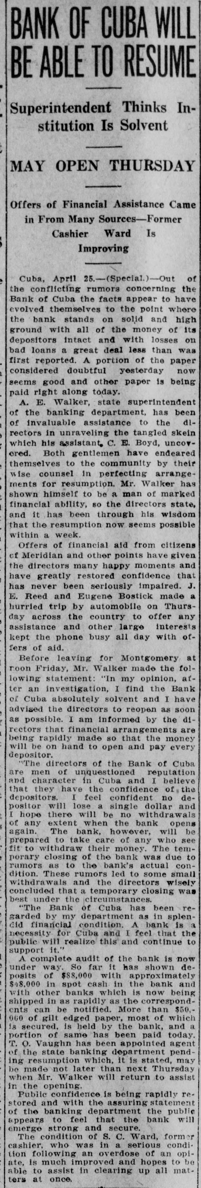 BANK OF CUBA WILL BE ABLE TO RESUME Superintendent Thinks Institution Is Solvent MAY OPEN THURSDAY Offers of Financial Assistance Came in From Many Sources-Former Cashier Ward Is Improving Cuba, April 25.-(Special.)-Out of the conflicting rumors concerning the Bank of Cuba the facts appear to have evolved themselves to the point where the bank stands on solid and high ground with all of the money of its depositors intact and with losses on bad loans a great deal less than was first reported. A portion of the paper considered doubtful yesterday now seems good and other paper is being paid right along today. A. E. Walker, state superintendent of the banking department, has been of invaluable assistance to the dlrectors in unraveling the tangled skein which his assistant. C. E. Boyd, uncovered. Both gentlemen have endeared themselves to the community by their wise counsel in perfecting arrangements for resumption. Mr. Walker has shown himself to be a man of marked financial ability, so the directors state, and it has been through his wisdom that the resumption now seems possible within a week. Offers of financial aid from citizens cf Meridian and other points have given the directors many happy moments and have greatly restored confidence that has never been seriously impaired. J. E. Reed and Eugene Bostick made a hurried trip by automobile on Thursday across the country to offer any assistance and other large interests kept the phone busy all day with offers of aid. Before leaving for Montgomery at noon Friday, Mr. Walker made the following statement: "In my opinion, atter an investigation, I find the Bank of Cuba absolutely solvent and I have advised the directors to reopen as soon as possible. I am informed by the directors that financial arrangements are being rapidly made so that the money will be on hand to open and pay every depositor. The directors of the Bank of Cuba are men of unquestioned reputation and character in Cuba and I believe that they have the confidence of the depositors. I feel confident no depositor will lose a single dollar and I hope there will be no withdrawals of any extent when the bank opens again. The bank, however, will be prepared to take care of any who see fit to withdraw their money. The temporary closing of the bank was due to ramors as to the bank's actual condition. These rumors led to some small withdrawals and the directors wisely concluded that a temporary closing was best under the circumstances. "The Bank of Cuba has been regarded by my department as in splendid financial condition. A bank is a necessity for Cuba and I feel that the public will realize this and continue to support it." A complete audit of the bank is now under way. So far it has shown deposits of $88,000 with approximately $48,000 in spot cash in the bank and with other banks which is now being shipped in as rapidly as the correspondents can be notified. More than $50.000 of gilt edged paper, most of which is secured, is held by the bank, and a portion of same has been paid today. T. O. Vaughn has been appointed agent of the state banking department pending resumption which, it is stated, may be made not later than next Thursday when Mr. Walker will return to assist in the opening. Public confidence is being rapidly restored and with the assuring statement of the banking department the public appears to feel that the bank will emerge strong and secure. The condition of S. C. Ward, former cashier, who was in a serious condition following an overdose of an opiate, is much improved and hopes to be able to assist in clearing up all mat. ters at once.