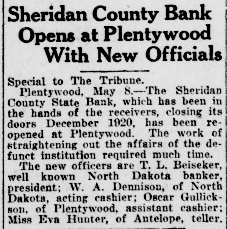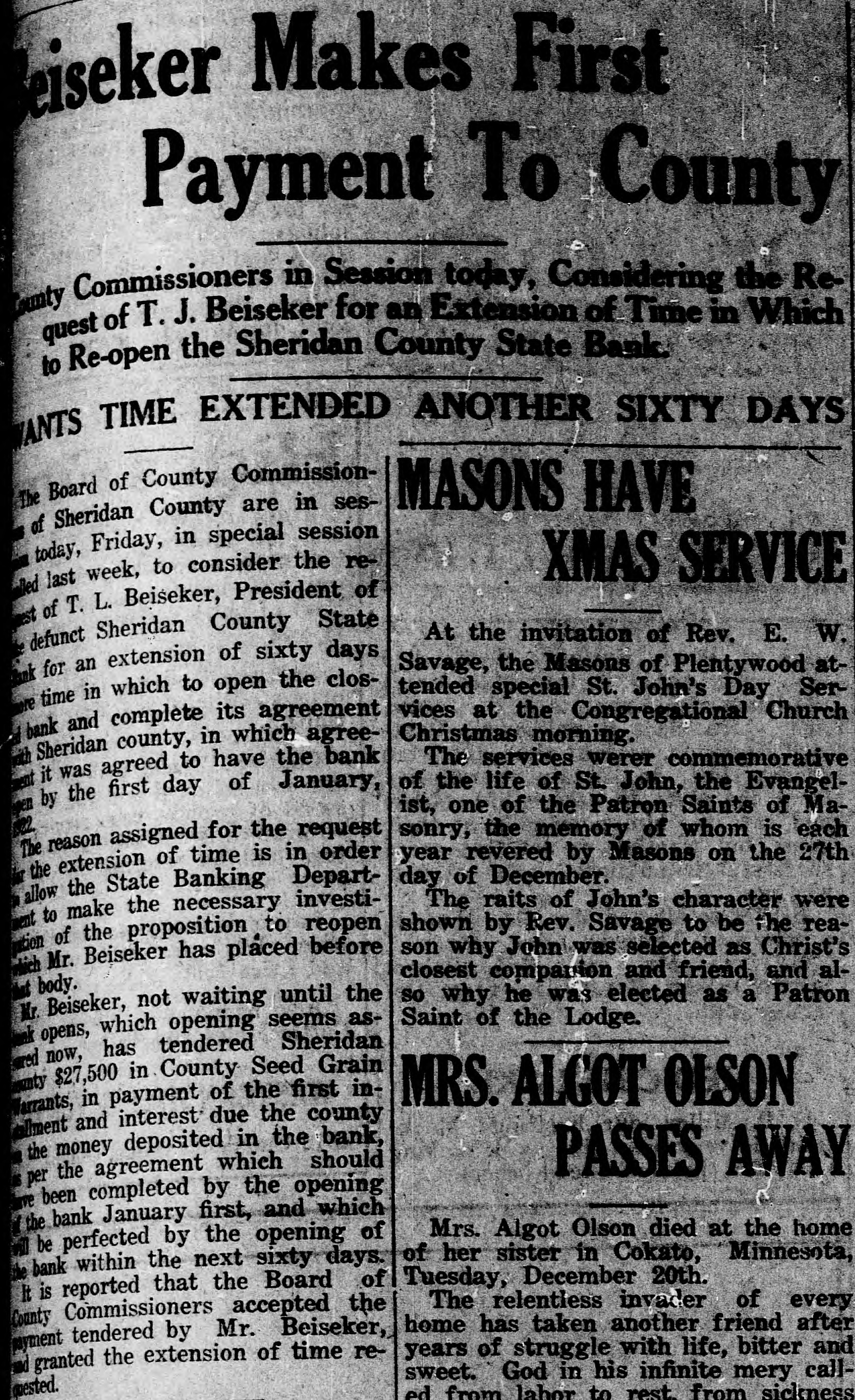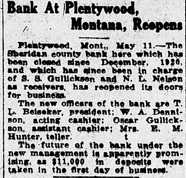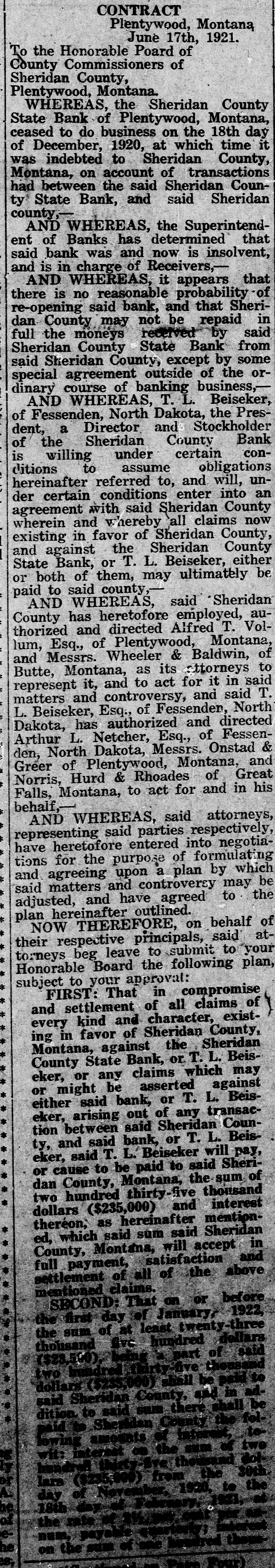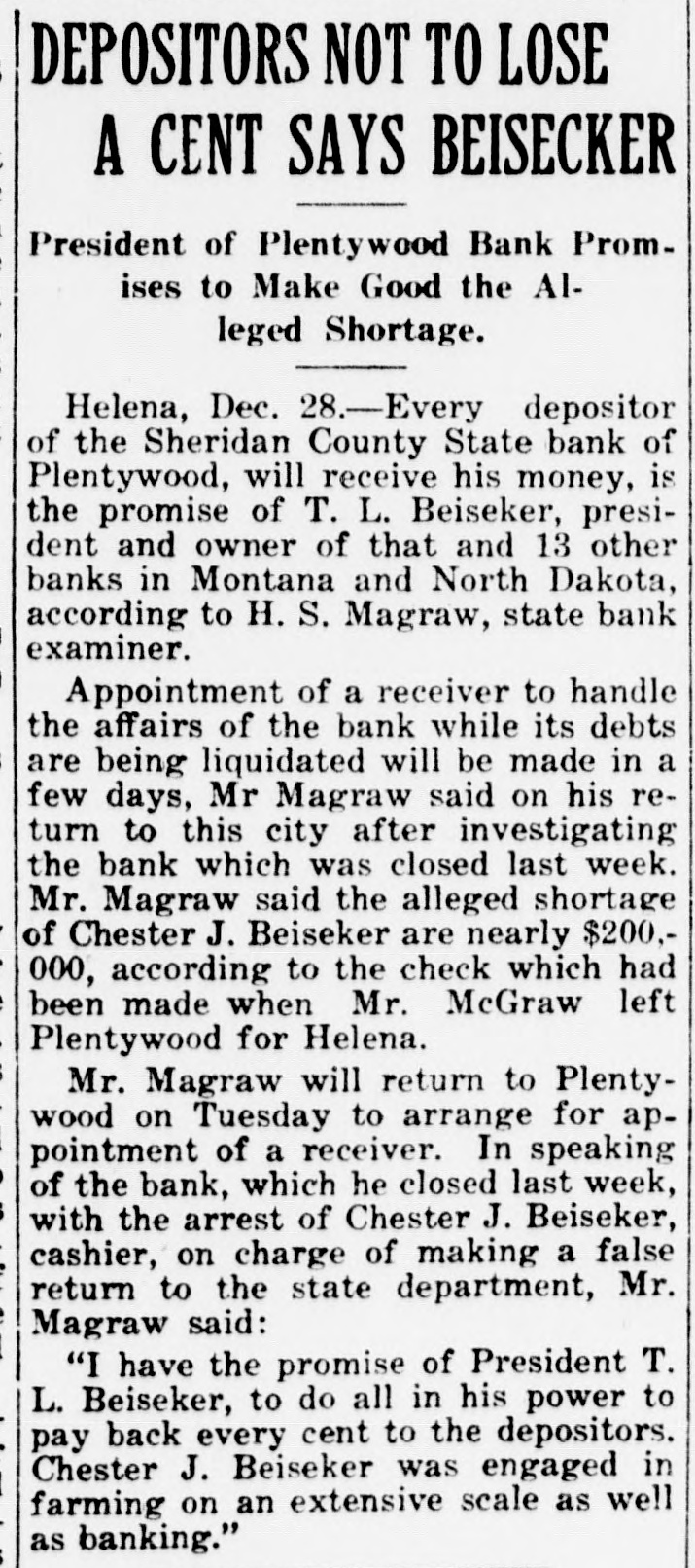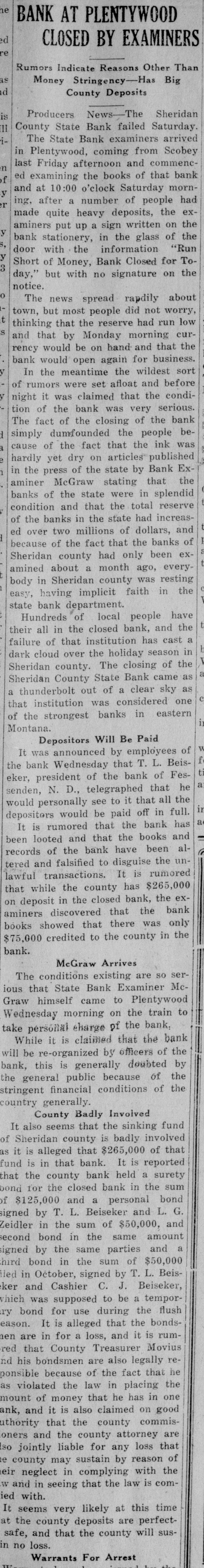 CLOSED BY EXAMINERS Rumors Indicate Reasons Other Than Money Stringency-Has Big County Deposits Producers News-The Sheridan County State Bank failed Saturday. The State Bank examiners arrived in Plentywood, coming from Scobey last Friday afternoon and commenced examining the books of that bank and at 10:00 o'clock Saturday morning, a had made exafter quite heavy number deposits, of people the aminers put up a sign written on the bank stationery, in the glass of the door with the information "Run Short of Money, Bank Closed for Today," but with no signature on the notice. The news spread rapdily about town, but most people did not worry, that reserve run low and curthinking that by the Monday morning had rency would be on hand and that the bank would open again for business. In the meantime the wildest sort of rumors were set afloat and before night it was claimed that the condition of the bank was very serious. The fact of the closing of the bank simply dumfounded the people because was on hardly of yet the dry fact that articles the published ink in the press of the state by Bank Examiner McGraw stating that the banks of the state were in splendid condition and that the total reserve of the banks in the state had increased over two millions of dollars, and because of the fact that the banks of Sheridan county had only been examined about a month ago, everybody in Sheridan county was resting easy, having implicit faith in the state bank department. Hundreds of local people have their all in the closed bank, and the failure of that institution has cast a dark cloud over the holiday season in Sheridan county. The closing of the Sheridan County State Bank came as a thunderbolt out of a clear sky as that institution was considered one of the strongest banks in eastern Montana. Depositors Will Be Paid W It was announced by employees of f the bank Wednesday that T. L. Beisti of the bank of Fesa N. D., he senden, eker, president telegraphed that that all would see to it the in would be paid a that the depositors It is personally rumored off bank in full. has been looted and that the books and records of the bank have been altered and falsified to disguise the unlawful transactions. It is rumored that while the county has $265,000 on deposit in the closed bank, the examiners discovered that the bank books showed that there was only $75,000 credited to the county in the bank. McGraw Arrives The conditions existing are so serous that State Bank Examiner McGraw himself came to Plentywood Wednesday morning on the train to ake personal charge of the bank, While it is claimed that the bank vill be re-organized by officers of the ank, this is generally doubted by he general public because of the tringent financial conditions of the puntry generally. County Badly Involved It also seems that the sinking fund f Sheridan county is badly involved S it is alleged that $265,000 of that und is in that bank. It is reported at the county bank held a surety ond for the closed bank in the sum : $125,000 and a personal bond gned by T. L. Beiseker and L. G. eidler in the sum of $50,000, and cond bond in the same amount gned by the same parties and a ird bond in the sum of $50,000 ed in October, signed by T. L. Beiser and Cashier C. J. Beiseker, hich was supposed to be a tempory bond for use during the flush ason. It is alleged that the bondsen are in for a loss, and it is rumed that County Treasurer Movius d his bondsmen are also legally reonsible because of the fact that he si violated the law in placing the mount of money that he has in one nk, and it is also claimed on good thority that the county commisners and the county attorney are o jointly liable for any loss that : county may sustain by reason of ir neglect in complying with the v and in seeing that the law is comed with. It seems very likely at this time t the county deposits are perfectsafe, and that the county will susno loss.