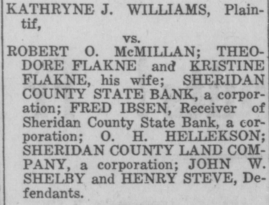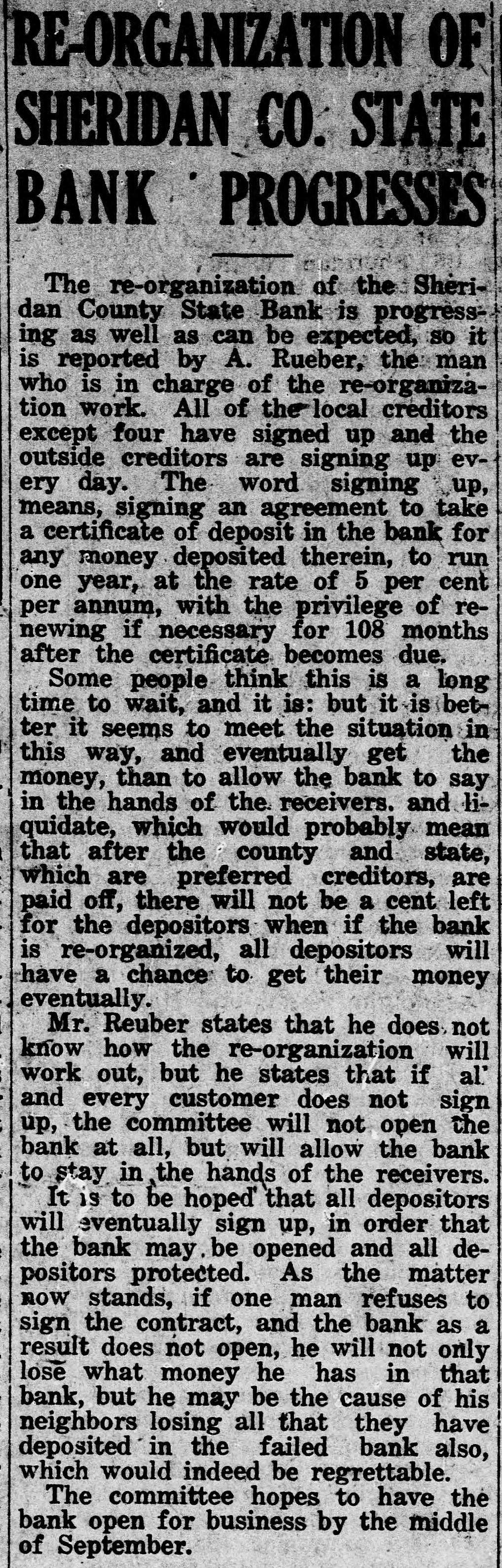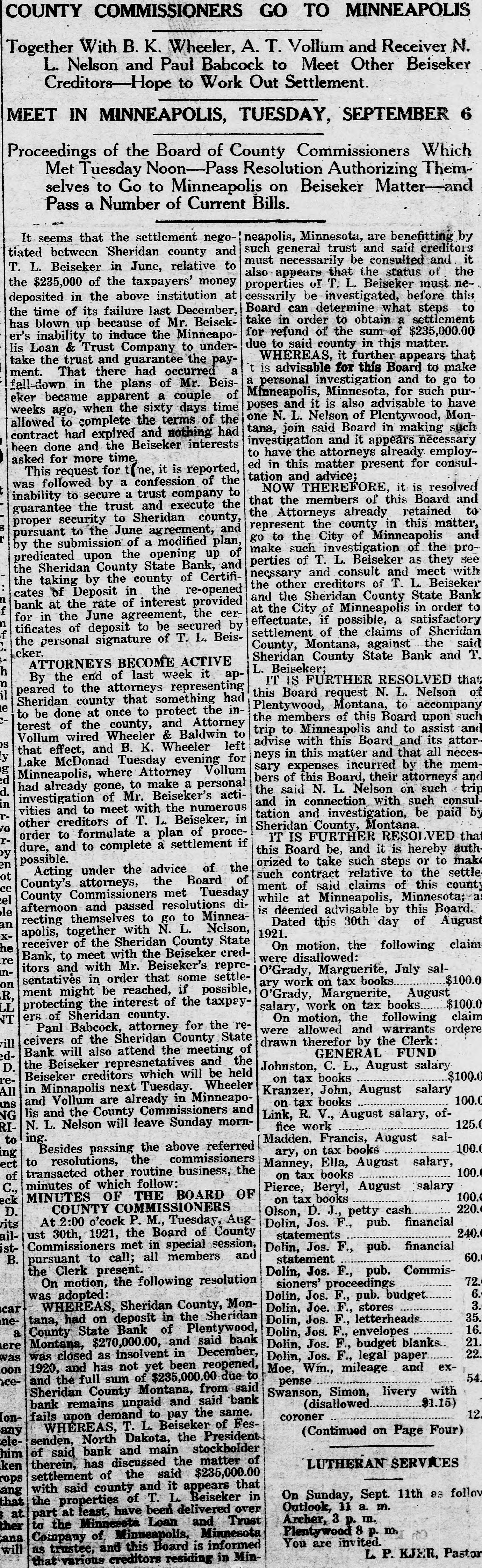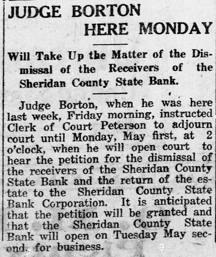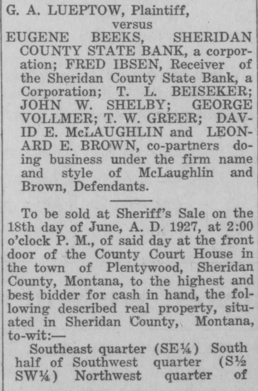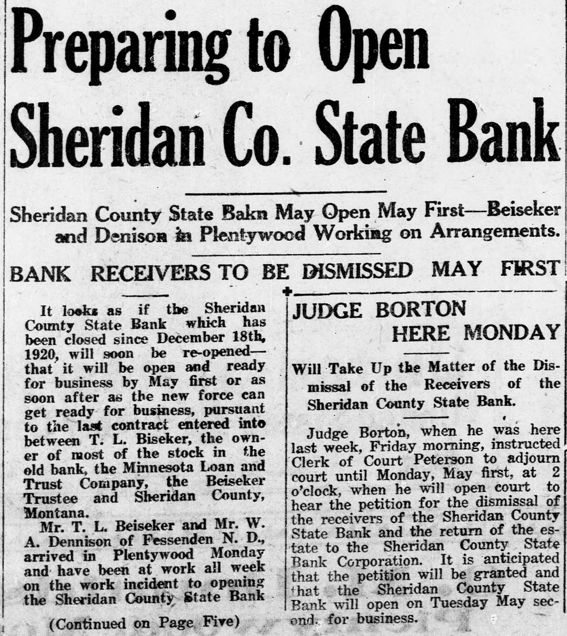 CLOSED BY EXAMINERS Rumors Indicate Reasons Other Than Money Stringency-Has Big County Deposits Producers News-The Sheridan County State Bank failed Saturday. The State Bank examiners arrived in Plentywood, coming from Scobey last Friday afternoon and commenced examining the books of that bank and at 10:00 o'clock Saturday morning, a had made exafter quite heavy number deposits, of people the aminers put up a sign written on the bank stationery, in the glass of the door with the information "Run Short of Money, Bank Closed for Today," but with no signature on the notice. The news spread rapdily about town, but most people did not worry, that reserve run low and curthinking that by the Monday morning had rency would be on hand and that the bank would open again for business. In the meantime the wildest sort of rumors were set afloat and before night it was claimed that the condition of the bank was very serious. The fact of the closing of the bank simply dumfounded the people because was on hardly of yet the dry fact that articles the published ink in the press of the state by Bank Examiner McGraw stating that the banks of the state were in splendid condition and that the total reserve of the banks in the state had increased over two millions of dollars, and because of the fact that the banks of Sheridan county had only been examined about a month ago, everybody in Sheridan county was resting easy, having implicit faith in the state bank department. Hundreds of local people have their all in the closed bank, and the failure of that institution has cast a dark cloud over the holiday season in Sheridan county. The closing of the Sheridan County State Bank came as a thunderbolt out of a clear sky as that institution was considered one of the strongest banks in eastern Montana. Depositors Will Be Paid W It was announced by employees of f the bank Wednesday that T. L. Beisti of the bank of Fesa N. D., he senden, eker, president telegraphed that that all would see to it the in would be paid a that the depositors It is personally rumored off bank in full. has been looted and that the books and records of the bank have been altered and falsified to disguise the unlawful transactions. It is rumored that while the county has $265,000 on deposit in the closed bank, the examiners discovered that the bank books showed that there was only $75,000 credited to the county in the bank. McGraw Arrives The conditions existing are so serous that State Bank Examiner McGraw himself came to Plentywood Wednesday morning on the train to ake personal charge of the bank, While it is claimed that the bank vill be re-organized by officers of the ank, this is generally doubted by he general public because of the tringent financial conditions of the puntry generally. County Badly Involved It also seems that the sinking fund f Sheridan county is badly involved S it is alleged that $265,000 of that und is in that bank. It is reported at the county bank held a surety ond for the closed bank in the sum : $125,000 and a personal bond gned by T. L. Beiseker and L. G. eidler in the sum of $50,000, and cond bond in the same amount gned by the same parties and a ird bond in the sum of $50,000 ed in October, signed by T. L. Beiser and Cashier C. J. Beiseker, hich was supposed to be a tempory bond for use during the flush ason. It is alleged that the bondsen are in for a loss, and it is rumed that County Treasurer Movius d his bondsmen are also legally reonsible because of the fact that he si violated the law in placing the mount of money that he has in one nk, and it is also claimed on good thority that the county commisners and the county attorney are o jointly liable for any loss that : county may sustain by reason of ir neglect in complying with the v and in seeing that the law is comed with. It seems very likely at this time t the county deposits are perfectsafe, and that the county will susno loss.