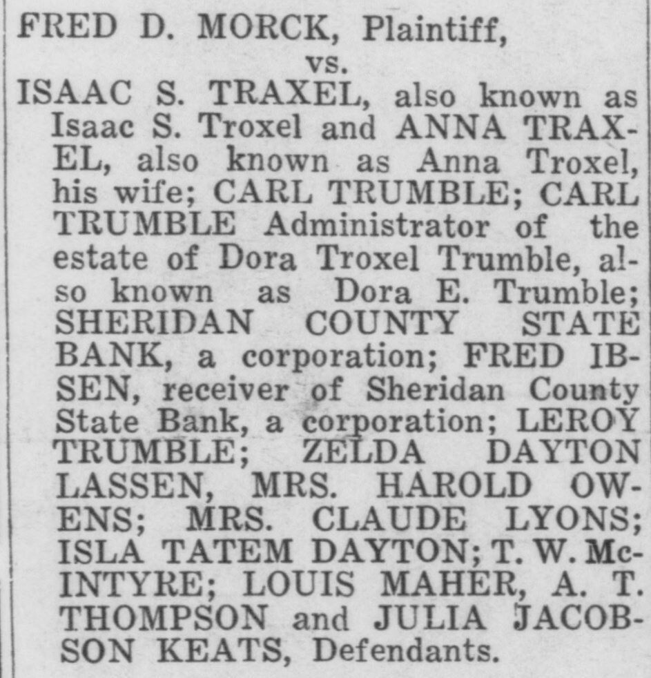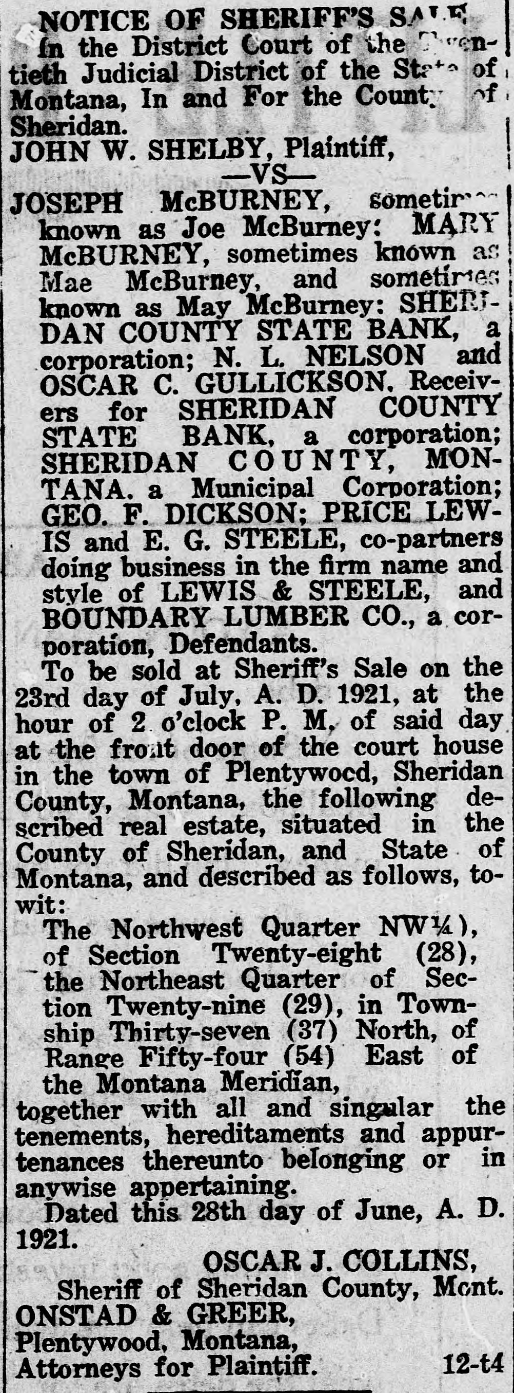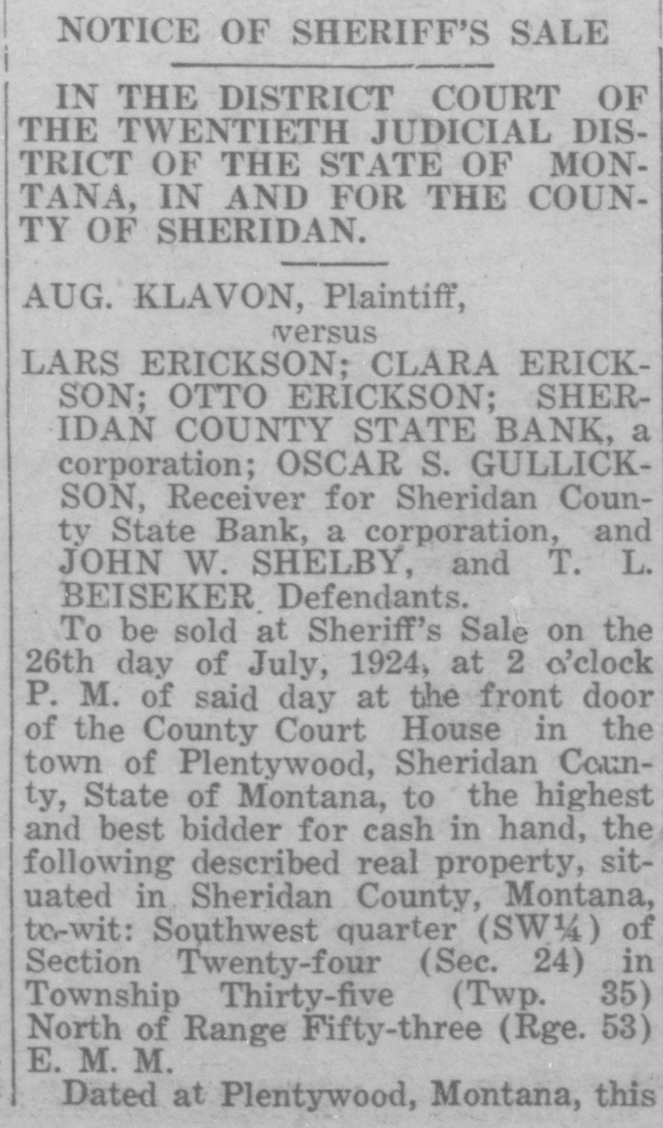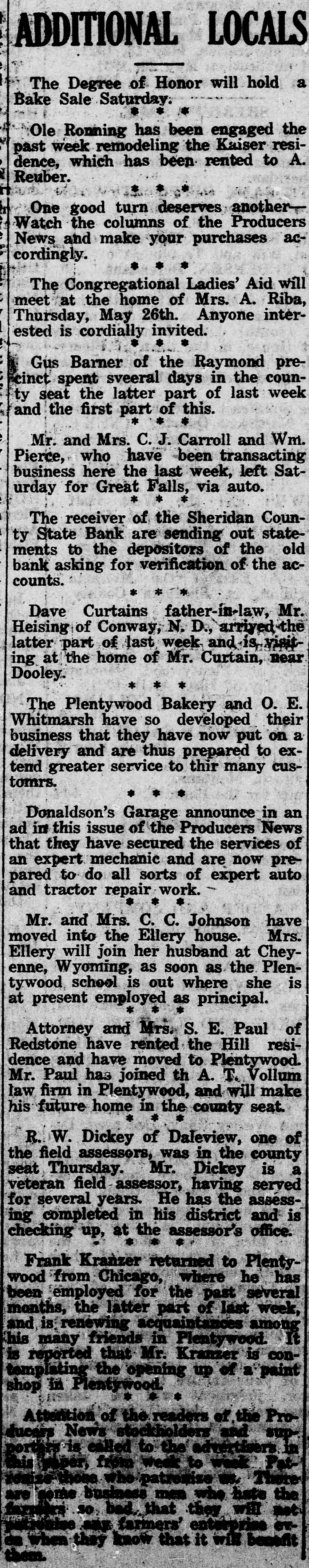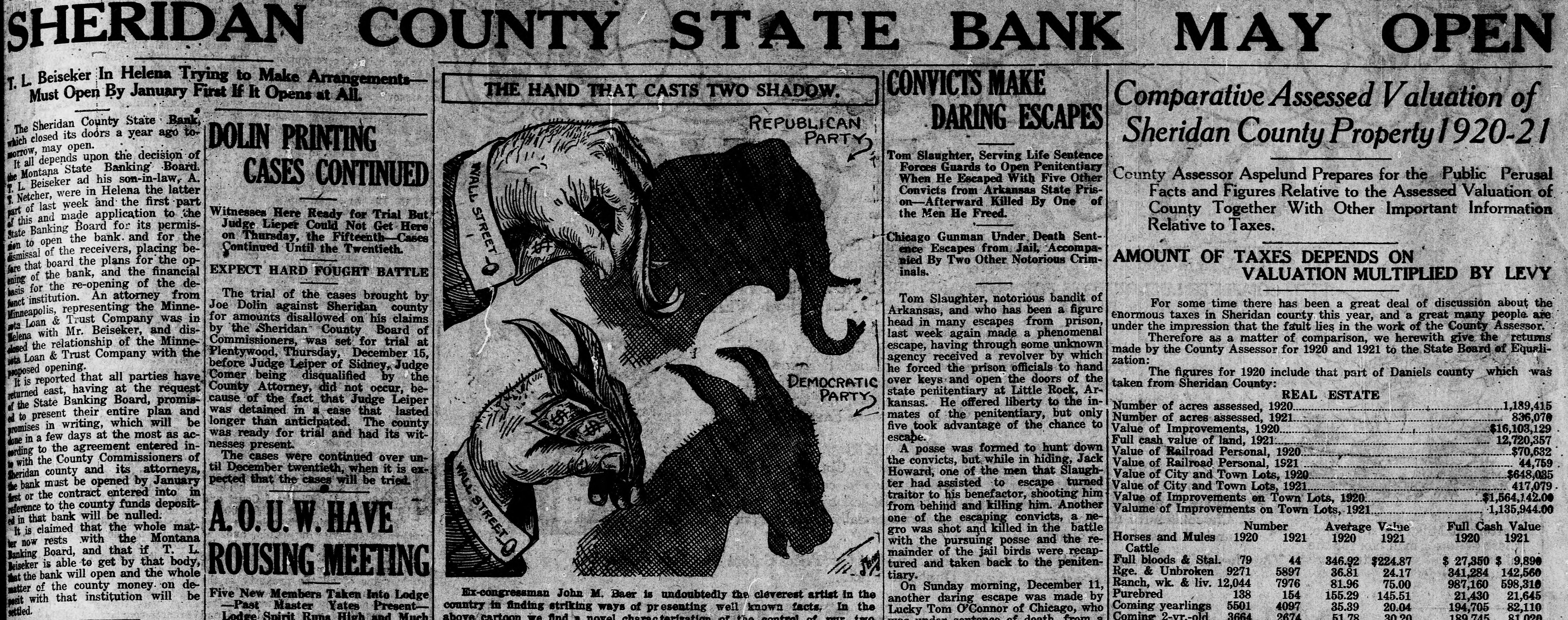 CLOSED BY EXAMINERS Rumors Indicate Reasons Other Than Money Stringency-Has Big County Deposits Producers News-The Sheridan County State Bank failed Saturday. The State Bank examiners arrived in Plentywood, coming from Scobey last Friday afternoon and commenced examining the books of that bank and at 10:00 o'clock Saturday morning, a had made exafter quite heavy number deposits, of people the aminers put up a sign written on the bank stationery, in the glass of the door with the information "Run Short of Money, Bank Closed for Today," but with no signature on the notice. The news spread rapdily about town, but most people did not worry, that reserve run low and curthinking that by the Monday morning had rency would be on hand and that the bank would open again for business. In the meantime the wildest sort of rumors were set afloat and before night it was claimed that the condition of the bank was very serious. The fact of the closing of the bank simply dumfounded the people because was on hardly of yet the dry fact that articles the published ink in the press of the state by Bank Examiner McGraw stating that the banks of the state were in splendid condition and that the total reserve of the banks in the state had increased over two millions of dollars, and because of the fact that the banks of Sheridan county had only been examined about a month ago, everybody in Sheridan county was resting easy, having implicit faith in the state bank department. Hundreds of local people have their all in the closed bank, and the failure of that institution has cast a dark cloud over the holiday season in Sheridan county. The closing of the Sheridan County State Bank came as a thunderbolt out of a clear sky as that institution was considered one of the strongest banks in eastern Montana. Depositors Will Be Paid W It was announced by employees of f the bank Wednesday that T. L. Beisti of the bank of Fesa N. D., he senden, eker, president telegraphed that that all would see to it the in would be paid a that the depositors It is personally rumored off bank in full. has been looted and that the books and records of the bank have been altered and falsified to disguise the unlawful transactions. It is rumored that while the county has $265,000 on deposit in the closed bank, the examiners discovered that the bank books showed that there was only $75,000 credited to the county in the bank. McGraw Arrives The conditions existing are so serous that State Bank Examiner McGraw himself came to Plentywood Wednesday morning on the train to ake personal charge of the bank, While it is claimed that the bank vill be re-organized by officers of the ank, this is generally doubted by he general public because of the tringent financial conditions of the puntry generally. County Badly Involved It also seems that the sinking fund f Sheridan county is badly involved S it is alleged that $265,000 of that und is in that bank. It is reported at the county bank held a surety ond for the closed bank in the sum : $125,000 and a personal bond gned by T. L. Beiseker and L. G. eidler in the sum of $50,000, and cond bond in the same amount gned by the same parties and a ird bond in the sum of $50,000 ed in October, signed by T. L. Beiser and Cashier C. J. Beiseker, hich was supposed to be a tempory bond for use during the flush ason. It is alleged that the bondsen are in for a loss, and it is rumed that County Treasurer Movius d his bondsmen are also legally reonsible because of the fact that he si violated the law in placing the mount of money that he has in one nk, and it is also claimed on good thority that the county commisners and the county attorney are o jointly liable for any loss that : county may sustain by reason of ir neglect in complying with the v and in seeing that the law is comed with. It seems very likely at this time t the county deposits are perfectsafe, and that the county will susno loss.