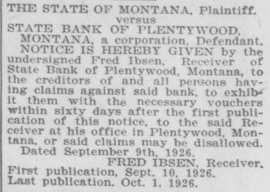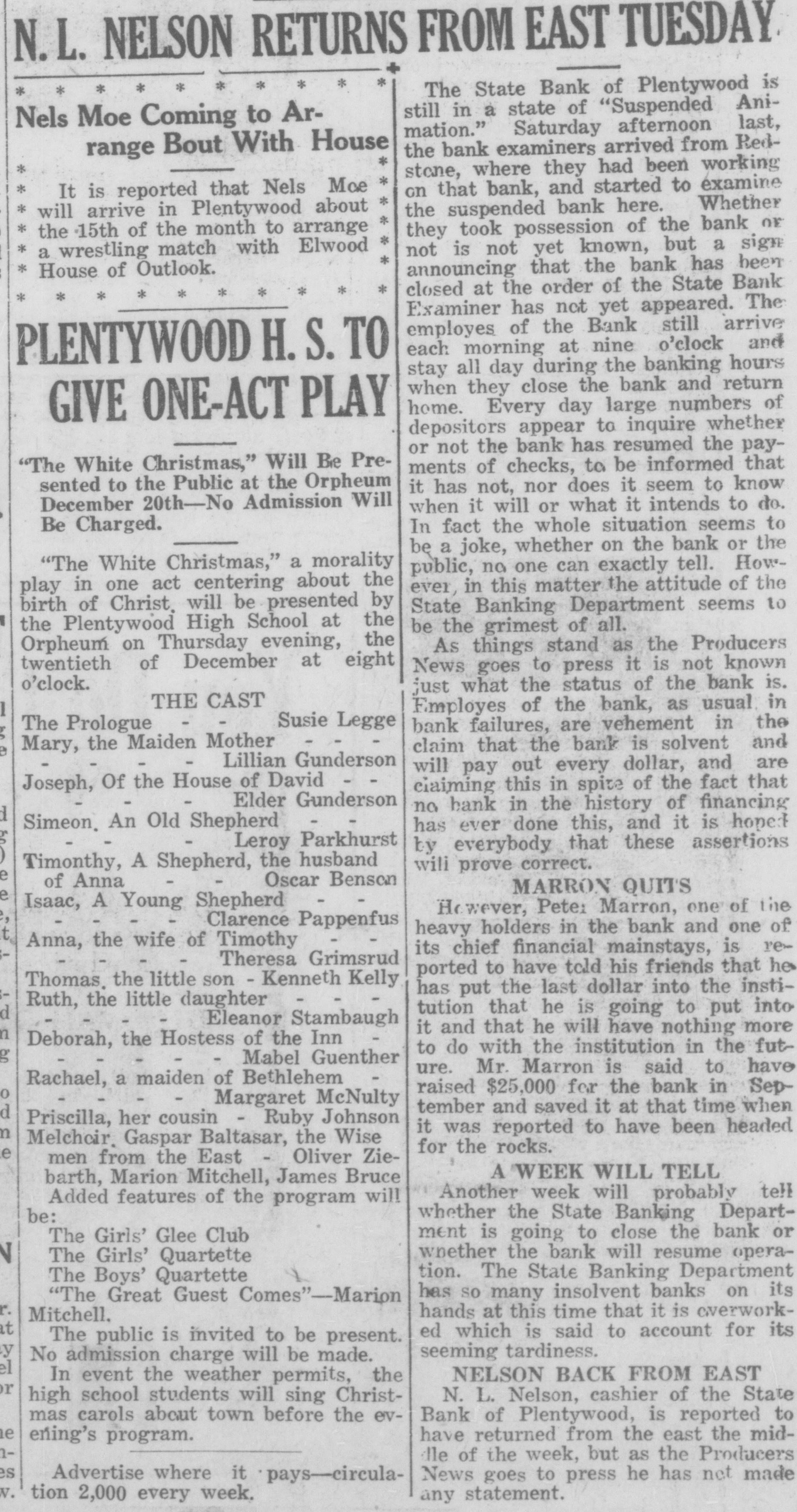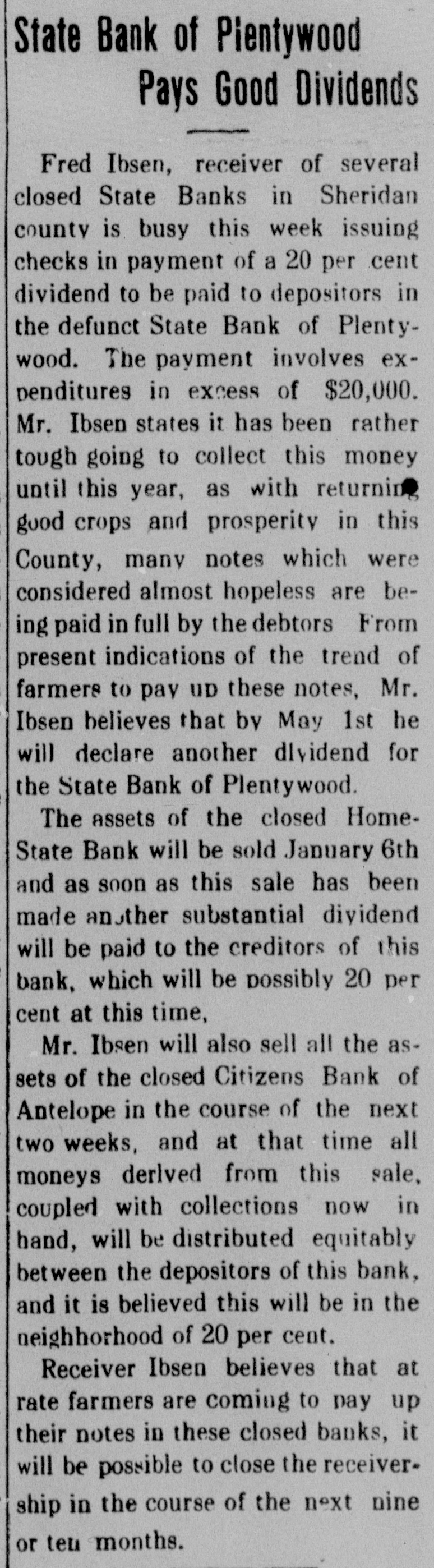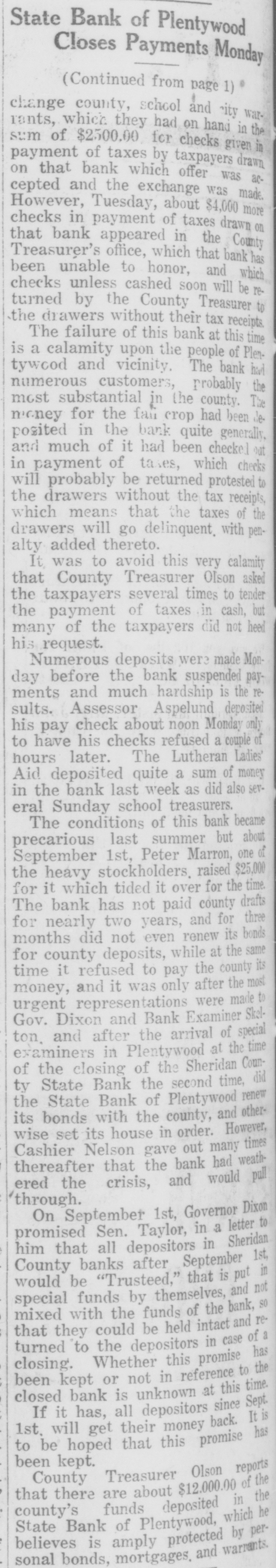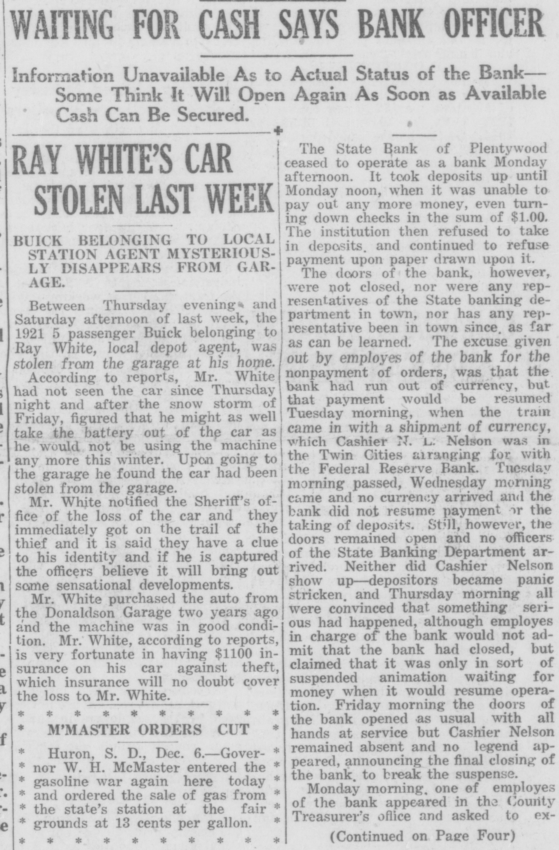 WAITING FOR CASH SAYS BANK OFFICER Information Unavailable As to Actual Status of the BankSome Think It Will Open Again Às Soon as Available Cash Can Be Secured. The State Bank of Plentywood ceased to operate as a bank Monday RAY WHITE'S CAR afternoon. It took deposits up until Monday noon, when it was unable to pay out any more money, even turnSTOLEN LAST WEEK ing down checks in the sum of $1.00. The institution then refused to take BUICK BELONGING TO LOCAL in deposits. and continued to refuse STATION AGENT MYSTERIOUSpayment upon paper drawn upon it. LY DISAPPEARS FROM GARThe doors of the bank, however, AGE. were not closed, nor were any representatives of the State banking deBetween Thursday evening and partment in town, nor has any repSaturday afternoon of last week, the resentative been in town since. as far 1921 5 passenger Buick belonging to as can be learned. The excuse given Ray White, local depot agent, was out by employes of the bank for the stolen from the garage at his home. nonpayment of orders, was that the According to reports, Mr. White bank had run out of currency, but had not seen the car since Thursday that payment would be resumed night and after the snow storm of Tuesday morning, when the train Friday, figured that he might as well came in with a shipment of currency, take the battery out of the car as which Cashier N. L. Nelson was in he would not be using the machine the Twin Cities arranging for with any more this winter. Upon going to the Federal Reserve Bank. Tuesday the garage he found the car had been morning passed, Wednesday morning stolen from the garage. came and no currency arrived and the Mr. White notified the Sheriff's ofbank did not resume payment or the fice of the loss of the car and they taking of deposits. Still, however, the immediately got on the trail of the doors remained open and no officers thief and it is said they have a clue of the State Banking Department arto his identity and if he is captured rived. Neither did Cashier Nelson the officers believe it will bring out show up-depositors became panic same sensational developments. stricken. and Thursday morning all Mr. White purchased the auto from were convinced that something serithe Donaldson Garage two years ago ous had happened, although employes and the machine was in good condiin charge of the bank would not adtion. Mr. White, according to reports, mit that the bank had closed, but is very fortunate in having $1100 inclaimed that it was only in sort of surance on his car against theft, suspended animation waiting for which insurance will no doubt cover money when it would resume operathe loss to Mr. White. tion. Friday morning the doors of * * * * the bank opened as usual with all M'MASTER ORDERS CUT hands at service but Cashier Nelson remained absent and no legend ap* Huron, S. D., Dec. 6.-Gover* * peared, announcing the final closing of nor W. H. McMaster entered the * the bank. to break the suspense. gasoline war again here today * Monday morning, one of employes and ordered the sale of gas from of the bank appeared in the County * the state's station at the fair Treasurer's oflice and asked to ex* grounds at 13 cents per gallon. e (Continued on Page Four) * * *