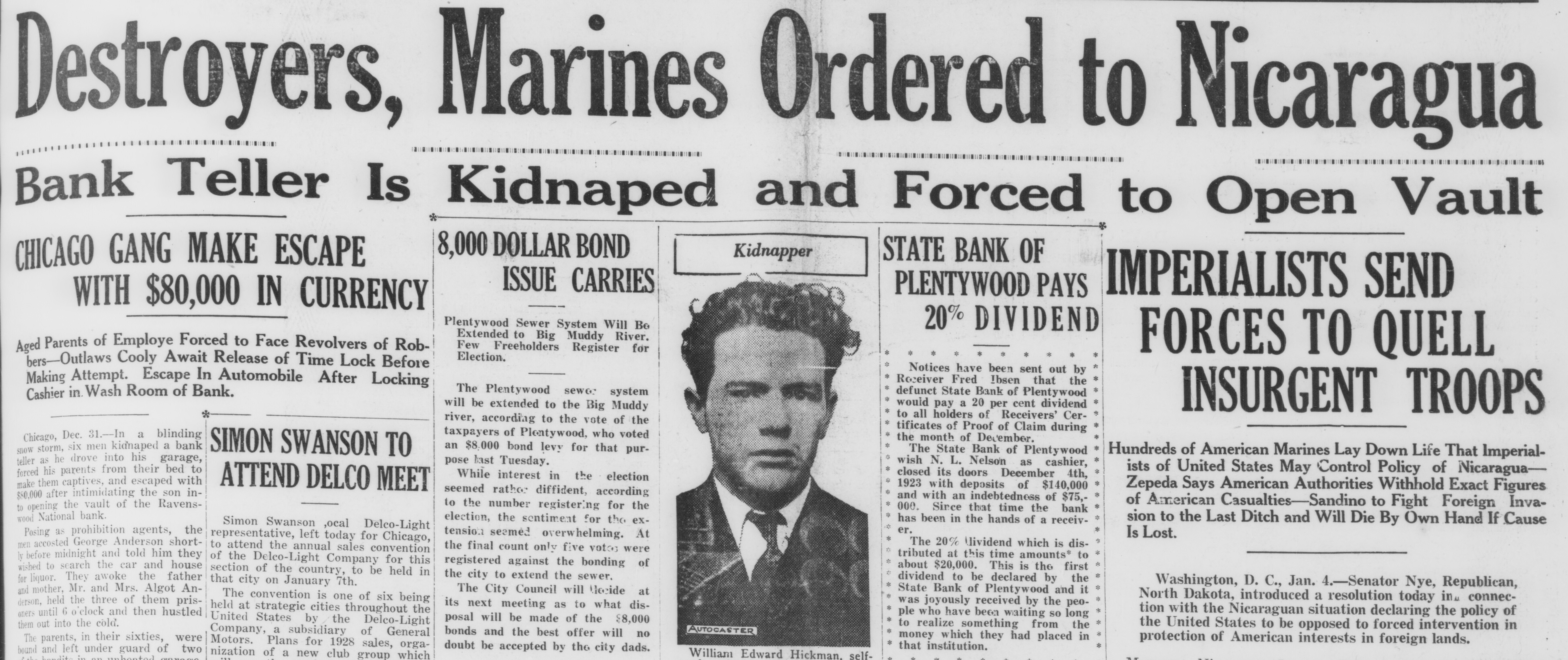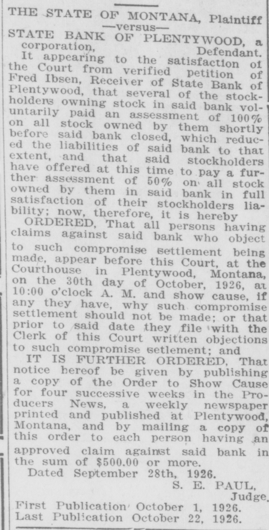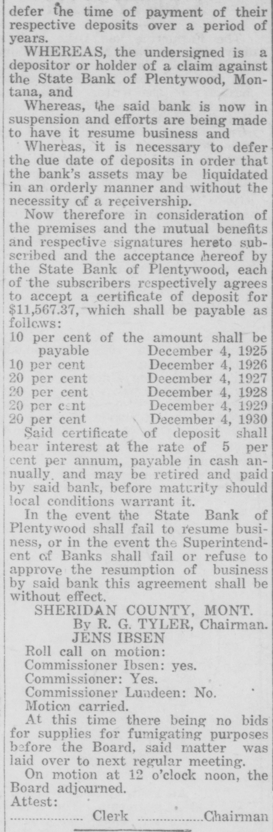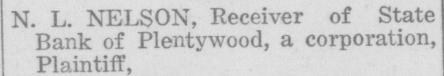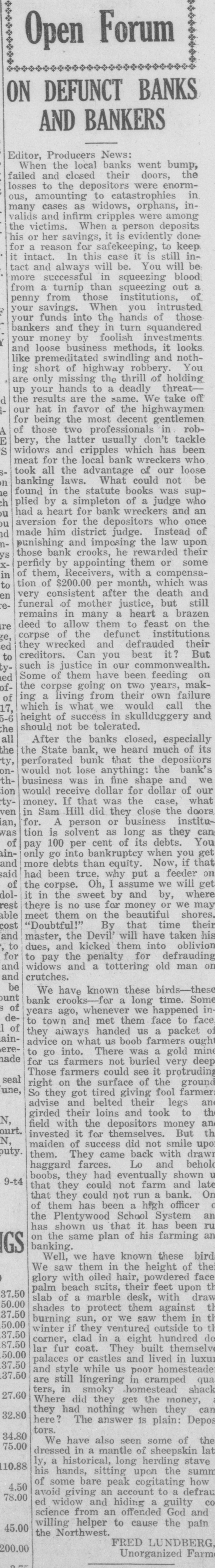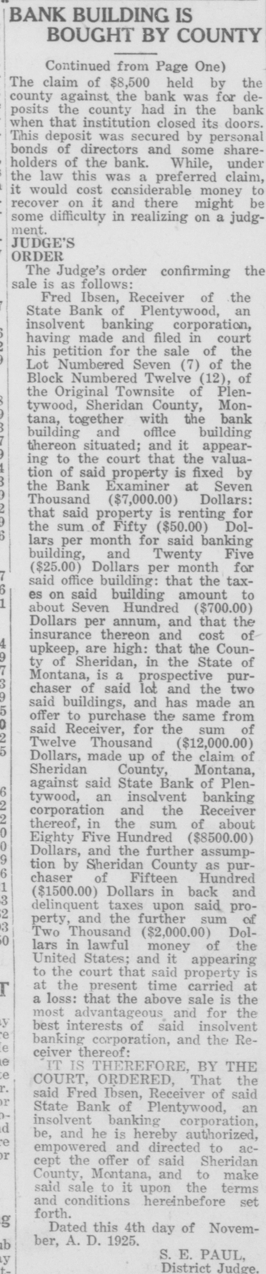 WAITING FOR CASH SAYS BANK OFFICER Information Unavailable As to Actual Status of the BankSome Think It Will Open Again Às Soon as Available Cash Can Be Secured. The State Bank of Plentywood ceased to operate as a bank Monday RAY WHITE'S CAR afternoon. It took deposits up until Monday noon, when it was unable to pay out any more money, even turnSTOLEN LAST WEEK ing down checks in the sum of $1.00. The institution then refused to take BUICK BELONGING TO LOCAL in deposits. and continued to refuse STATION AGENT MYSTERIOUSpayment upon paper drawn upon it. LY DISAPPEARS FROM GARThe doors of the bank, however, AGE. were not closed, nor were any representatives of the State banking deBetween Thursday evening and partment in town, nor has any repSaturday afternoon of last week, the resentative been in town since. as far 1921 5 passenger Buick belonging to as can be learned. The excuse given Ray White, local depot agent, was out by employes of the bank for the stolen from the garage at his home. nonpayment of orders, was that the According to reports, Mr. White bank had run out of currency, but had not seen the car since Thursday that payment would be resumed night and after the snow storm of Tuesday morning, when the train Friday, figured that he might as well came in with a shipment of currency, take the battery out of the car as which Cashier N. L. Nelson was in he would not be using the machine the Twin Cities arranging for with any more this winter. Upon going to the Federal Reserve Bank. Tuesday the garage he found the car had been morning passed, Wednesday morning stolen from the garage. came and no currency arrived and the Mr. White notified the Sheriff's ofbank did not resume payment or the fice of the loss of the car and they taking of deposits. Still, however, the immediately got on the trail of the doors remained open and no officers thief and it is said they have a clue of the State Banking Department arto his identity and if he is captured rived. Neither did Cashier Nelson the officers believe it will bring out show up-depositors became panic same sensational developments. stricken. and Thursday morning all Mr. White purchased the auto from were convinced that something serithe Donaldson Garage two years ago ous had happened, although employes and the machine was in good condiin charge of the bank would not adtion. Mr. White, according to reports, mit that the bank had closed, but is very fortunate in having $1100 inclaimed that it was only in sort of surance on his car against theft, suspended animation waiting for which insurance will no doubt cover money when it would resume operathe loss to Mr. White. tion. Friday morning the doors of * * * * the bank opened as usual with all M'MASTER ORDERS CUT hands at service but Cashier Nelson remained absent and no legend ap* Huron, S. D., Dec. 6.-Gover* * peared, announcing the final closing of nor W. H. McMaster entered the * the bank. to break the suspense. gasoline war again here today * Monday morning, one of employes and ordered the sale of gas from of the bank appeared in the County * the state's station at the fair Treasurer's oflice and asked to ex* grounds at 13 cents per gallon. e (Continued on Page Four) * * *