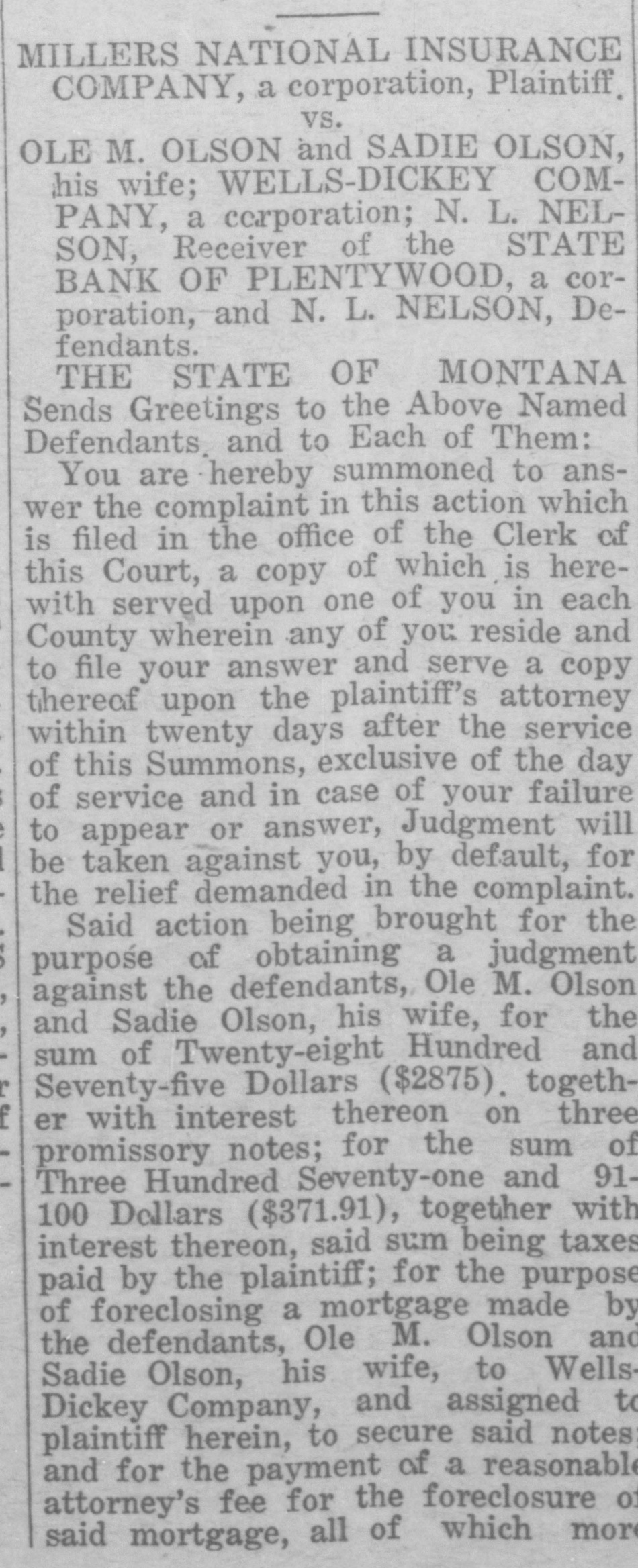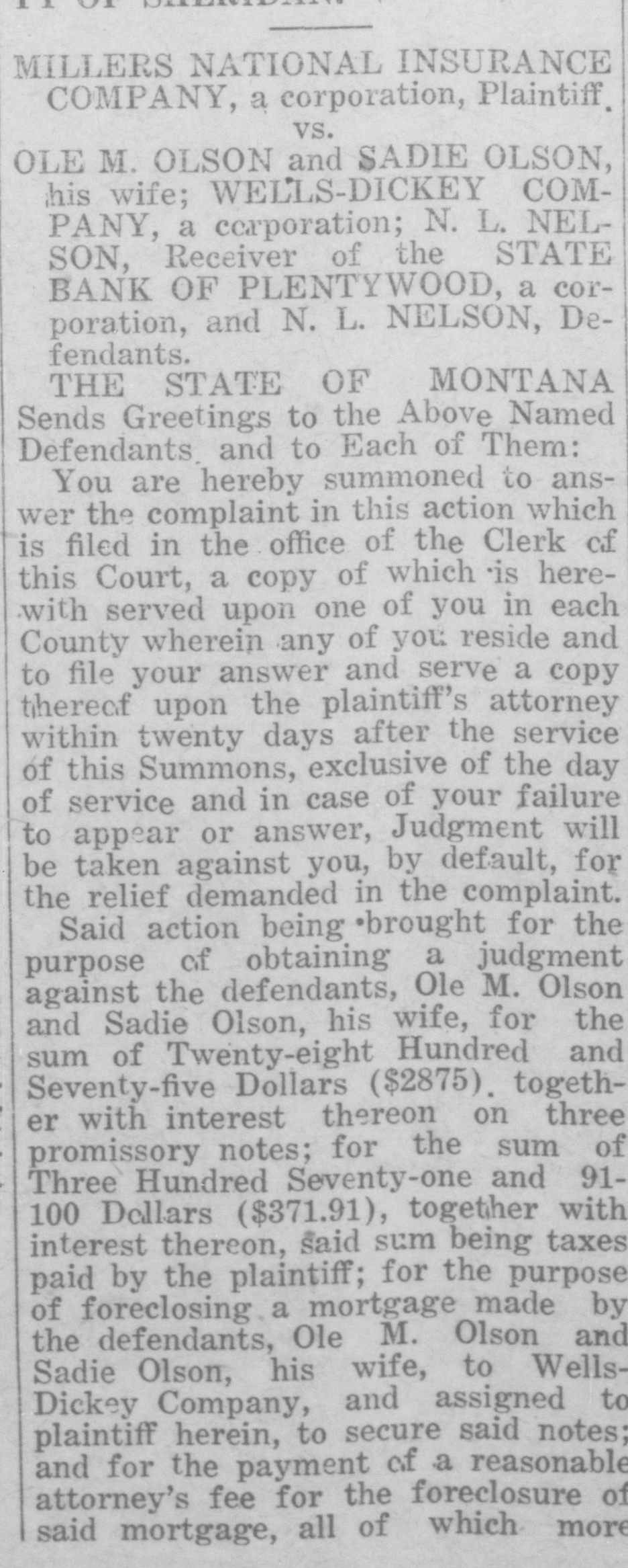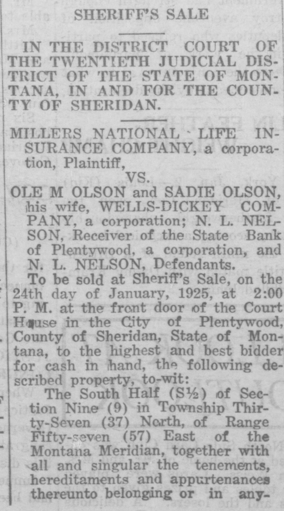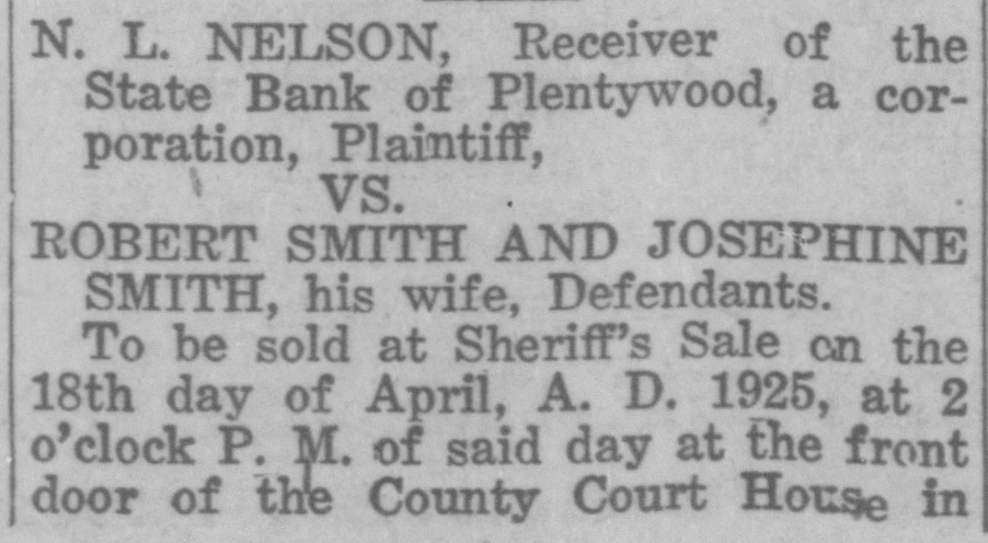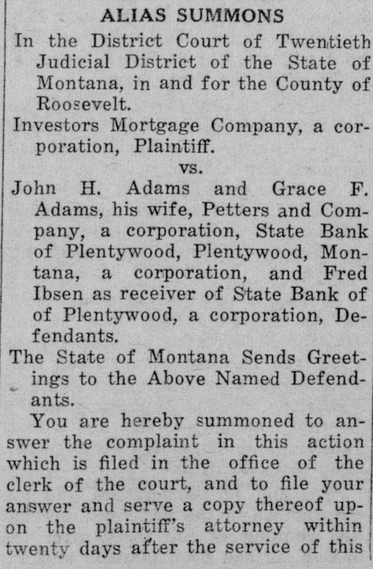WAITING FOR CASH SAYS BANK OFFICER Information Unavailable As to Actual Status of the BankSome Think It Will Open Again Às Soon as Available Cash Can Be Secured. The State Bank of Plentywood ceased to operate as a bank Monday RAY WHITE'S CAR afternoon. It took deposits up until Monday noon, when it was unable to pay out any more money, even turnSTOLEN LAST WEEK ing down checks in the sum of $1.00. The institution then refused to take BUICK BELONGING TO LOCAL in deposits. and continued to refuse STATION AGENT MYSTERIOUSpayment upon paper drawn upon it. LY DISAPPEARS FROM GARThe doors of the bank, however, AGE. were not closed, nor were any representatives of the State banking deBetween Thursday evening and partment in town, nor has any repSaturday afternoon of last week, the resentative been in town since. as far 1921 5 passenger Buick belonging to as can be learned. The excuse given Ray White, local depot agent, was out by employes of the bank for the stolen from the garage at his home. nonpayment of orders, was that the According to reports, Mr. White bank had run out of currency, but had not seen the car since Thursday that payment would be resumed night and after the snow storm of Tuesday morning, when the train Friday, figured that he might as well came in with a shipment of currency, take the battery out of the car as which Cashier N. L. Nelson was in he would not be using the machine the Twin Cities arranging for with any more this winter. Upon going to the Federal Reserve Bank. Tuesday the garage he found the car had been morning passed, Wednesday morning stolen from the garage. came and no currency arrived and the Mr. White notified the Sheriff's ofbank did not resume payment or the fice of the loss of the car and they taking of deposits. Still, however, the immediately got on the trail of the doors remained open and no officers thief and it is said they have a clue of the State Banking Department arto his identity and if he is captured rived. Neither did Cashier Nelson the officers believe it will bring out show up-depositors became panic same sensational developments. stricken. and Thursday morning all Mr. White purchased the auto from were convinced that something serithe Donaldson Garage two years ago ous had happened, although employes and the machine was in good condiin charge of the bank would not adtion. Mr. White, according to reports, mit that the bank had closed, but is very fortunate in having $1100 inclaimed that it was only in sort of surance on his car against theft, suspended animation waiting for which insurance will no doubt cover money when it would resume operathe loss to Mr. White. tion. Friday morning the doors of * * * * the bank opened as usual with all M'MASTER ORDERS CUT hands at service but Cashier Nelson remained absent and no legend ap* Huron, S. D., Dec. 6.-Gover* * peared, announcing the final closing of nor W. H. McMaster entered the * the bank. to break the suspense. gasoline war again here today * Monday morning, one of employes and ordered the sale of gas from of the bank appeared in the County * the state's station at the fair Treasurer's oflice and asked to ex* grounds at 13 cents per gallon. e (Continued on Page Four) * * *