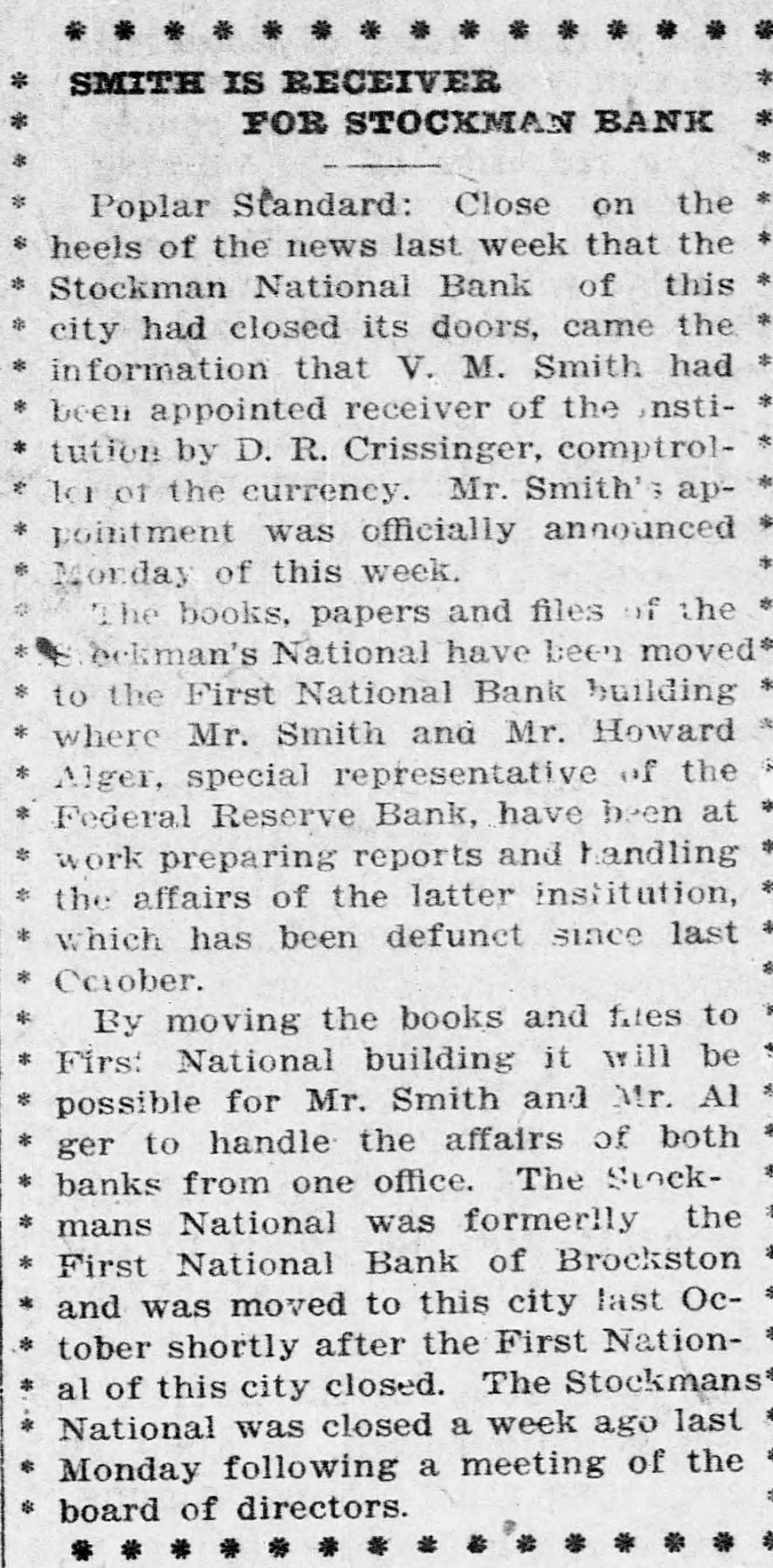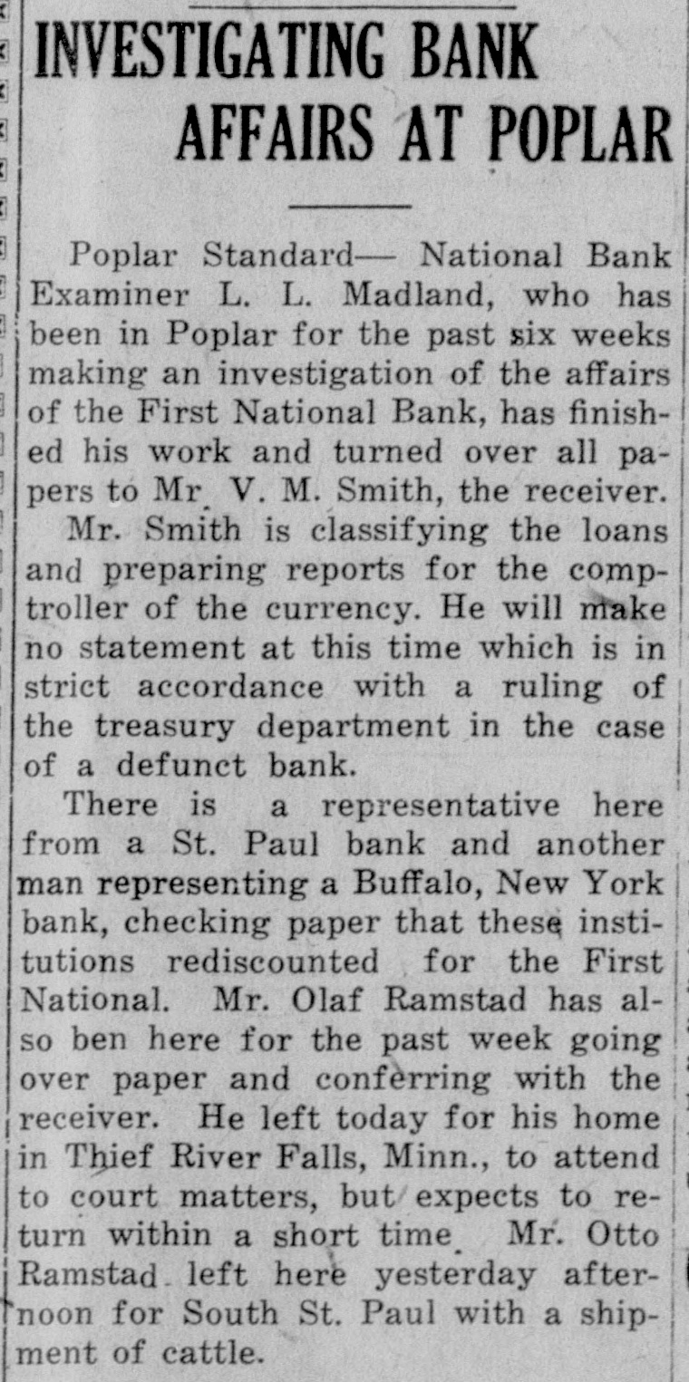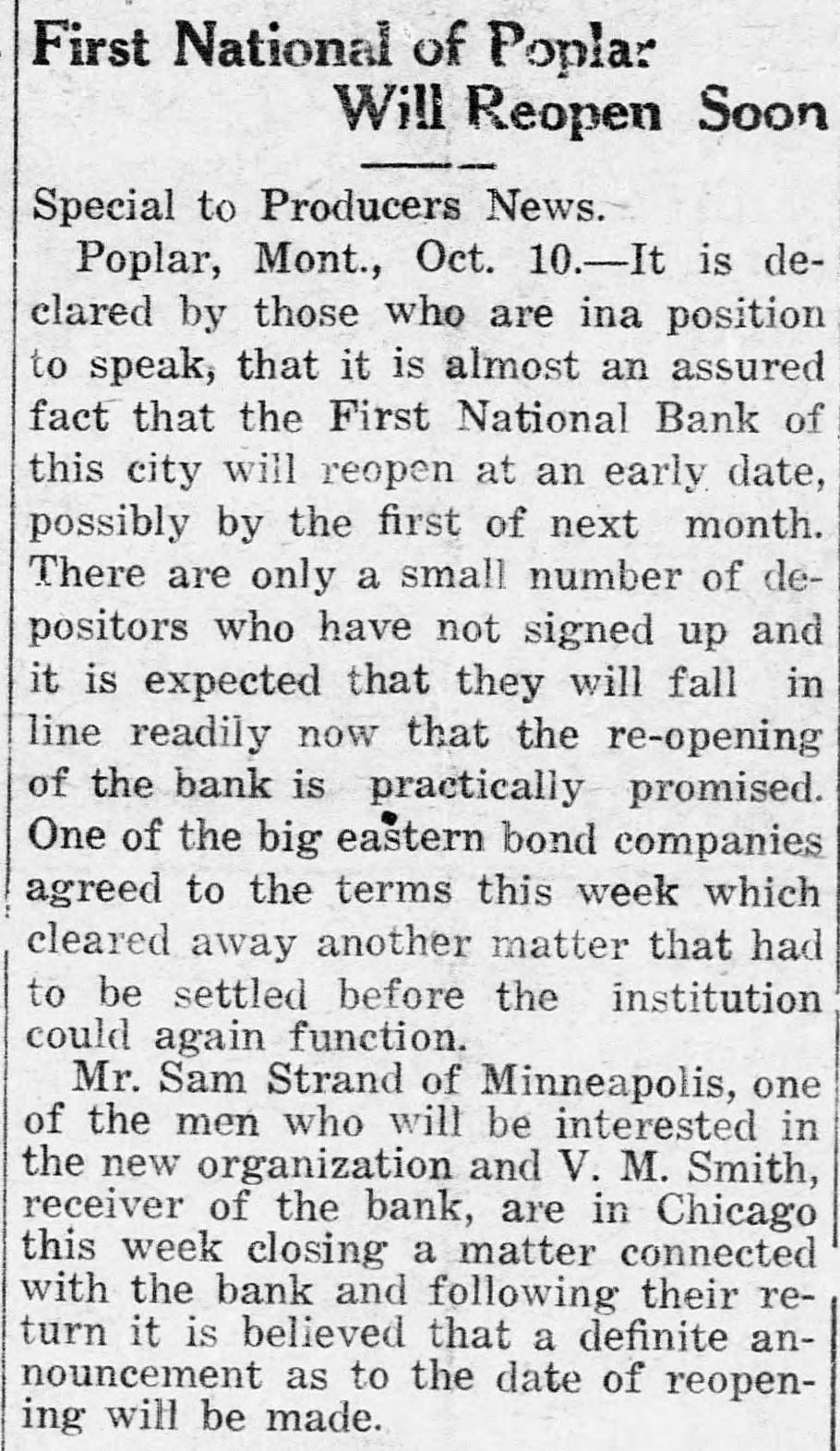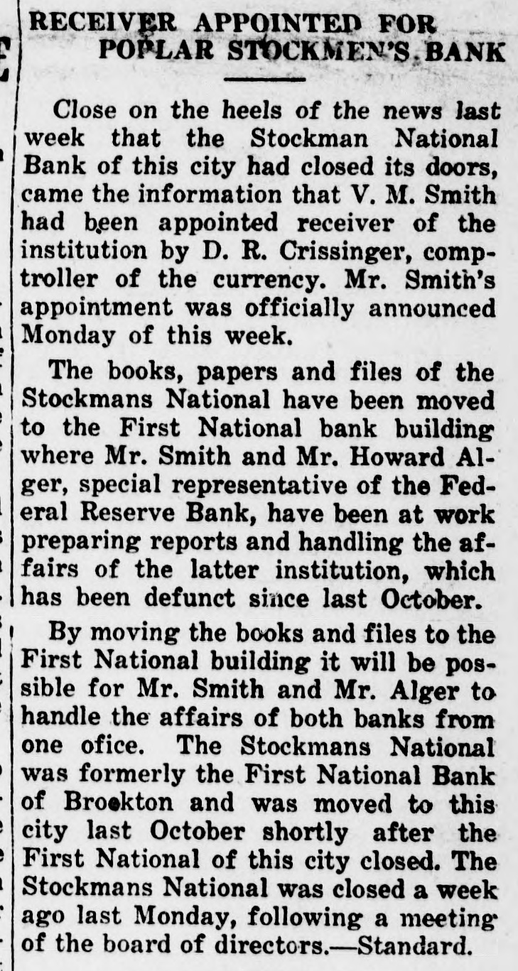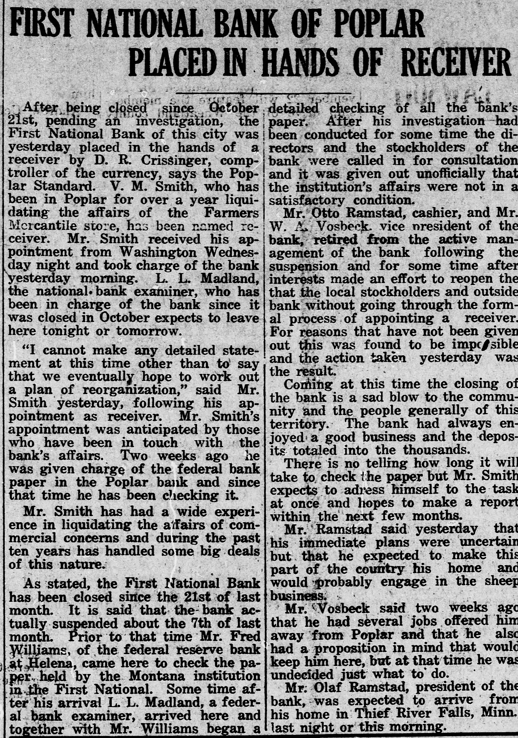 FIRST NATIONAL BANK OF POPLAR PLACED IN HANDS OF RECEIVER After being closed since October detailed checking of all the bank's 21st, pending an investigation, the paper. After his investigation had been conducted for some time the diFirst National Bank of this city was rectors and the stockholders of the yesterday placed in the hands of a bank were called in for consultation receiver by D. R. Crissinger, comptroller of the currency, says the Popand it was given out unofficially that the institution's affairs were not in a lar Standard. V. M. Smith, who has been in Poplar for over a year liquisatisfactory condition. dating the affairs of the Farmers Mr. Otto Ramstad, cashier, and Mr. W. A Vosbeck. vice president of the Mcrcantile store, has been named receiver. Mr. Smith received his apbank, retired from the active manpointment from Washington Wednesagement of the bank following the day night and took charge of the bank suspension and for some time after interests made an effort to reopen the yesterday morning. L. L. Madland, that the local stockholders and outside the national. bank examiner, who has been in charge of the bank since it bank without going through the formwas closed in October expects to leave al process of appointing a receiver. For reasons that have not been given here tonight or tomorrow. out this was found to be imposible "I cannot make any detailed stateand the action taken yesterday was ment at this time other than to say the result. that we eventually hope to work out Coming at this time the closing of a plan of reorganization," said Mr. the bank is a sad blow to the commuSmith yesterday, following his apnity and the people generally of this pointment as receiver. Mr. Smith's territory. The bank had always enappointment was anticipated by those joyed a good business and the deposwho have been in touch with the its totaled into the thousands. bank's affairs. Two weeks ago he There is no telling how long it will was given charge of the federal bank take to check the paper but Mr. Smith paper in the Poplar bank and since expects to adress himself to the task that time he has been checking it. at once and hopes to make a report Mr. Smith has had a wide experiwithin the next few months. ence in liquidating the affairs of comMr. Ramstad said yesterday that mercial concerns and during the past his immediate plans were uncertain ten years has handled some big deals but that he expected to make this of this nature. part of the country his home and would probably engage in the sheep As stated, the First National Bank business. has been closed since the 21st of last Mr. Vosbeck said two weeks ago month. It is said that the- bank acthat he had several jobs offered him tually suspended about the 7th of last month. Prior to that time Mr. Fred away from Poplar and that he also had a proposition in mind that would Williams, of the federal reserve bank keep him here, but at that time he was at Helena, came here to check the paundecided just what to do. per. held by the Montana institution Mr. Olaf Ramstad, president of the in the First National. Some time afbank, was expected to arrive from ter his arrival L. L. Madland, a federhis home in Thief River Falls, Minn. al bank examiner, arrived here and last night or this morning. together with Mr. Williams began a