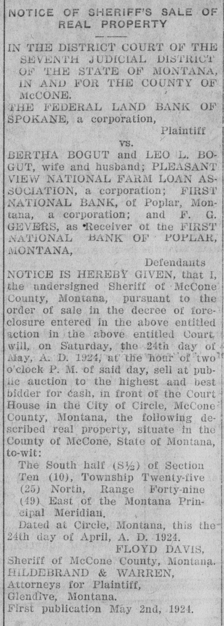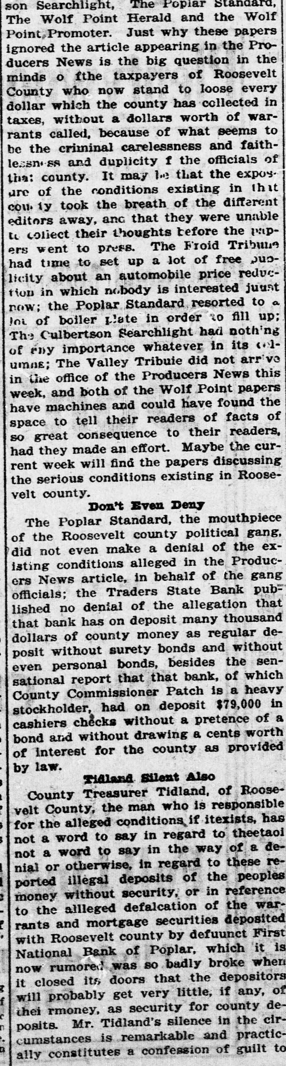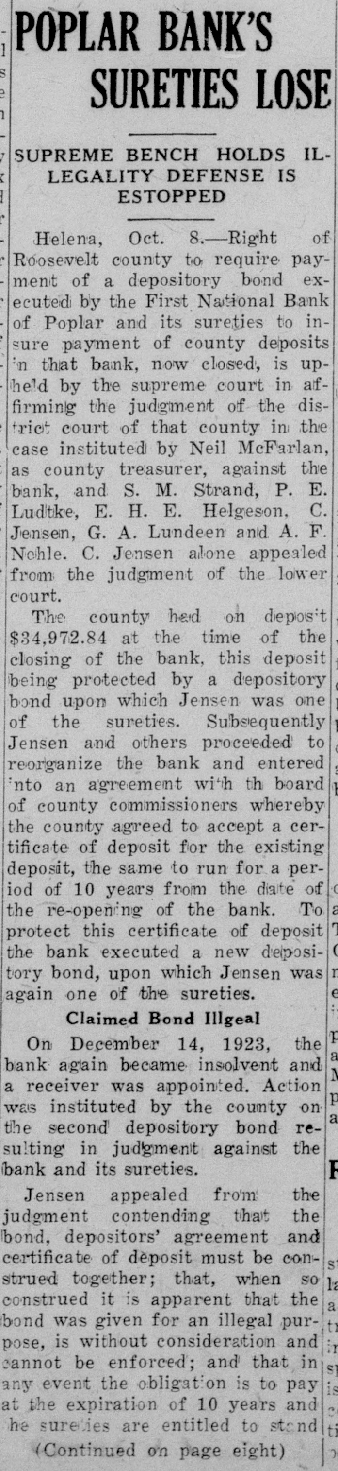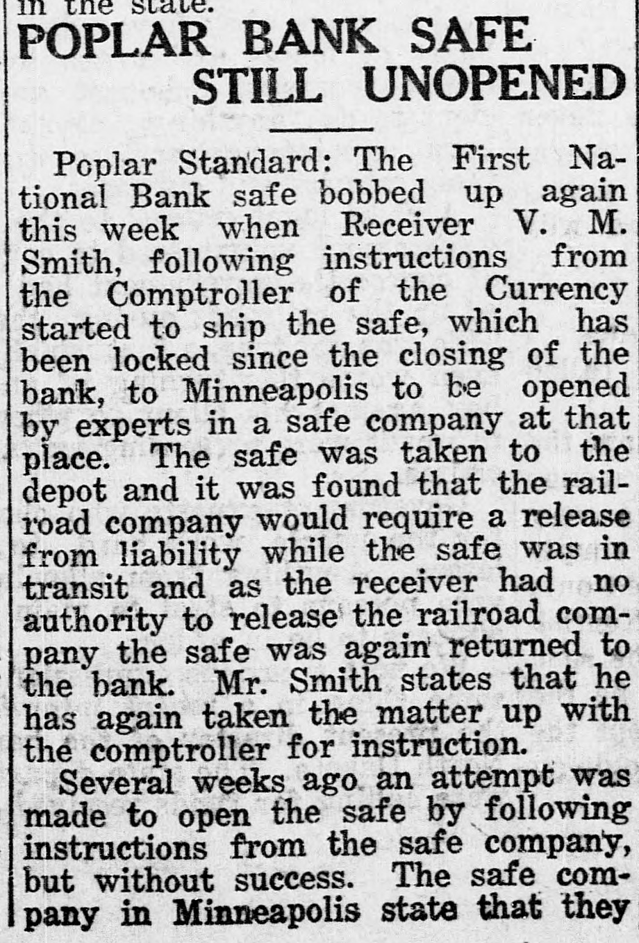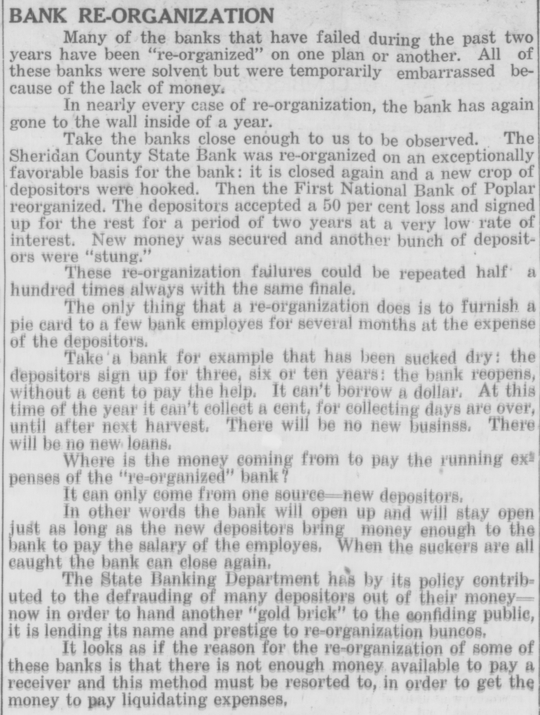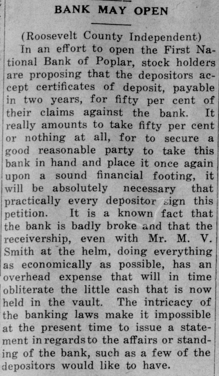 FIRST NATIONAL BANK OF POPLAR PLACED IN HANDS OF RECEIVER After being closed since October detailed checking of all the bank's 21st, pending an investigation, the paper. After his investigation had been conducted for some time the diFirst National Bank of this city was rectors and the stockholders of the yesterday placed in the hands of a bank were called in for consultation receiver by D. R. Crissinger, comptroller of the currency, says the Popand it was given out unofficially that the institution's affairs were not in a lar Standard. V. M. Smith, who has been in Poplar for over a year liquisatisfactory condition. dating the affairs of the Farmers Mr. Otto Ramstad, cashier, and Mr. W. A Vosbeck. vice president of the Mcrcantile store, has been named receiver. Mr. Smith received his apbank, retired from the active manpointment from Washington Wednesagement of the bank following the day night and took charge of the bank suspension and for some time after interests made an effort to reopen the yesterday morning. L. L. Madland, that the local stockholders and outside the national. bank examiner, who has been in charge of the bank since it bank without going through the formwas closed in October expects to leave al process of appointing a receiver. For reasons that have not been given here tonight or tomorrow. out this was found to be imposible "I cannot make any detailed stateand the action taken yesterday was ment at this time other than to say the result. that we eventually hope to work out Coming at this time the closing of a plan of reorganization," said Mr. the bank is a sad blow to the commuSmith yesterday, following his apnity and the people generally of this pointment as receiver. Mr. Smith's territory. The bank had always enappointment was anticipated by those joyed a good business and the deposwho have been in touch with the its totaled into the thousands. bank's affairs. Two weeks ago he There is no telling how long it will was given charge of the federal bank take to check the paper but Mr. Smith paper in the Poplar bank and since expects to adress himself to the task that time he has been checking it. at once and hopes to make a report Mr. Smith has had a wide experiwithin the next few months. ence in liquidating the affairs of comMr. Ramstad said yesterday that mercial concerns and during the past his immediate plans were uncertain ten years has handled some big deals but that he expected to make this of this nature. part of the country his home and would probably engage in the sheep As stated, the First National Bank business. has been closed since the 21st of last Mr. Vosbeck said two weeks ago month. It is said that the- bank acthat he had several jobs offered him tually suspended about the 7th of last month. Prior to that time Mr. Fred away from Poplar and that he also had a proposition in mind that would Williams, of the federal reserve bank keep him here, but at that time he was at Helena, came here to check the paundecided just what to do. per. held by the Montana institution Mr. Olaf Ramstad, president of the in the First National. Some time afbank, was expected to arrive from ter his arrival L. L. Madland, a federhis home in Thief River Falls, Minn. al bank examiner, arrived here and last night or this morning. together with Mr. Williams began a