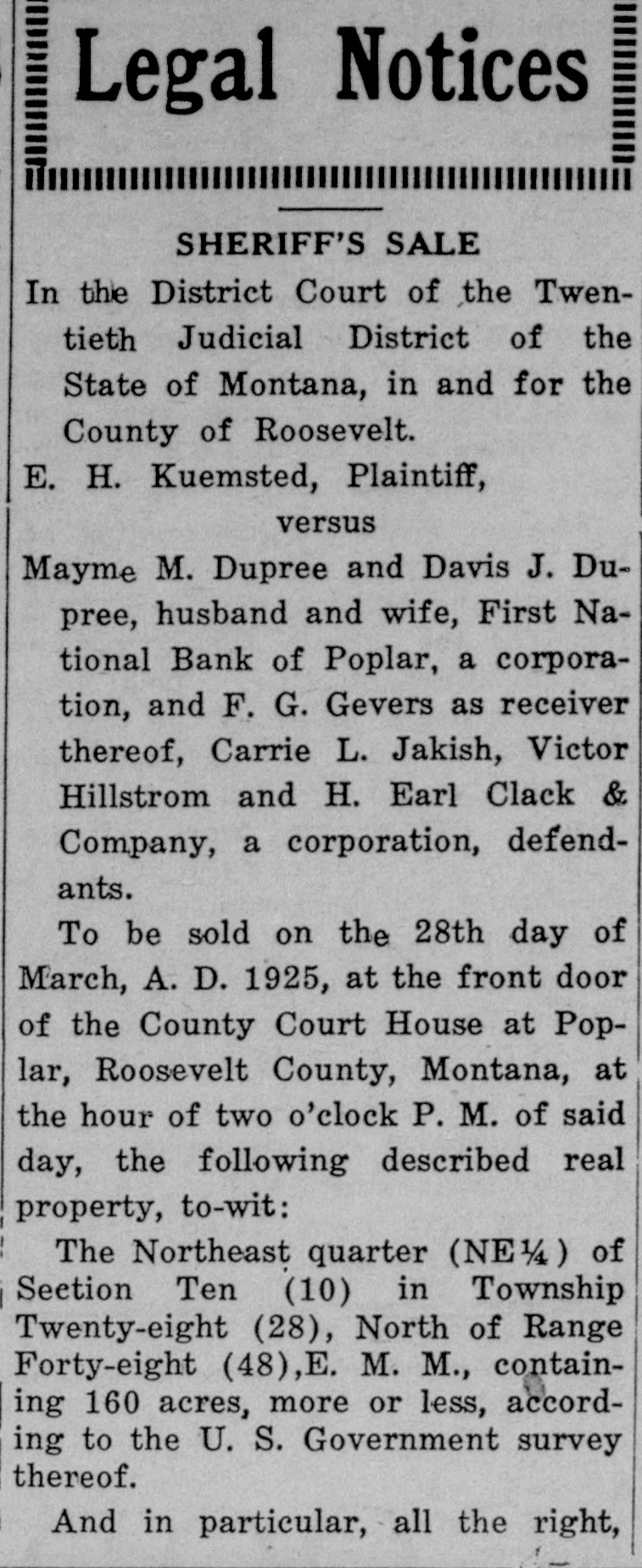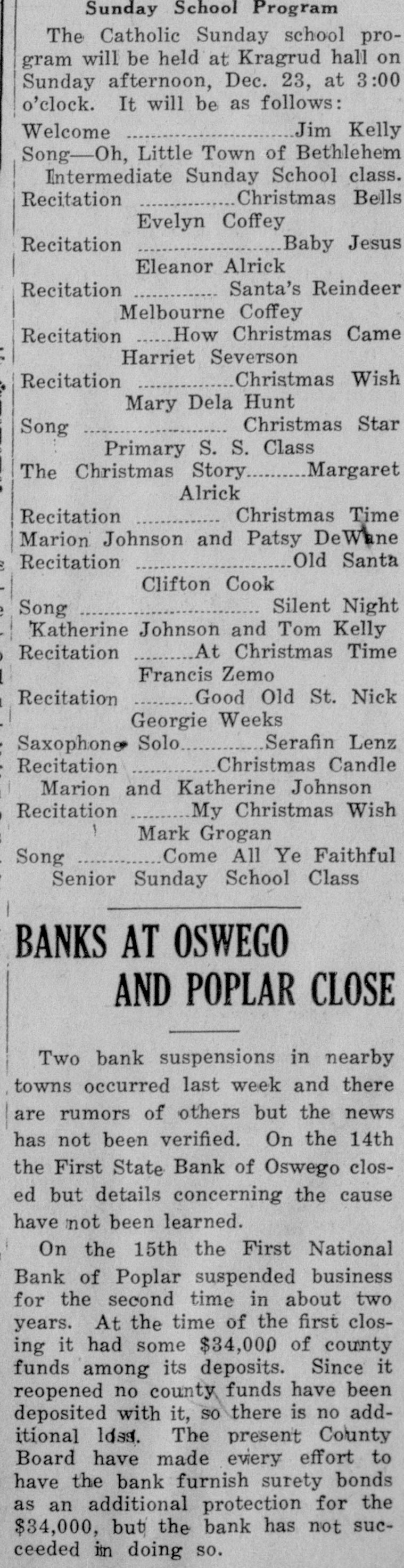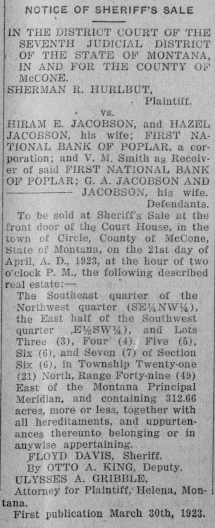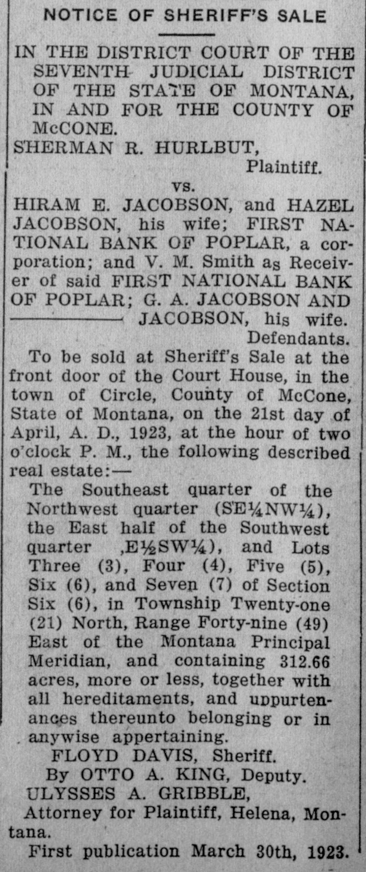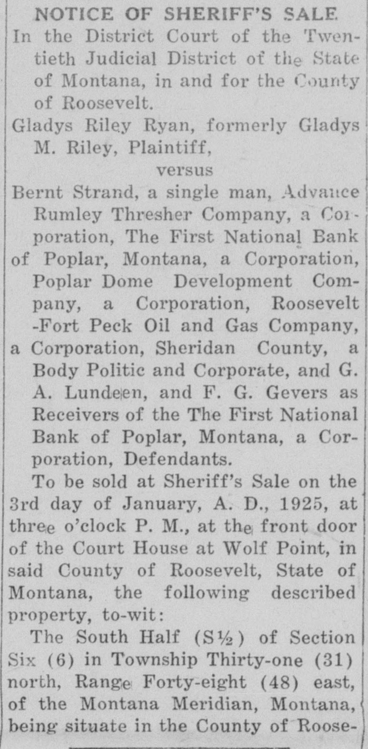 FIRST NATIONAL BANK OF POPLAR PLACED IN HANDS OF RECEIVER After being closed since October detailed checking of all the bank's 21st, pending an investigation, the paper. After his investigation had been conducted for some time the diFirst National Bank of this city was rectors and the stockholders of the yesterday placed in the hands of a bank were called in for consultation receiver by D. R. Crissinger, comptroller of the currency, says the Popand it was given out unofficially that the institution's affairs were not in a lar Standard. V. M. Smith, who has been in Poplar for over a year liquisatisfactory condition. dating the affairs of the Farmers Mr. Otto Ramstad, cashier, and Mr. W. A Vosbeck. vice president of the Mcrcantile store, has been named receiver. Mr. Smith received his apbank, retired from the active manpointment from Washington Wednesagement of the bank following the day night and took charge of the bank suspension and for some time after interests made an effort to reopen the yesterday morning. L. L. Madland, that the local stockholders and outside the national. bank examiner, who has been in charge of the bank since it bank without going through the formwas closed in October expects to leave al process of appointing a receiver. For reasons that have not been given here tonight or tomorrow. out this was found to be imposible "I cannot make any detailed stateand the action taken yesterday was ment at this time other than to say the result. that we eventually hope to work out Coming at this time the closing of a plan of reorganization," said Mr. the bank is a sad blow to the commuSmith yesterday, following his apnity and the people generally of this pointment as receiver. Mr. Smith's territory. The bank had always enappointment was anticipated by those joyed a good business and the deposwho have been in touch with the its totaled into the thousands. bank's affairs. Two weeks ago he There is no telling how long it will was given charge of the federal bank take to check the paper but Mr. Smith paper in the Poplar bank and since expects to adress himself to the task that time he has been checking it. at once and hopes to make a report Mr. Smith has had a wide experiwithin the next few months. ence in liquidating the affairs of comMr. Ramstad said yesterday that mercial concerns and during the past his immediate plans were uncertain ten years has handled some big deals but that he expected to make this of this nature. part of the country his home and would probably engage in the sheep As stated, the First National Bank business. has been closed since the 21st of last Mr. Vosbeck said two weeks ago month. It is said that the- bank acthat he had several jobs offered him tually suspended about the 7th of last month. Prior to that time Mr. Fred away from Poplar and that he also had a proposition in mind that would Williams, of the federal reserve bank keep him here, but at that time he was at Helena, came here to check the paundecided just what to do. per. held by the Montana institution Mr. Olaf Ramstad, president of the in the First National. Some time afbank, was expected to arrive from ter his arrival L. L. Madland, a federhis home in Thief River Falls, Minn. al bank examiner, arrived here and last night or this morning. together with Mr. Williams began a