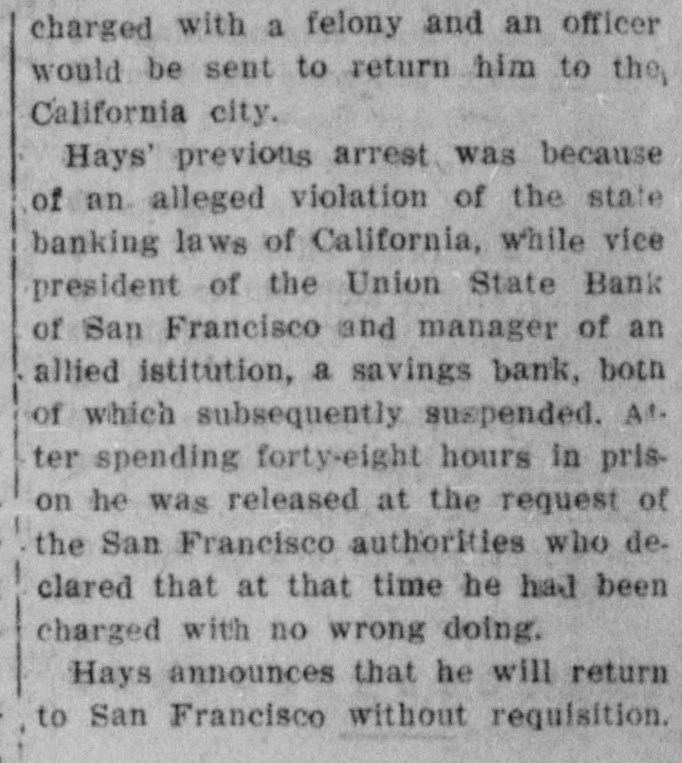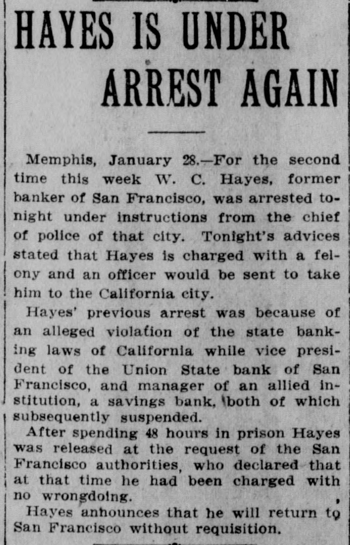 # HAYES IS UNDER # ARREST AGAIN Memphis, January 28.-For the second time this week W. C. Hayes, former banker of San Francisco, was arrested tonight under instructions from the chief of police of that city. Tonight's advices stated that Hayes is charged with a felony and an officer would be sent to take him to the California city. Hayes' previous arrest was because of an alleged violation of the state banking laws of California while vice president of the Union State bank of San Francisco, and manager of an allied institution, a savings bank, both of which subsequently suspended. After spending 48 hours in prison Hayes was released at the request of the San Francisco authorities, who declared that at that time he had been charged with no wrongdoing. Hayes announces that he will return to San Francisco without requisition.