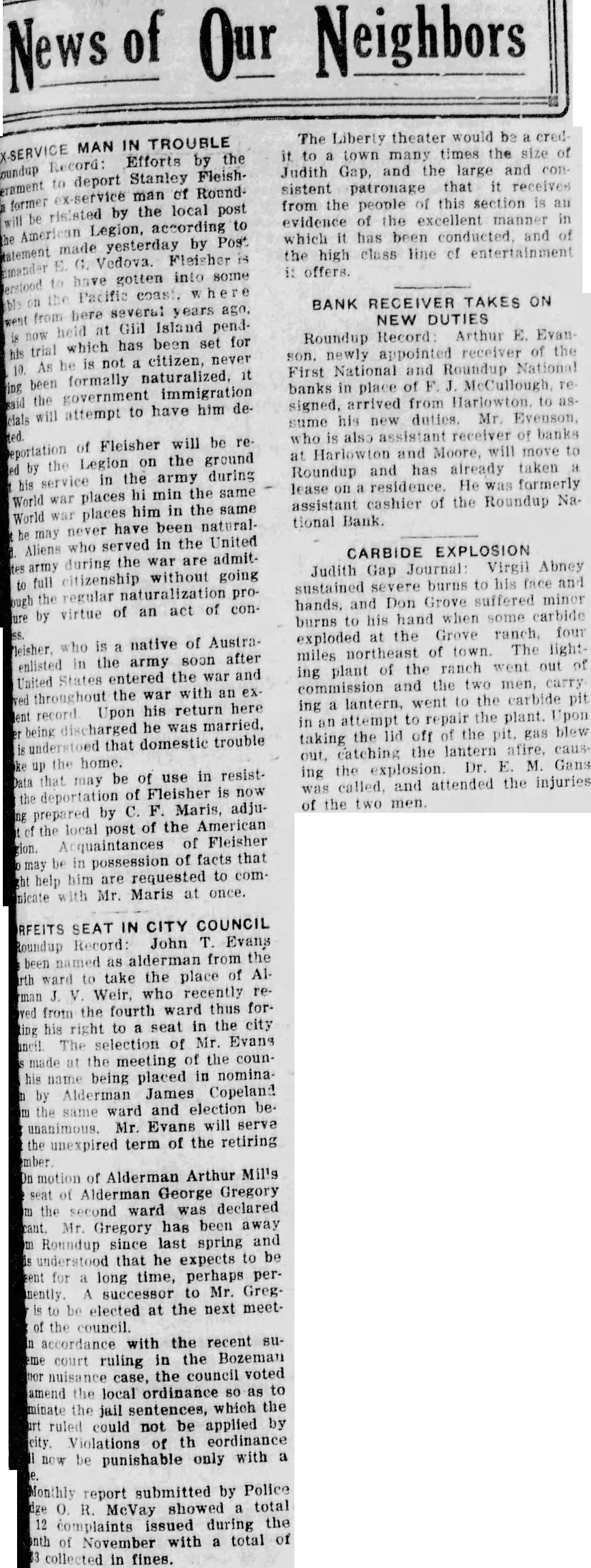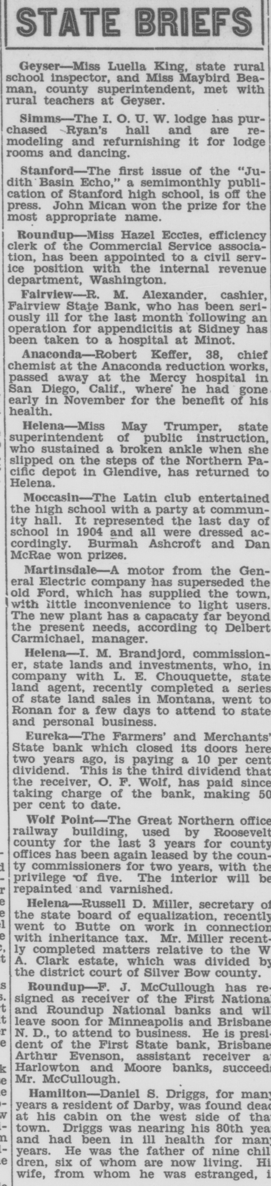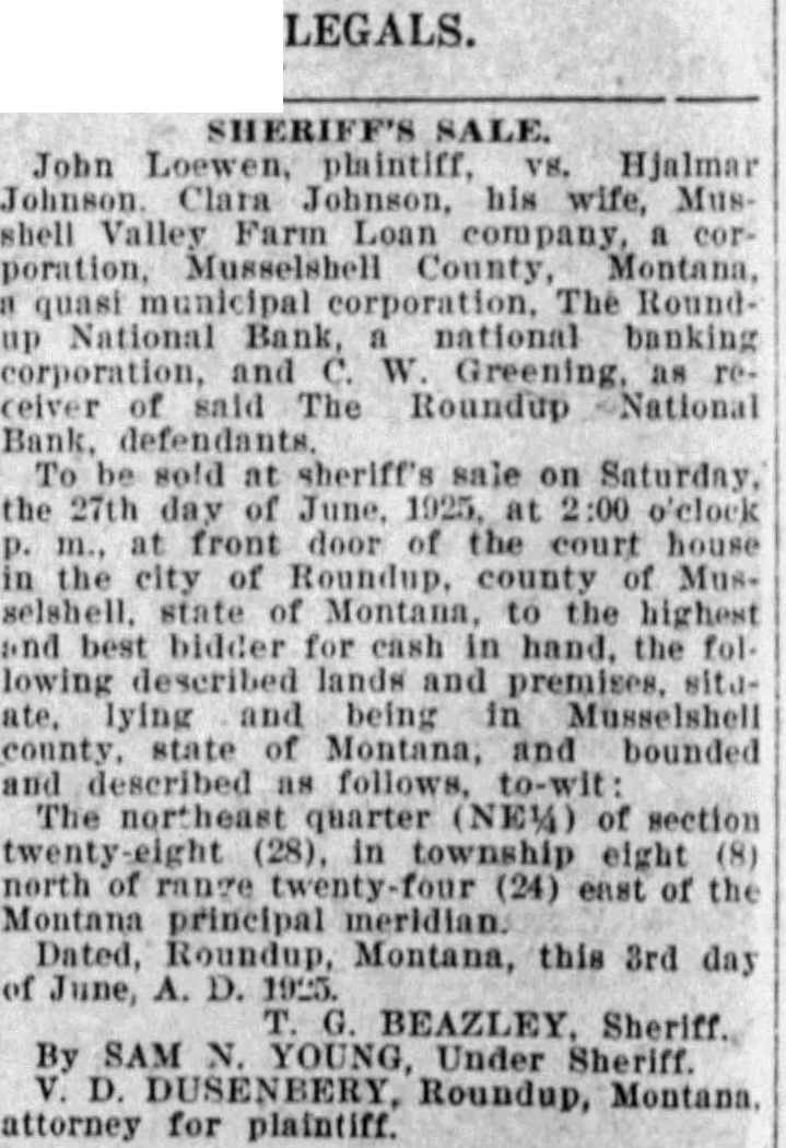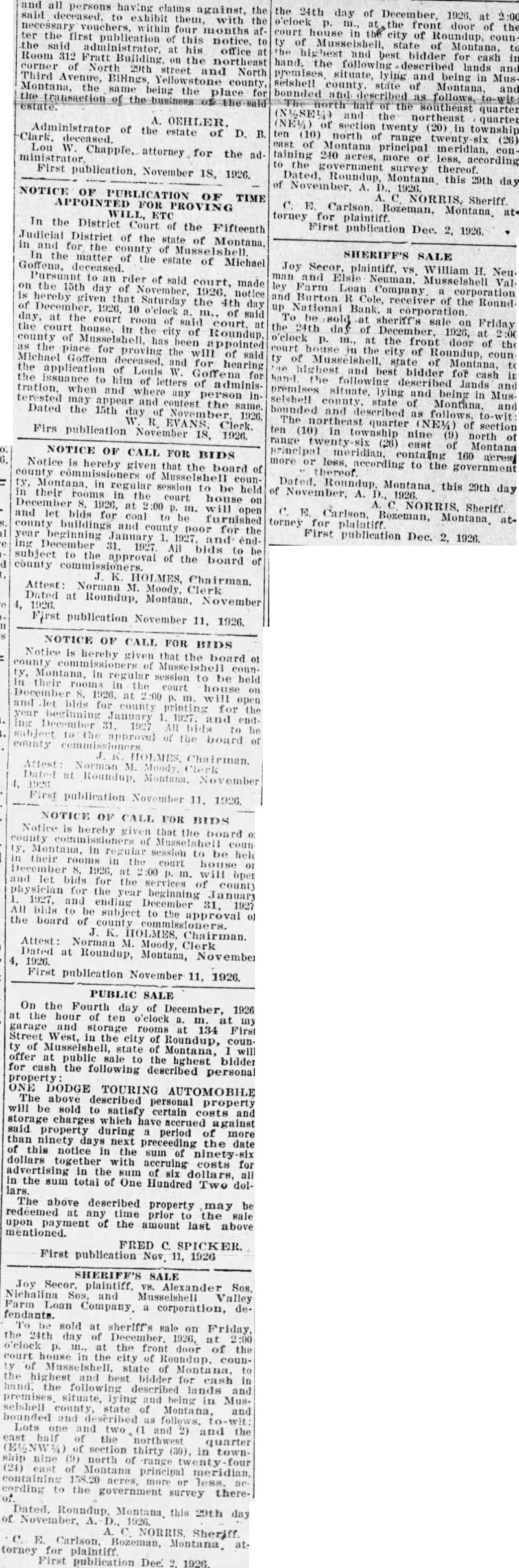 SHERIFF'S SALE Joy Secor, plaintiff, VS. William H. Neuman and Elsie Neuman, Musselshell Valley Farm Loan Company corporation, and Burton Cole, receiver of the Roundup National Bank. corporation. To be sold at sheriff's sale on Friday, the 24th day of December, 1926, at 2:00 o'clock p. m., at the front door of the court house in the city of Roundup, county of Musselshell, state of Montana. highest and best bidder for cash in to described Jands and premises situate lying and being in Musselshe!l county. state of Montana, and bounded and described as follows. to-wit: The northeast quarter (NE%) of section range ten (10) nine (9) north of principal meridian. (26) containg east of 160 Montana acres more or thereof. less, according to the government of Dated. November. Roundup. A. Montana, 1926. this 29th day torney C. E. for Carlson plaintiff Bozeman, NORRIS. Montana. Sheriff atFirst publication Dec. 2, 1926.