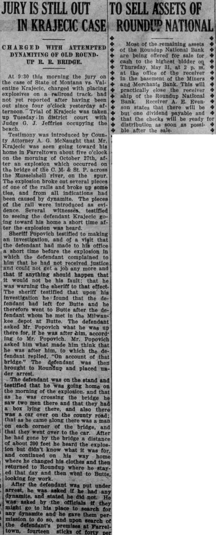 SHERIFF'S SALE Joy Secor. plaintiff. VR. Alexander Sos Nichalina Sos, and Musselshell Valley fendants. Farm Loan Company. a corporation, desold at sheriff's sale on Friday, the 24th day of December. 1926, at 2:00 o'clock m., at the front door of the court house in the city of Roundup counof state of Montana, the highest and best bidder for cash in hand. the following described lands and premises situate, lying and being in Musselshell county, state of Montana, and bounded and described as follows, Lots one and two and 2) and the east half of the northwest quarter of section thirty (30), in township nine (9) north of range four (24) east of Montana principal meridian containing 158.20 acres, more or less. of cording to the government survey there-