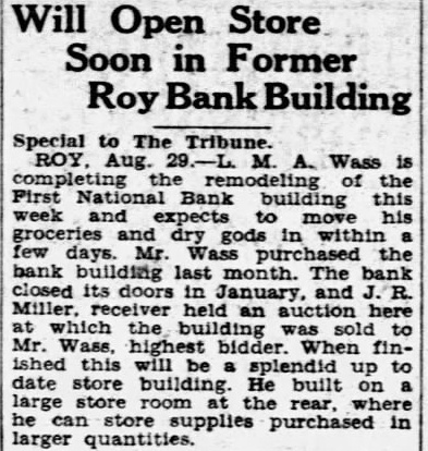 Will Open Store Soon in Former Roy Bank Building Special to The Tribune. ROY, Aug. 29.-L M. A. Wass is completing the remodeling of the First National Bank building this week and expects to move his groceries and dry gods in within few days. Mr. purchased the bank building last month. The bank closed its doors in January, and Miller. receiver held an auction here at which the building was sold to Mr. Wass, highest bidder. When finished this will be splendid up to date store building. He built on large store room at the rear, where he store supplies purchased in larger quantities.