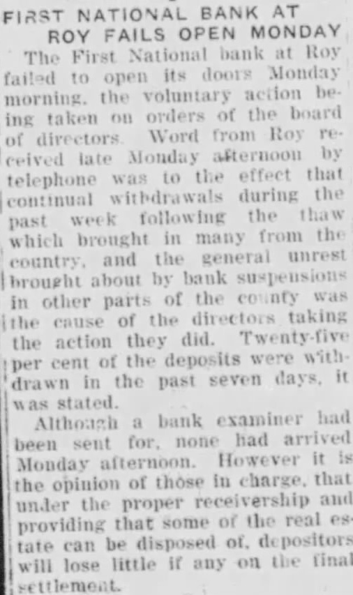 FIRST NATIONAL BANK AT ROY FAILS OPEN MONDAY The First National bank at Roy failed to open its doors Monday morning. the voluntary action being taken on orders of the board of directors Word from Roy received late Monday afternoon by telephone was to the effect that continual withdrawals during the past week following the thaw which brought in many from the country. and the general unrest brought about by bank suspensions in other parts of the county was the cause of the directors taking the action they did. Twenty five per cent of the deposits were with drawn in the past seven days, it was stated. Although a bank examiner had been sent for, none had arrived Monday afternoon. However it is the opinion of those in charge. that under the proper receivership and providing that some of the real es tate can be disposed of, depositors will lose little if any on the final settlement.
